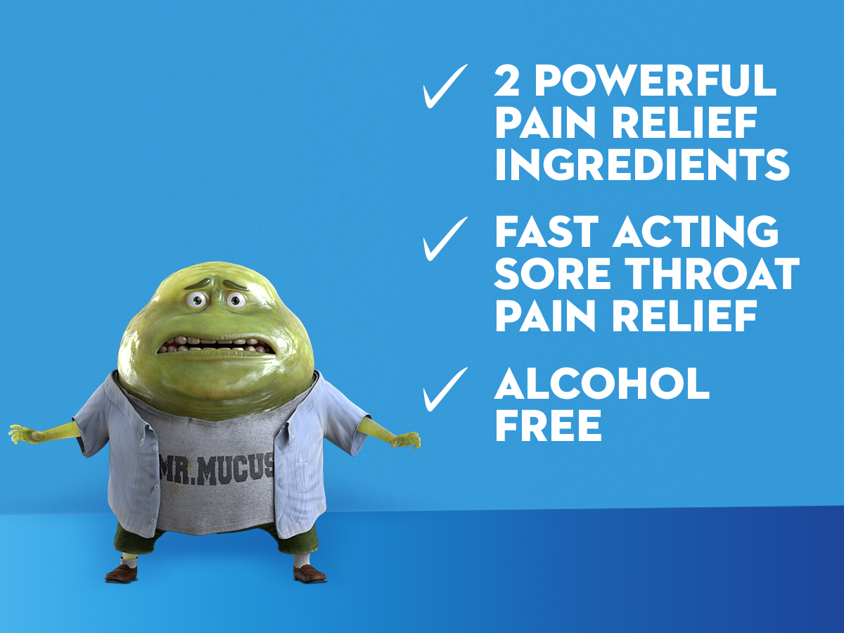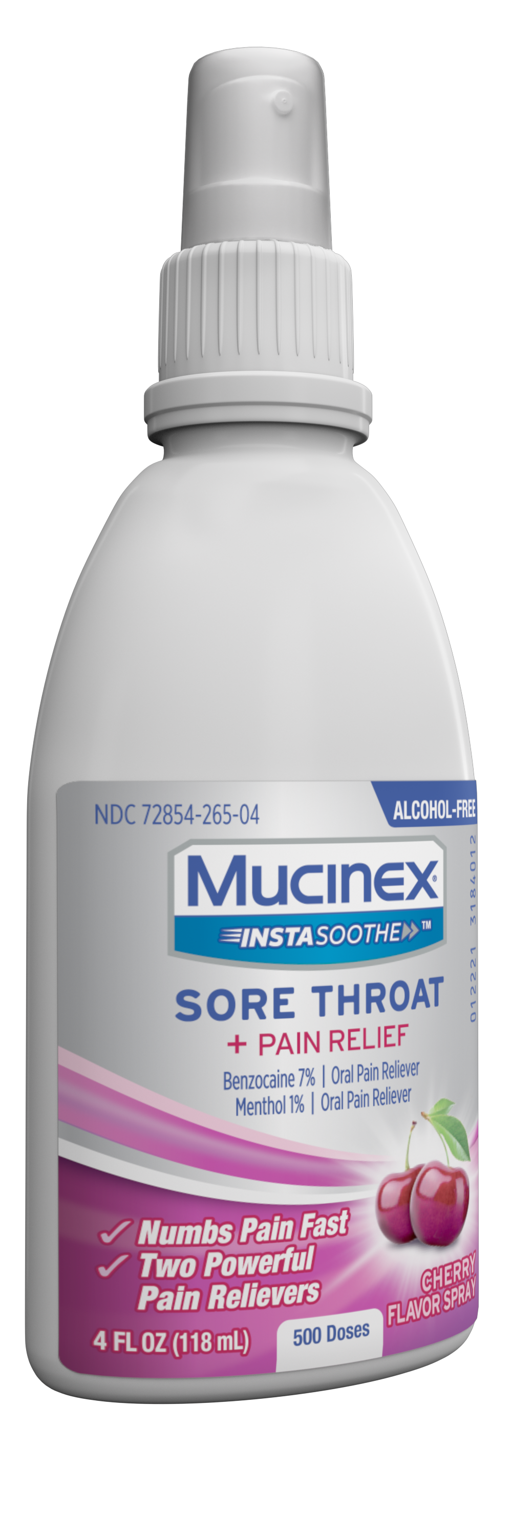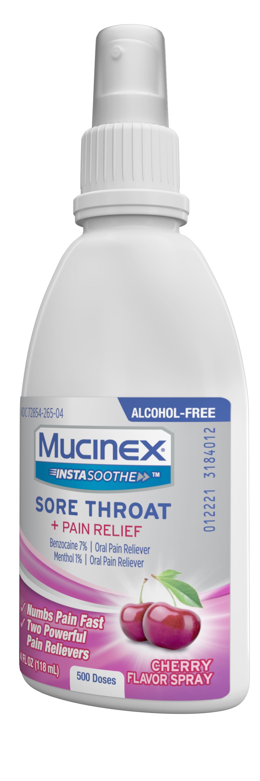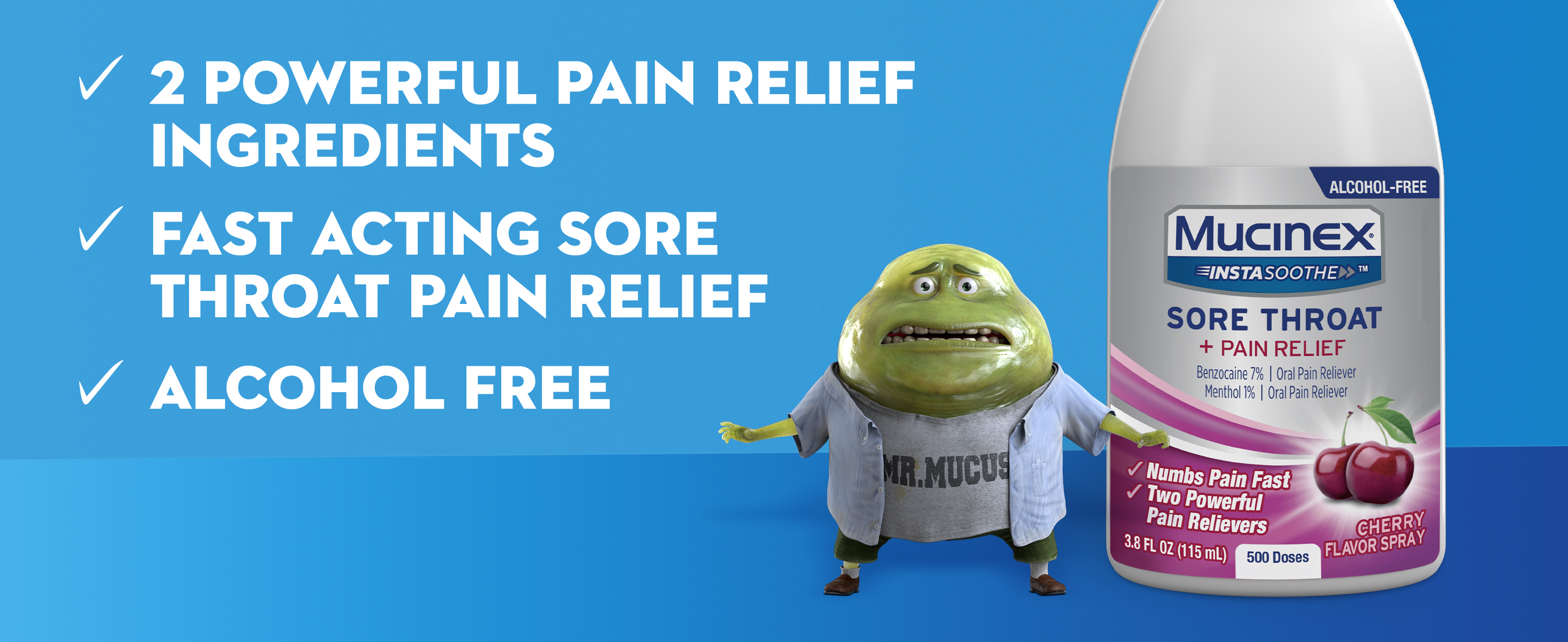 - SORE THROAT RELIEF SPRAY: Mucinex Instasoothe Sore Throat Spray numbs pain fast with two powerful pain relievers: Benzocaine (7%) and Menthol (1%); The cherry flavor spray provides sore throat relief that starts working on contact