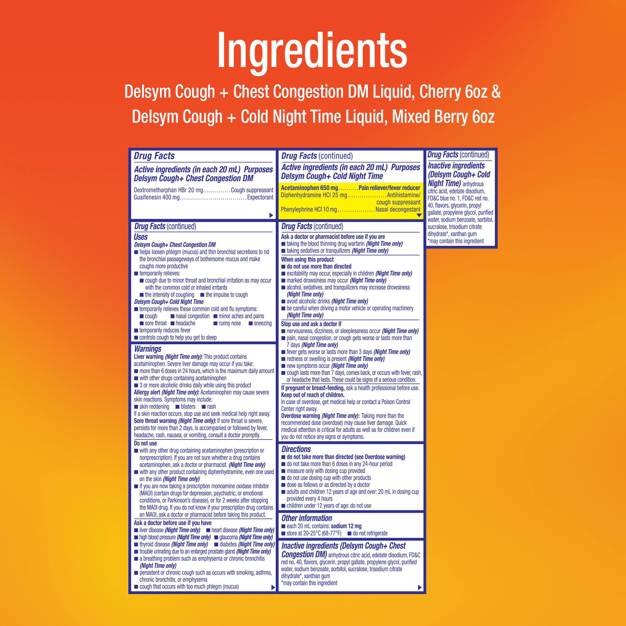 - ACTIVE INGREDIENTS IN NIGHT TIME LIQUID: Contains Acetaminophen to relieve body aches and reduce fever, Diphenhydramine HCI that is a Antihistamine and a cough suppressant and Phenylephrine HCI which is a nasal decongestant
