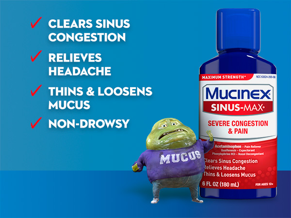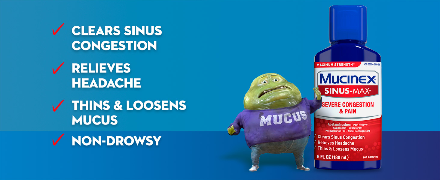 - MAXIMUM STRENGTH RELIEF: Maximum Strength Mucinex Sinus-Max Severe Congestion & Pain helps relieve pain, headache, nasal congestion, sinus congestion and chest congestion.