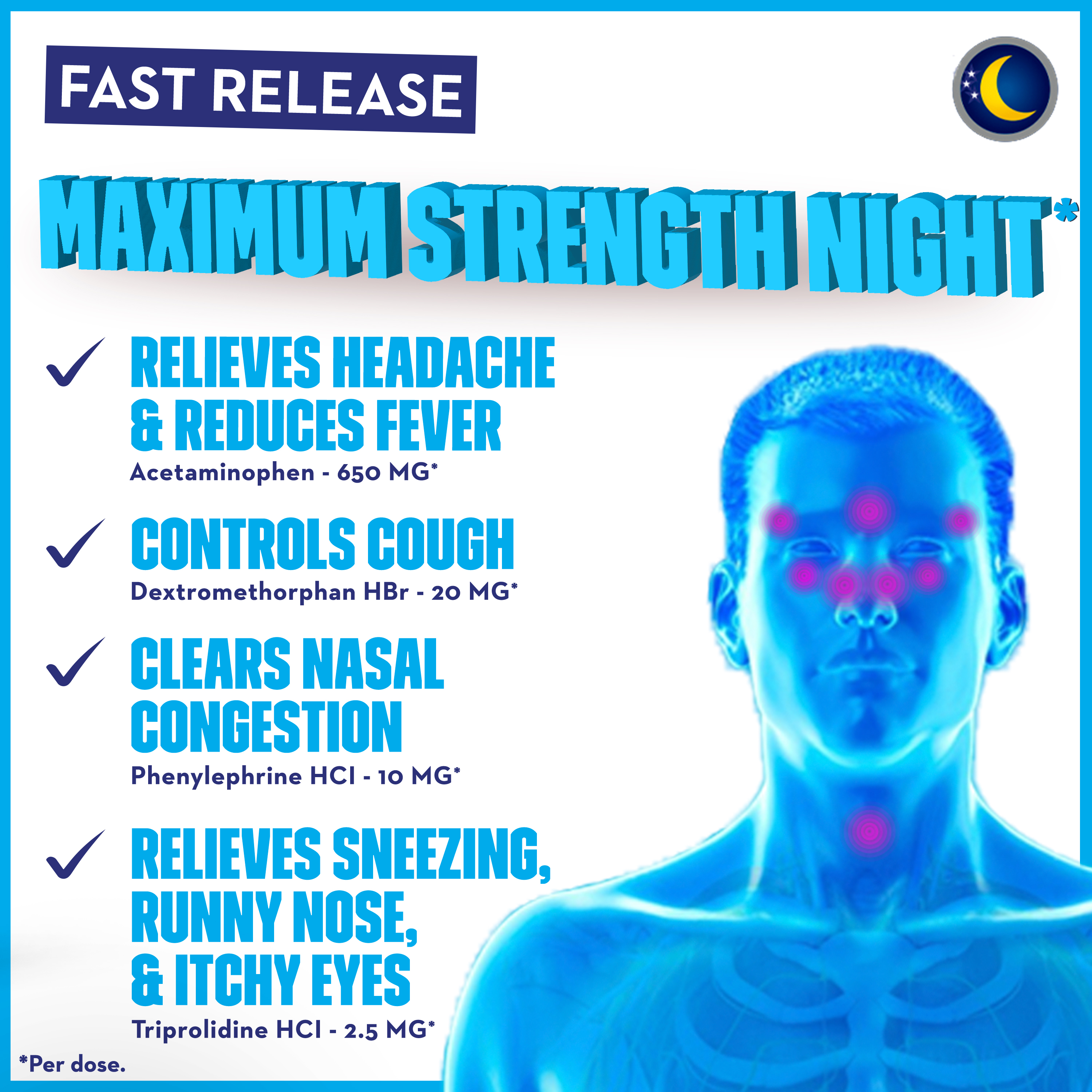 - NIGHT TIME ACTIVE INGREDIENTS PER CAPLET: Contains Acetaminophen - Pain reliever and Fever reducer; Dextromethorphan HBr - Cough Suppressant; Phenylephrine HCI - Nasal Decongestant; Triprolidine HCI - Antihistamine