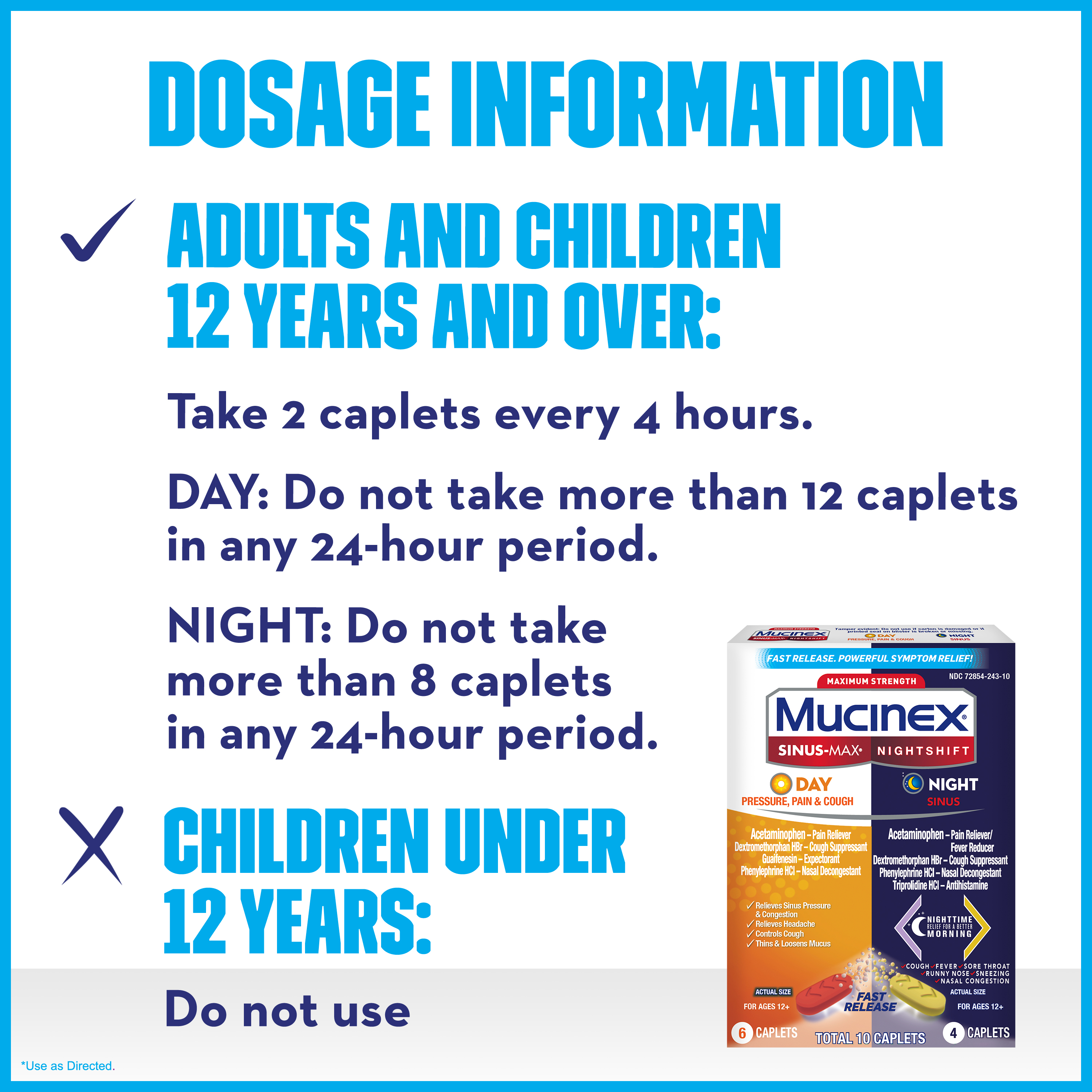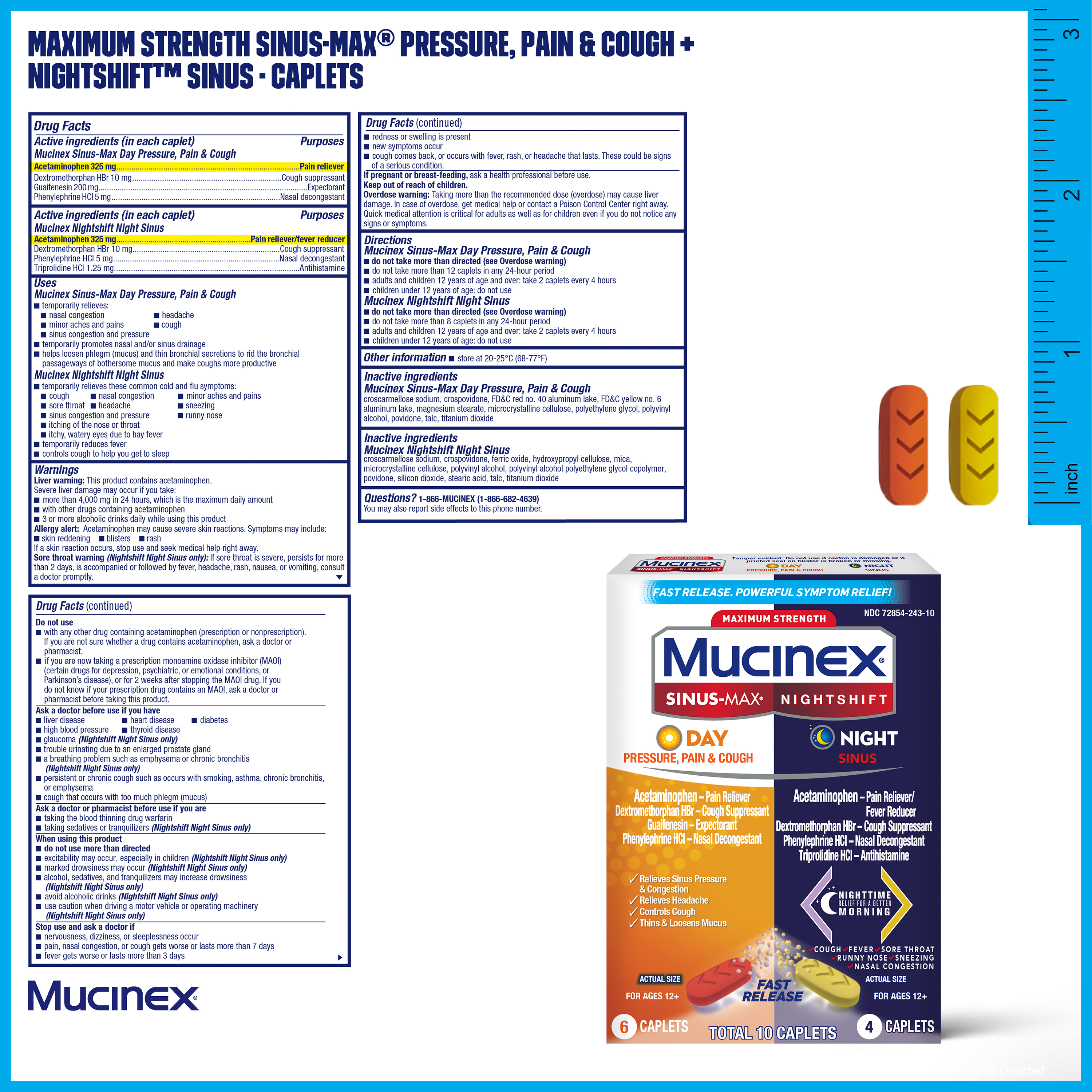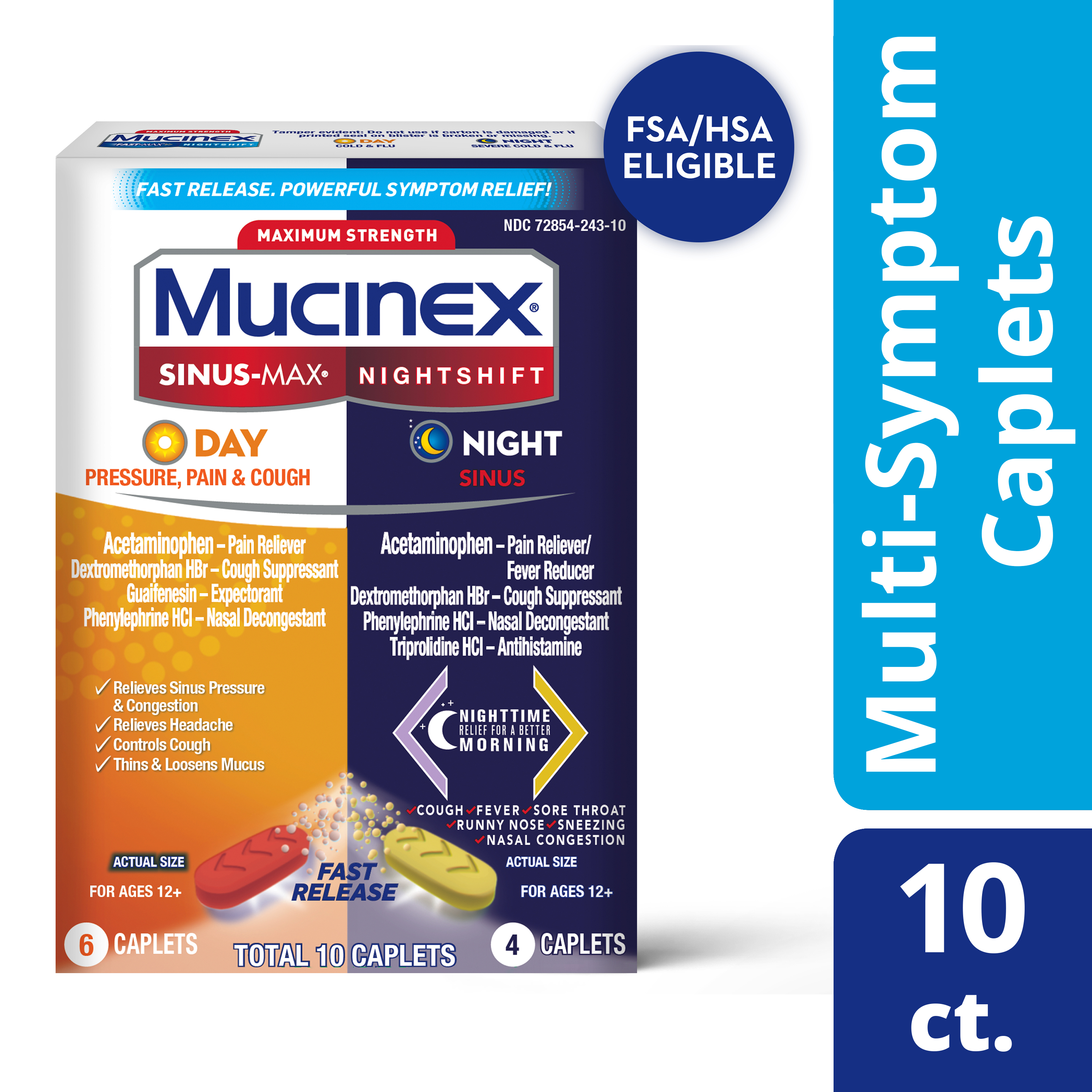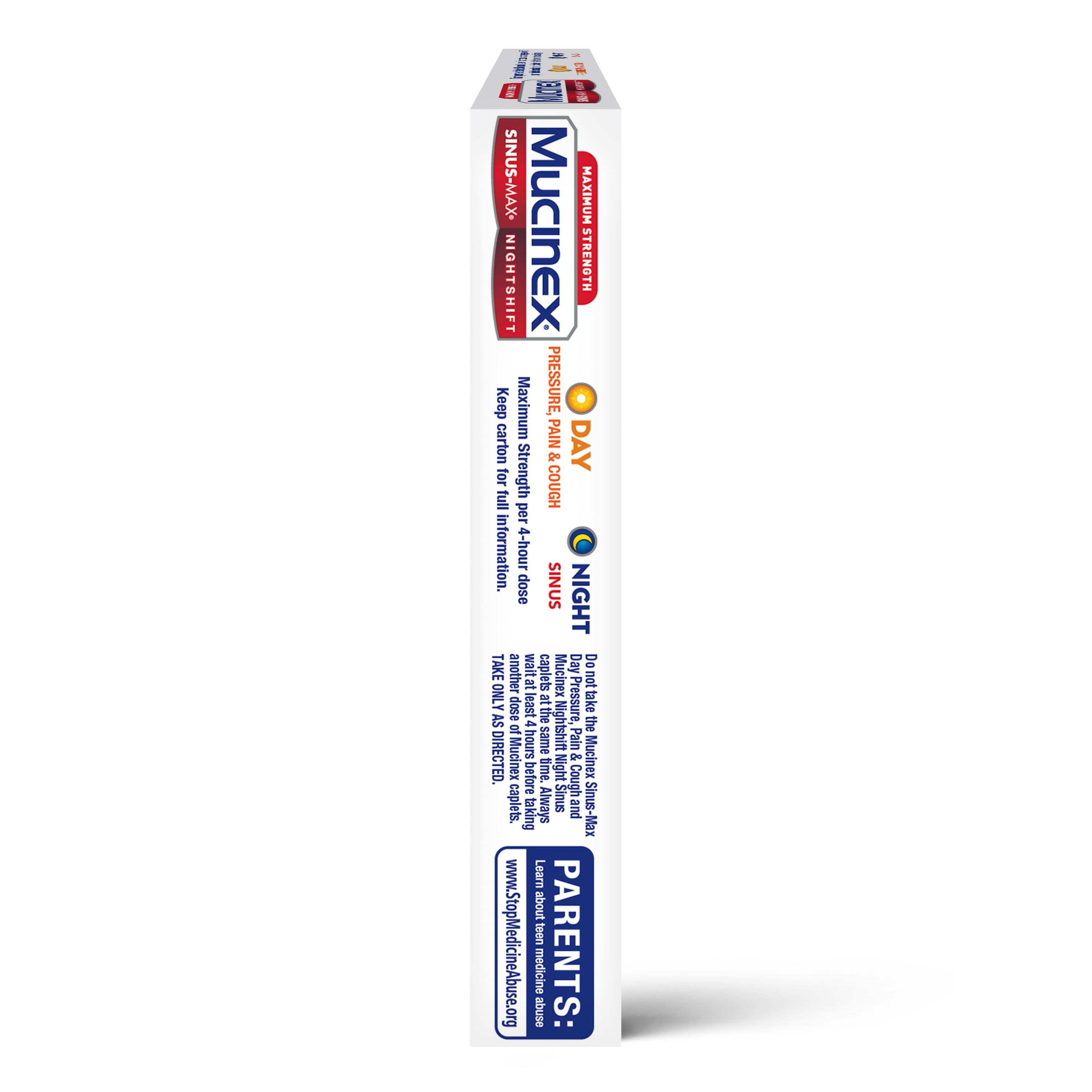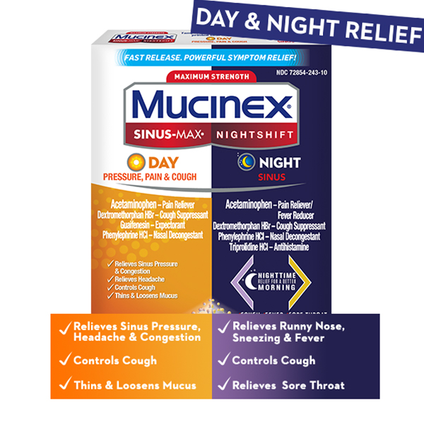 - MAXIMUM STRENGTH MUCINEX SINUS-MAX (Day) PRESSURE, PAIN & COUGH & NIGHTSHIFT (Night) SINUS: Fast Release, Powerful Multi-Symptom Relief medicine. Get back to what’s important thanks to the fast, powerful medicine.