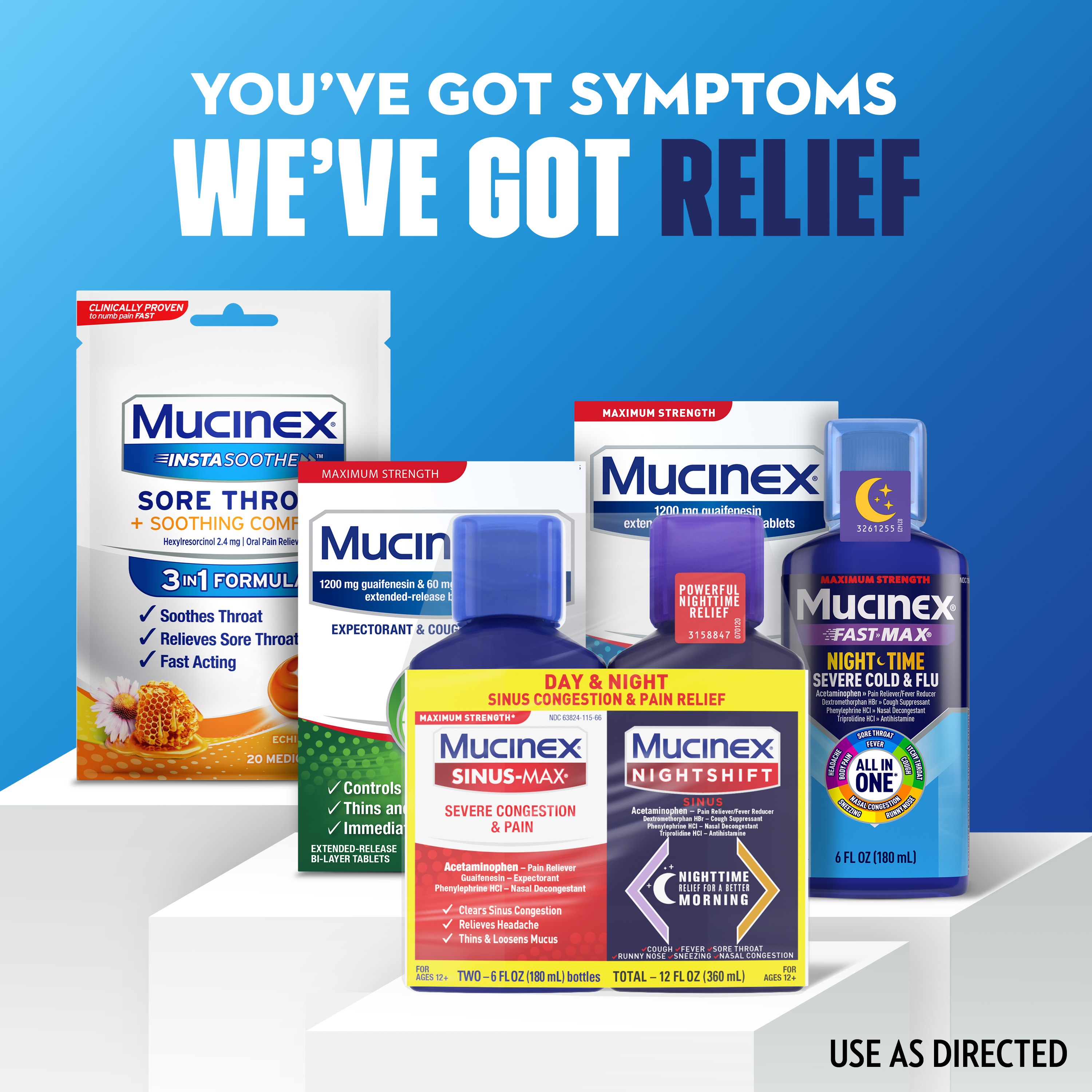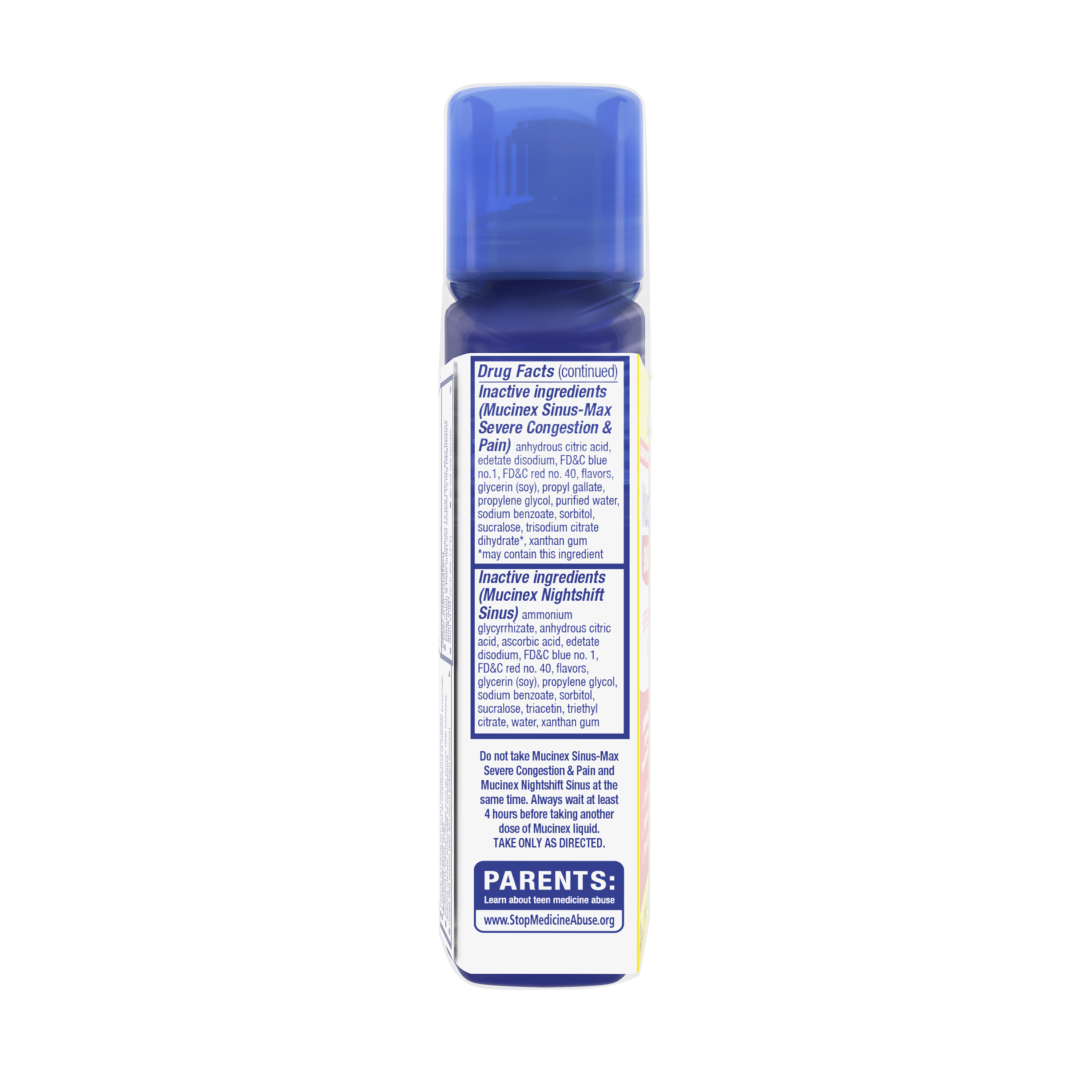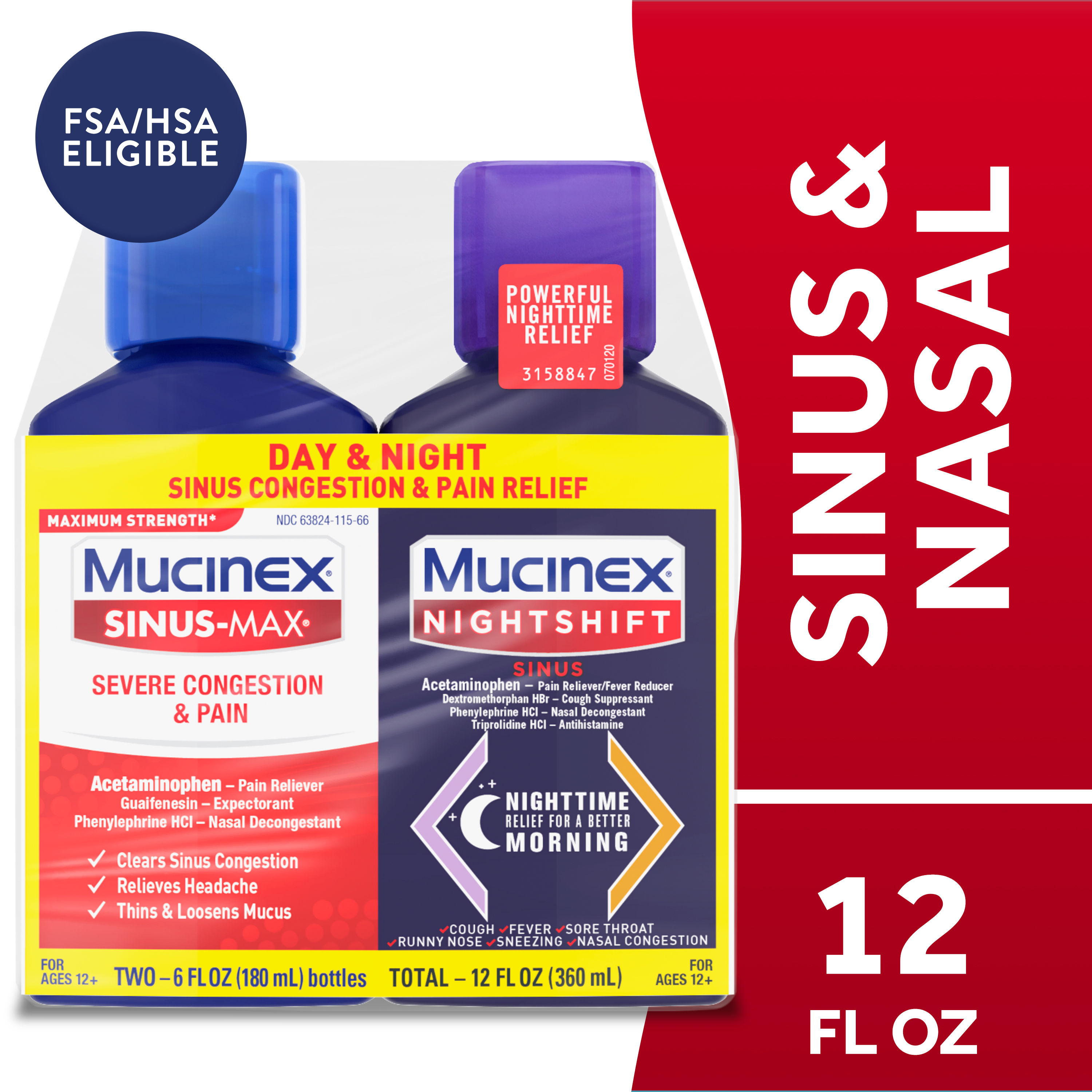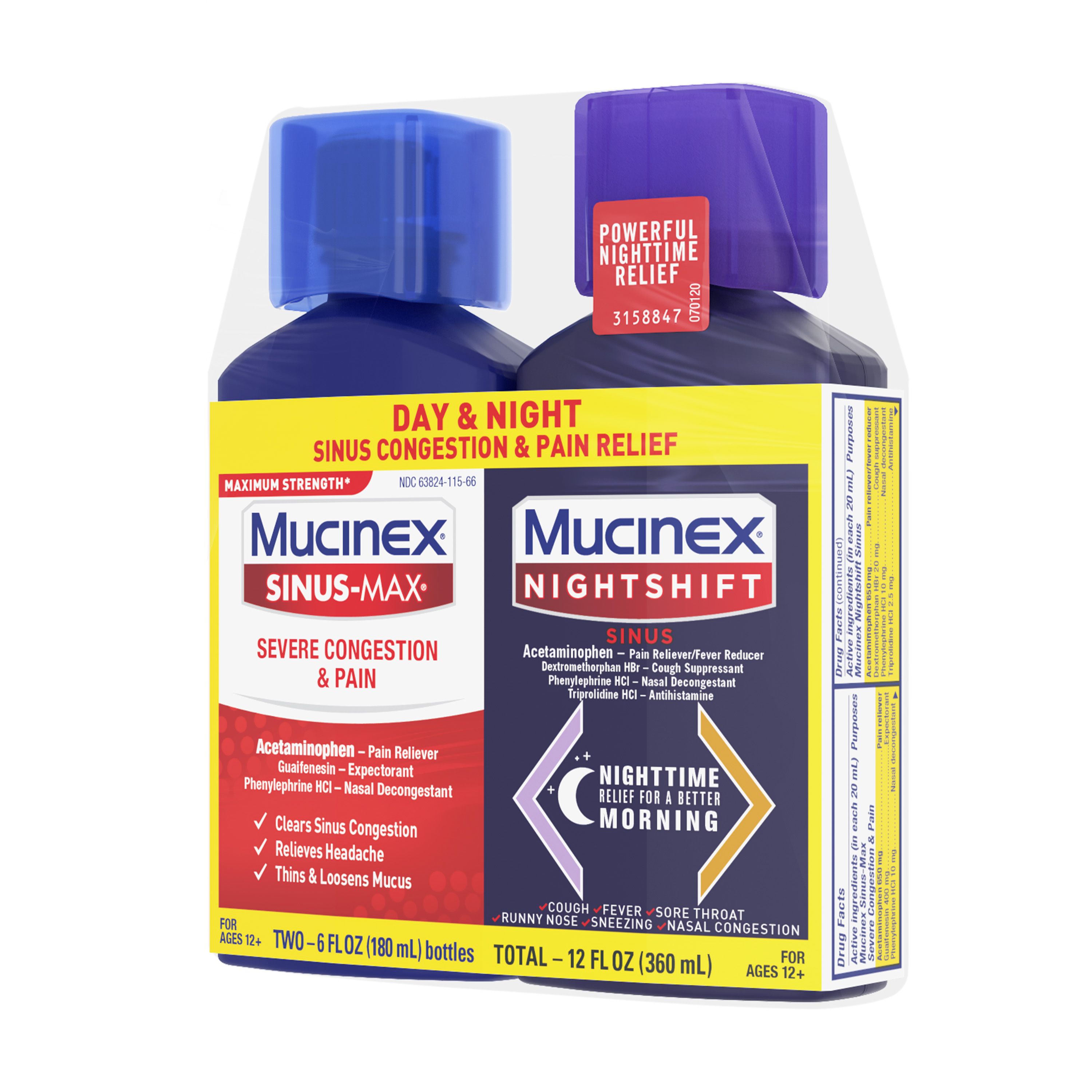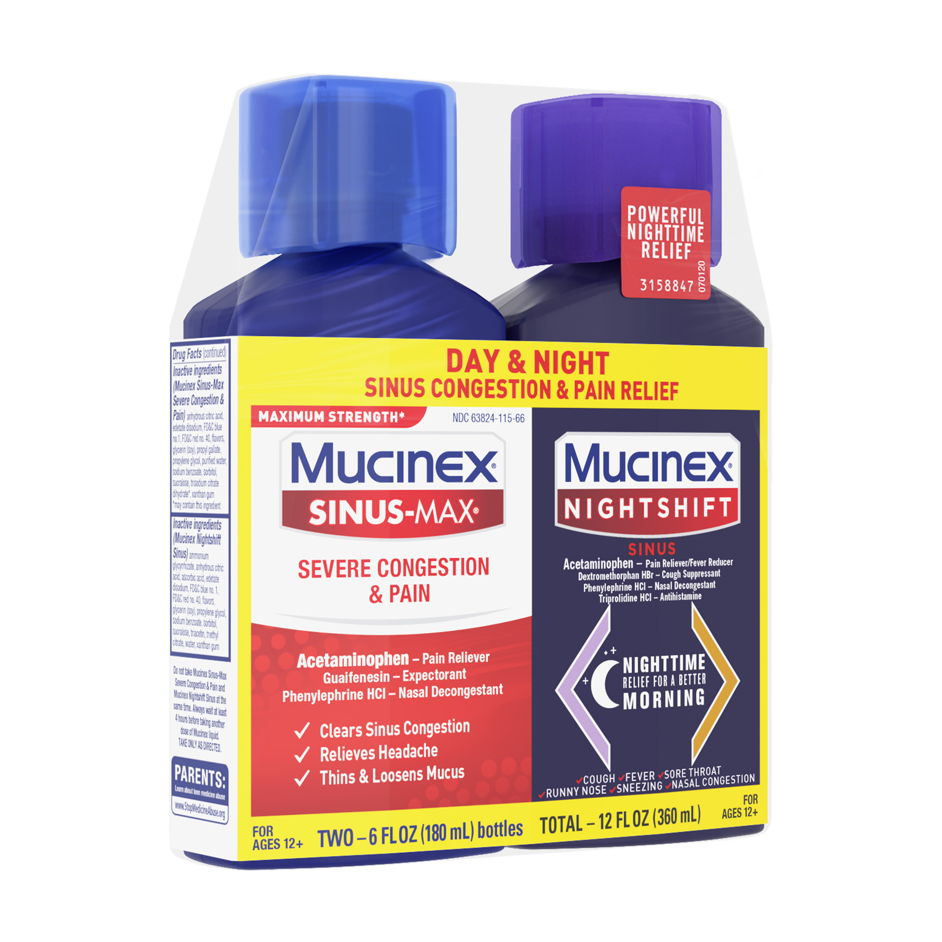 - POWERFUL MULTI-SYMPTOM RELIEF: This combo pack of Maximum Strength Mucinex Sinus-Max Severe Congestion & Pain and Mucinex Nightshift Sinus provides powerful multi-symptom relief for your worst sinus congestion symptoms
