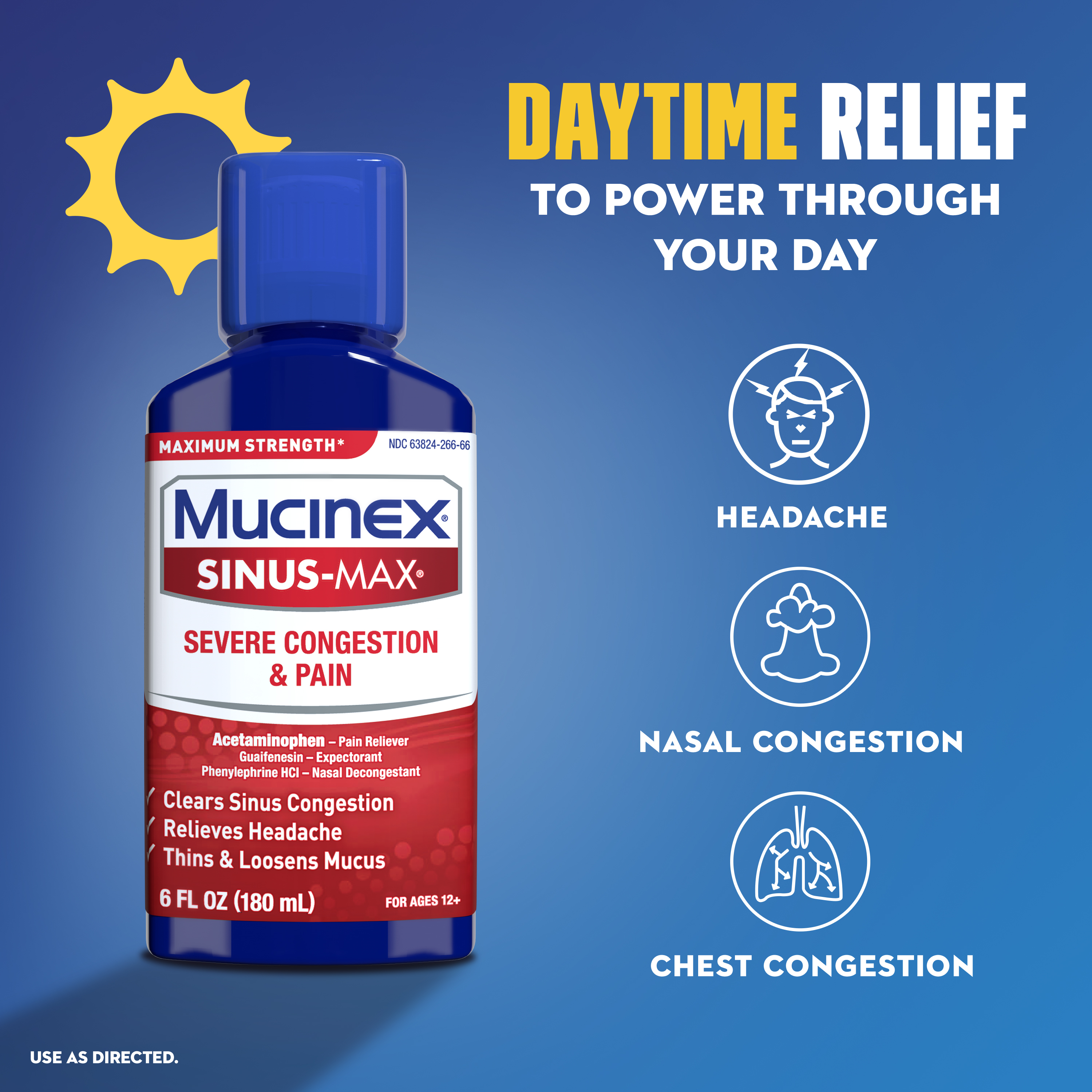 - SEVERE CONGESTION & PAIN SYMPTOM RELIEF: Maximum Strength Mucinex Sinus-Max Severe Congestion & Pain helps relieve headache, sinus congestion and thin & loosen mucus
