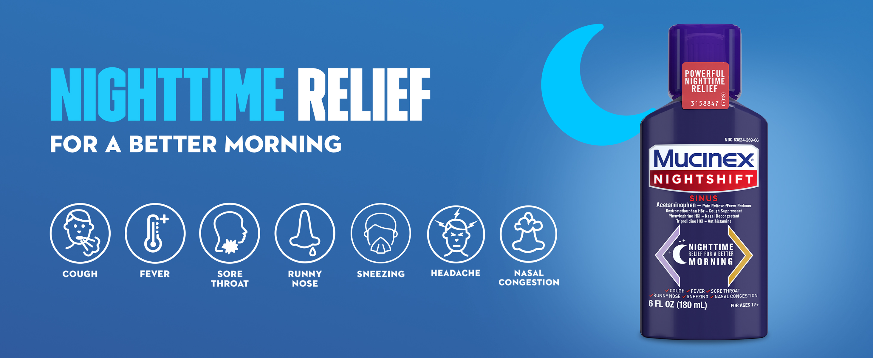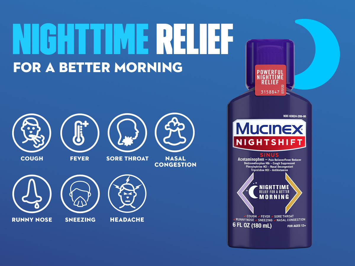 - SINUS SYMPTOM NIGHT RELIEF: Mucinex Nightshift Sinus reduces fever, relieves sore throat, runny nose, sneezing, nasal congestion, and controls cough
