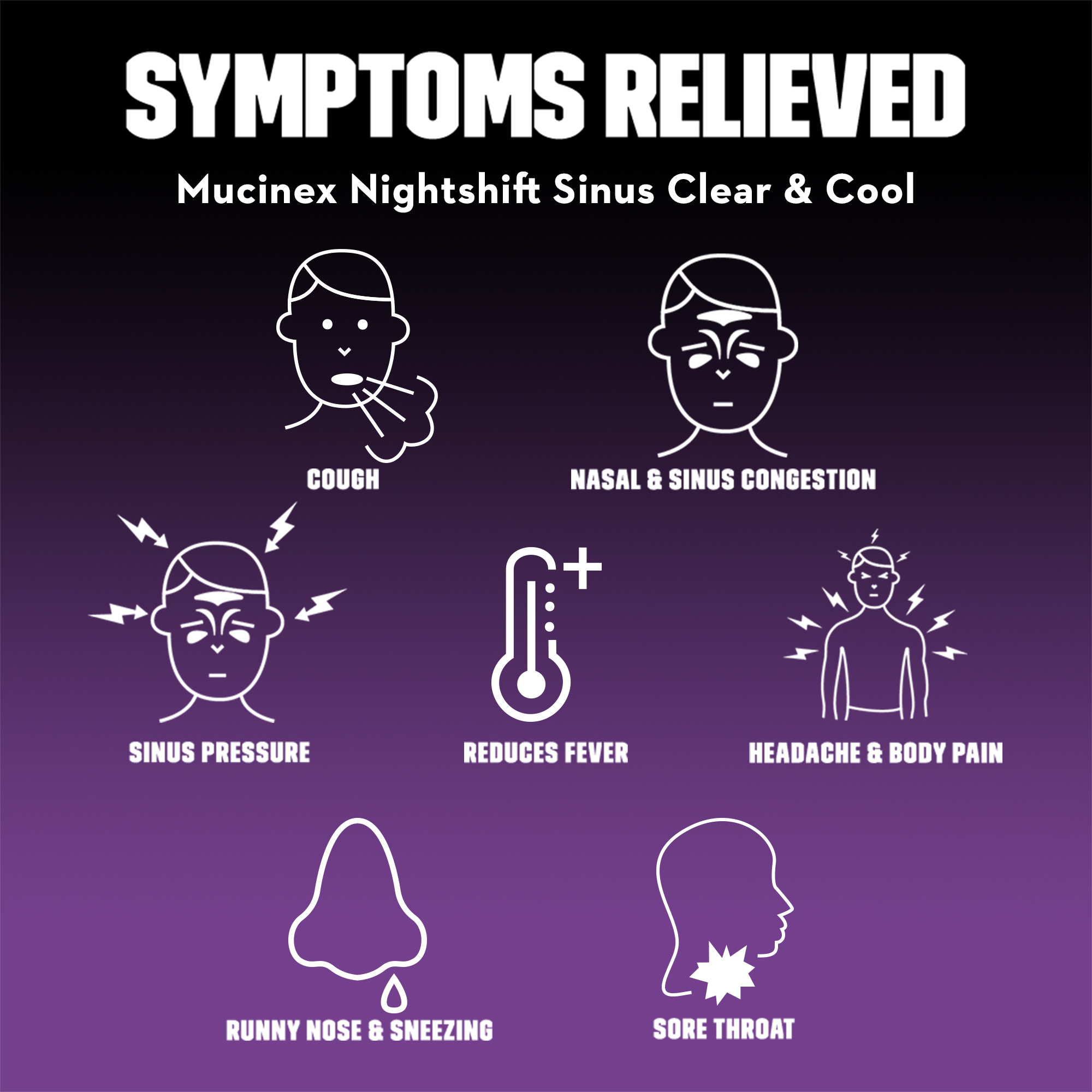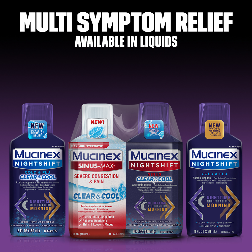 - SINUS SYMPTOM NIGHT RELIEF: Mucinex Nightshift Sinus Clear & Cool reduces fever, relieves Sore Throat, Runny Nose, Sneezing, Nasal Congestion, and Controls Cough
