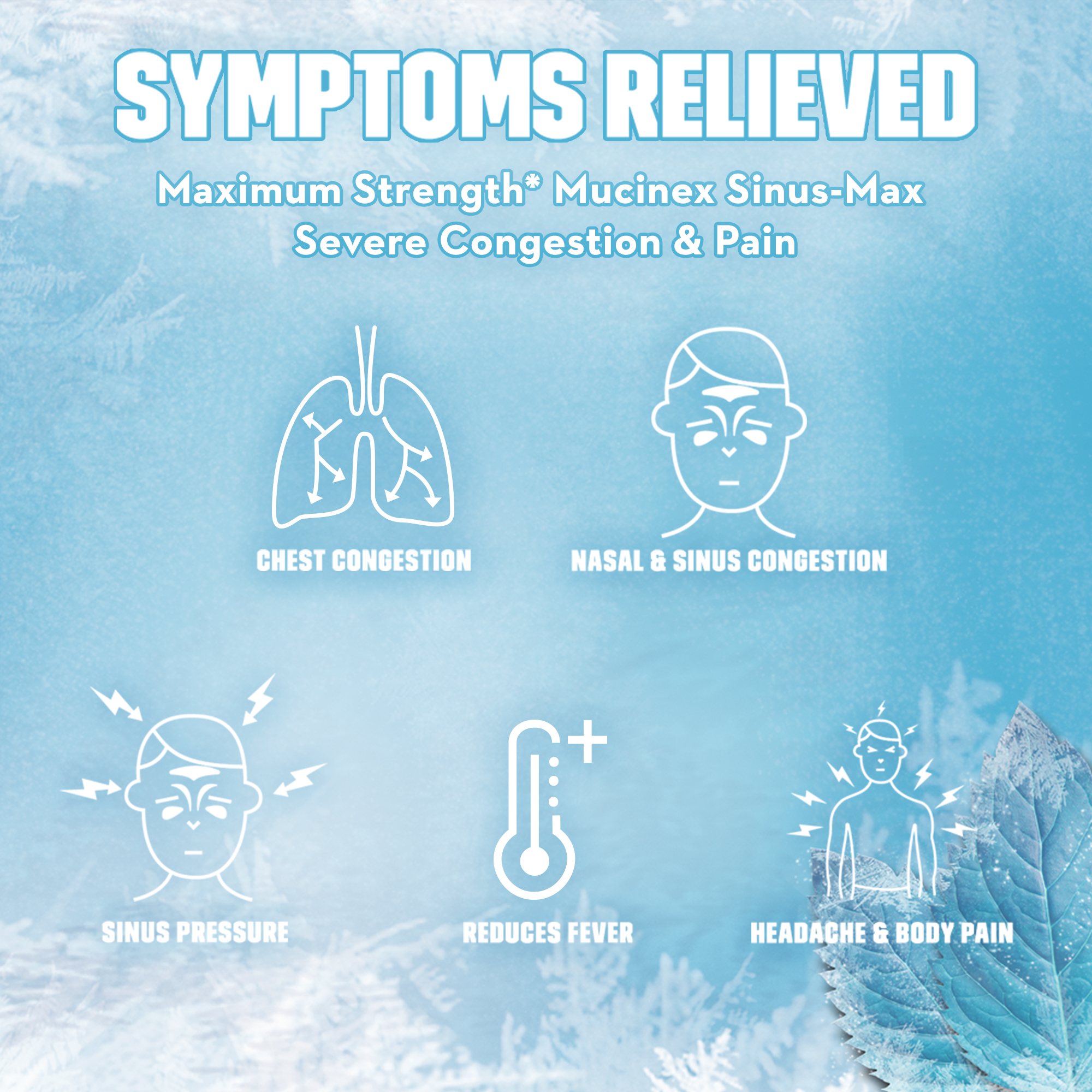 - SEVERE CONGESTION & PAIN SYMPTOM RELIEF: Maximum Strength Mucinex Sinus-Max Severe Congestion & Pain helps relieve headache, Sinus Congestion and Thin & Loosen Mucus