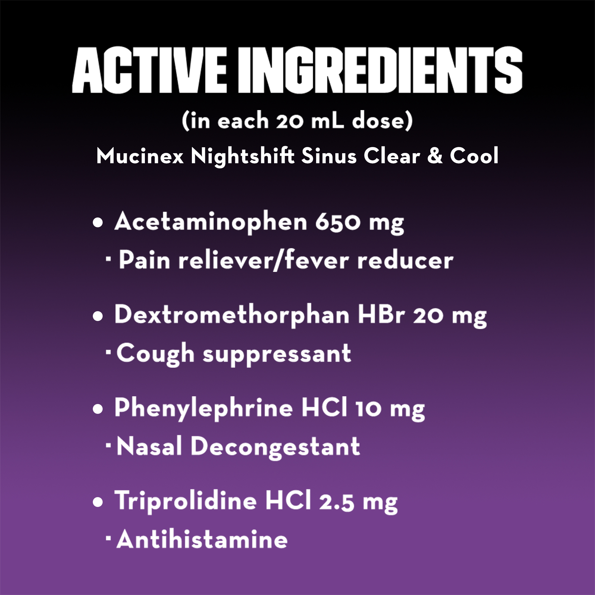 - MUCINEX NIGHTSHIFT SINUS ACTIVE INGREDIENTS: Contains Acetaminophen - Pain reliever and fever reducer; Dextromethorphan HBr - Cough suppressant; Phenylephrine HCI - Nasal decongestant; Triprolidine HCl – Antihistamine