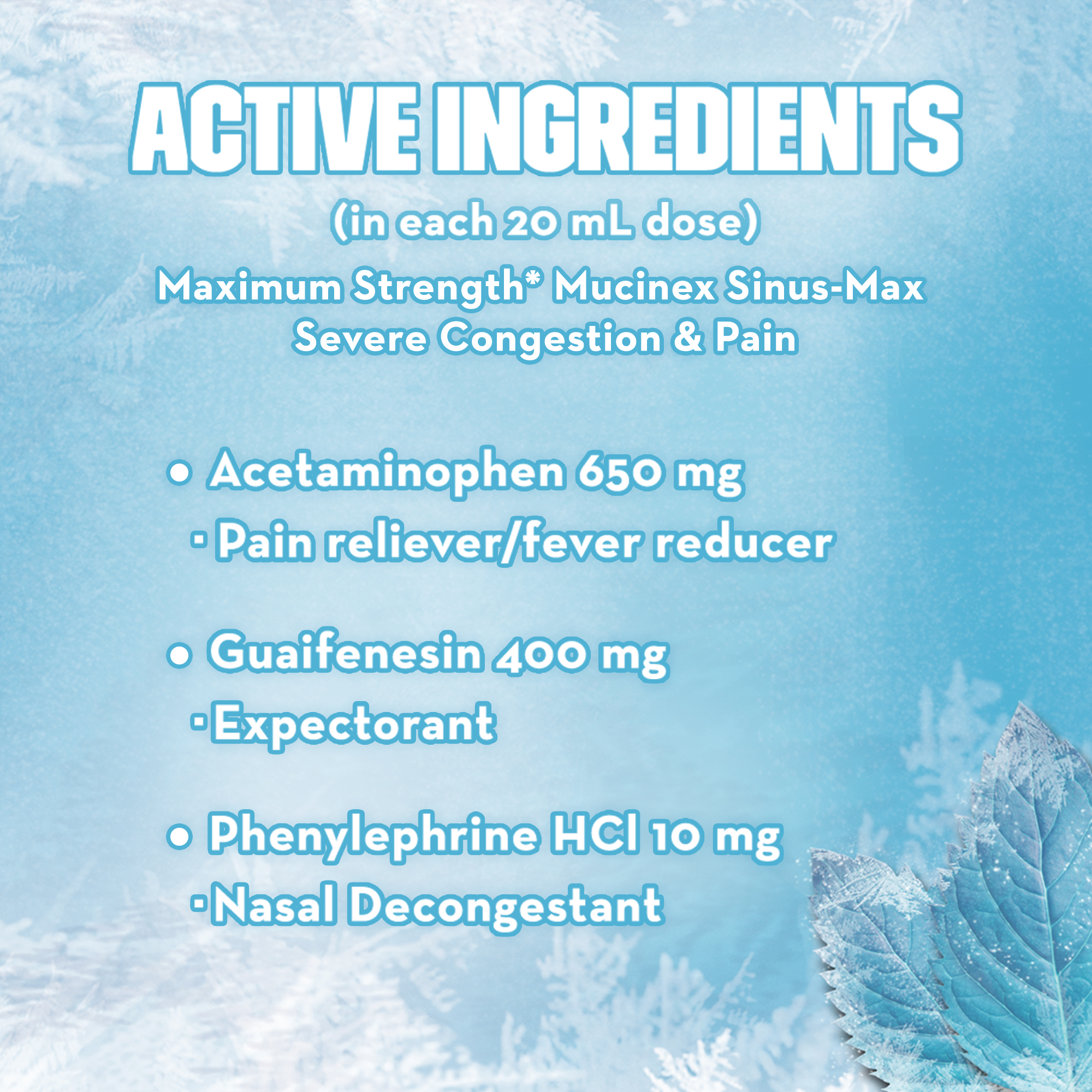 - MUCINEX SINUS-MAX SEVERE CONGESTION & PAIN ACTIVE INGREDIENTS: Contains Acetaminophen - Pain reliever; Guaifenesin - Expectorant; Phenylephrine HCI - Nasal decongestant