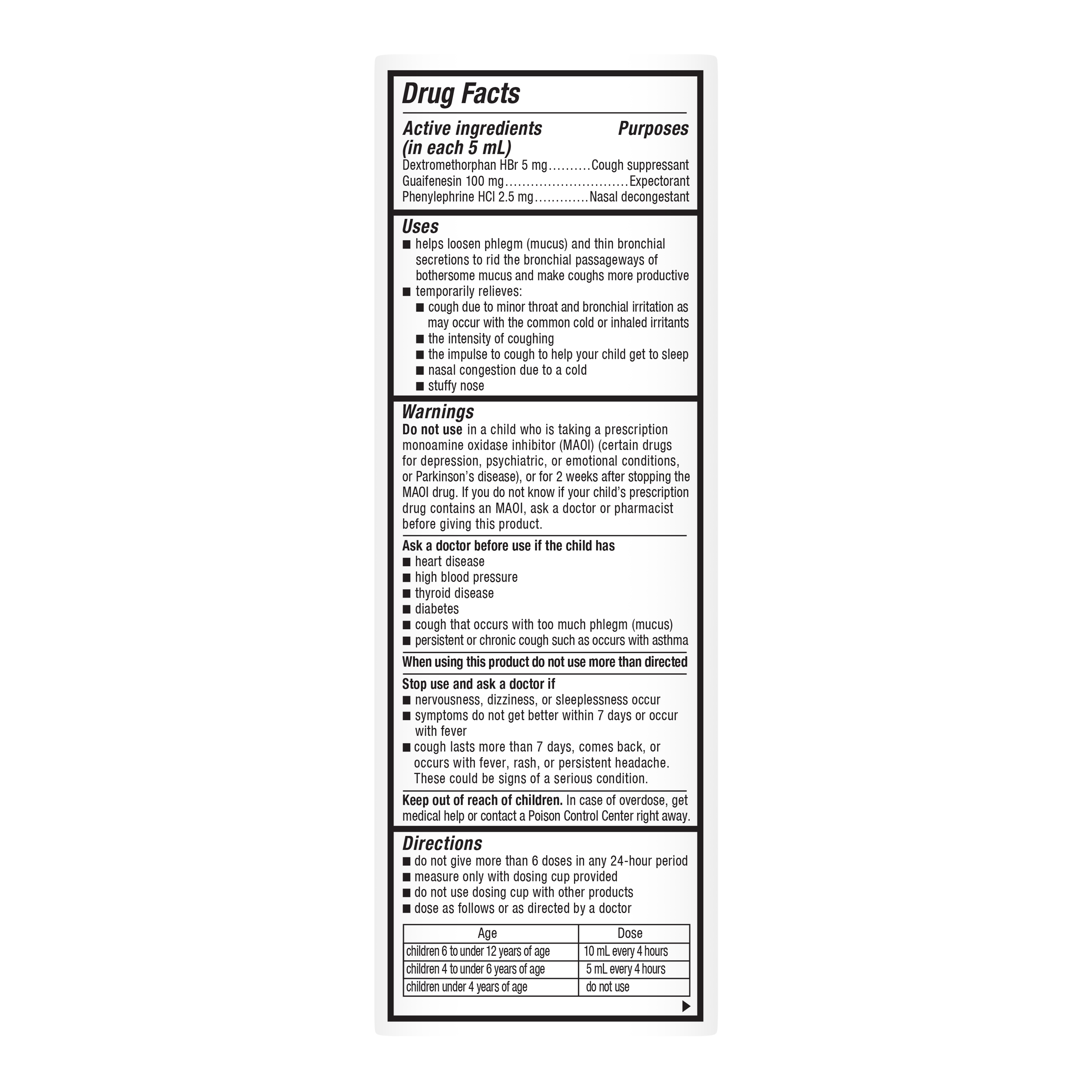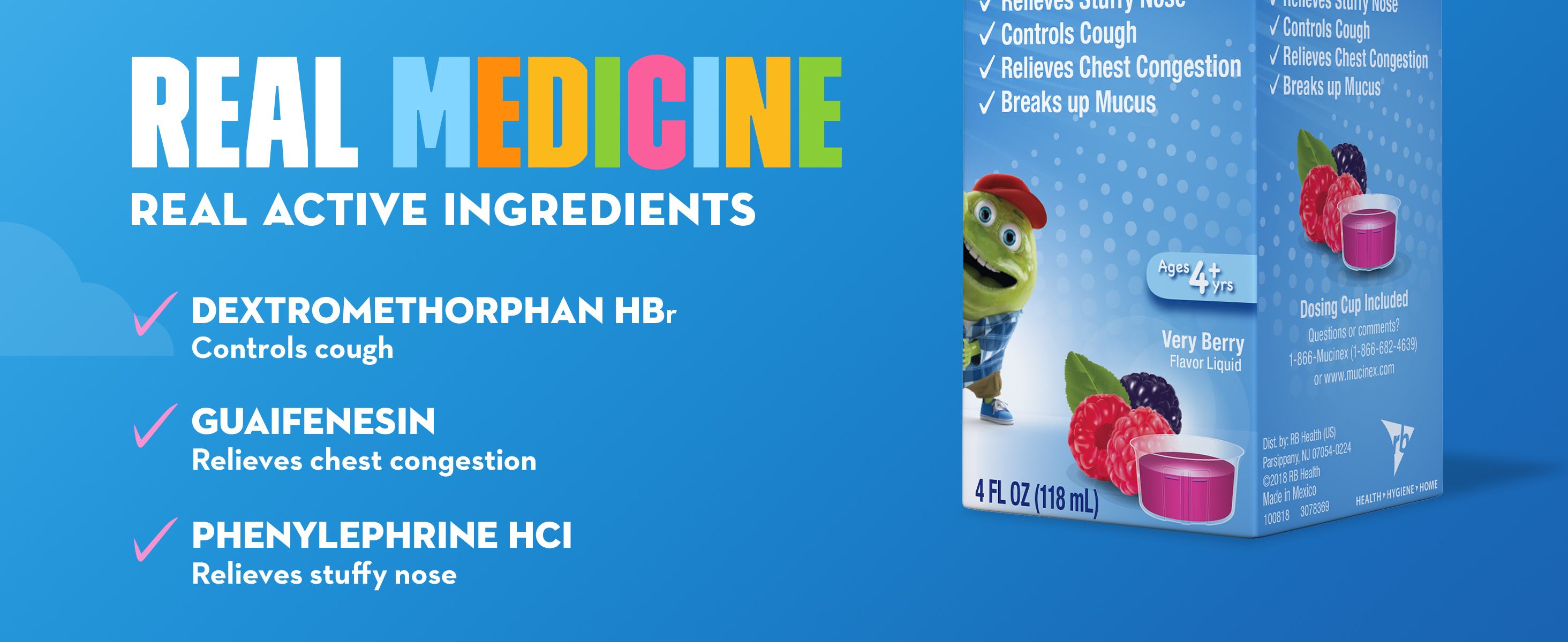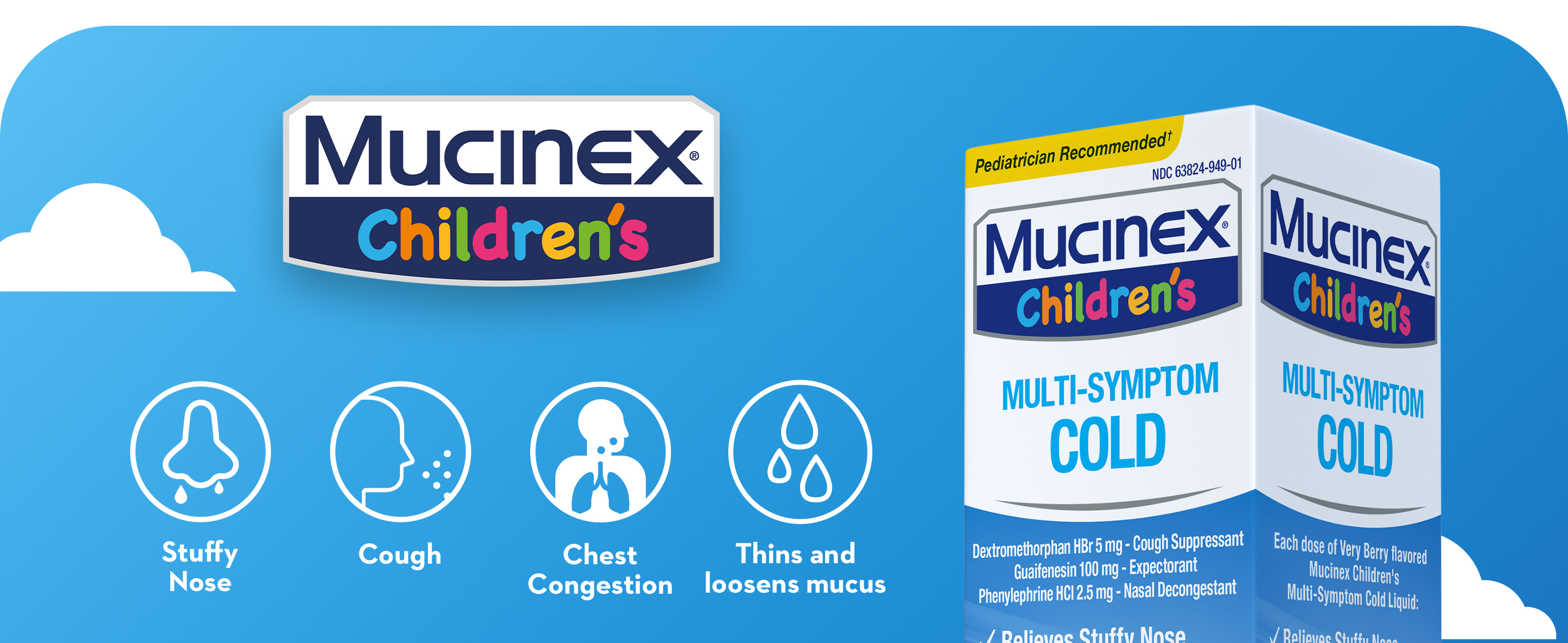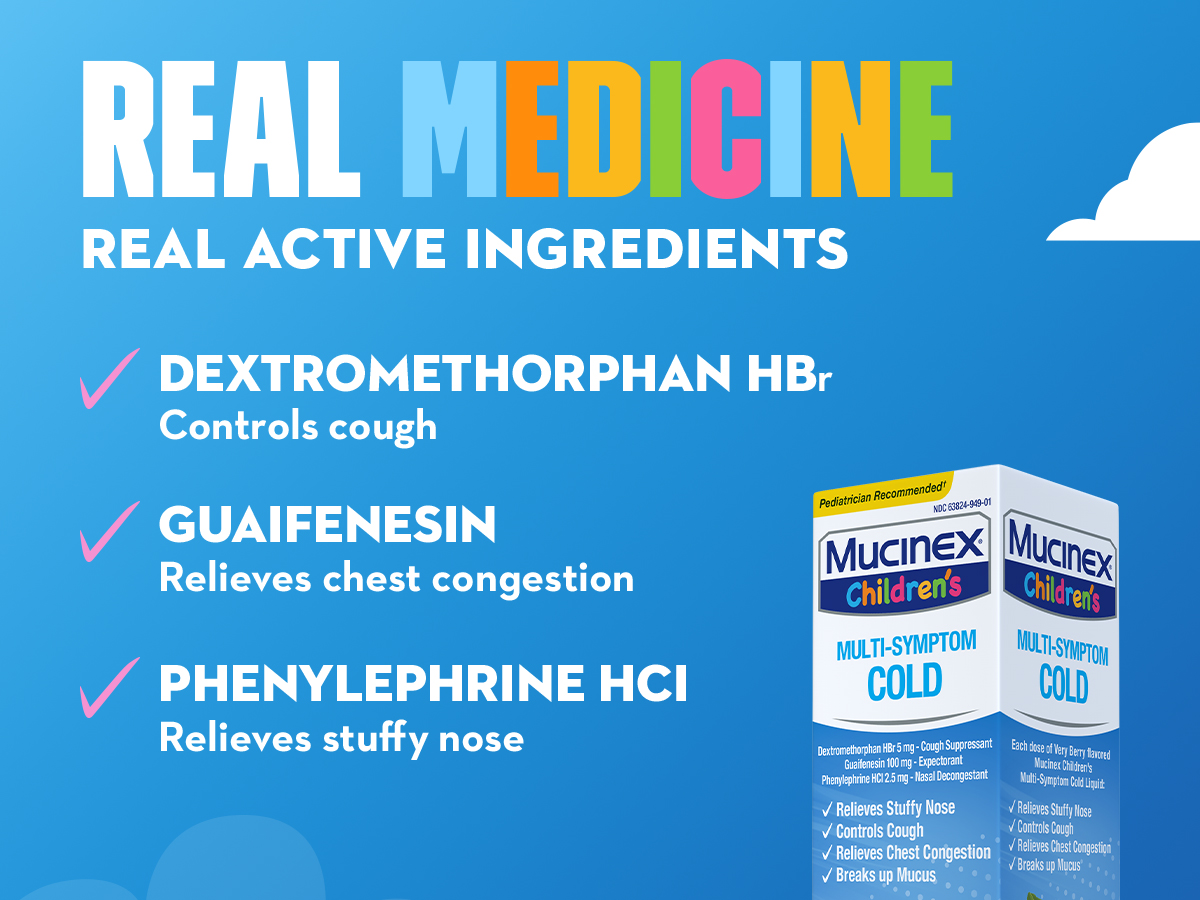 - REAL MEDICINE: Mucinex Children's Multi-Symptom Cold liquid contains real active ingredients to relieve your child's symptoms; Dextromethorphan HBr is a cough suppressant, Guaifenesin is an expectorant, and Phenylephrine HCl is a nasal decongestant