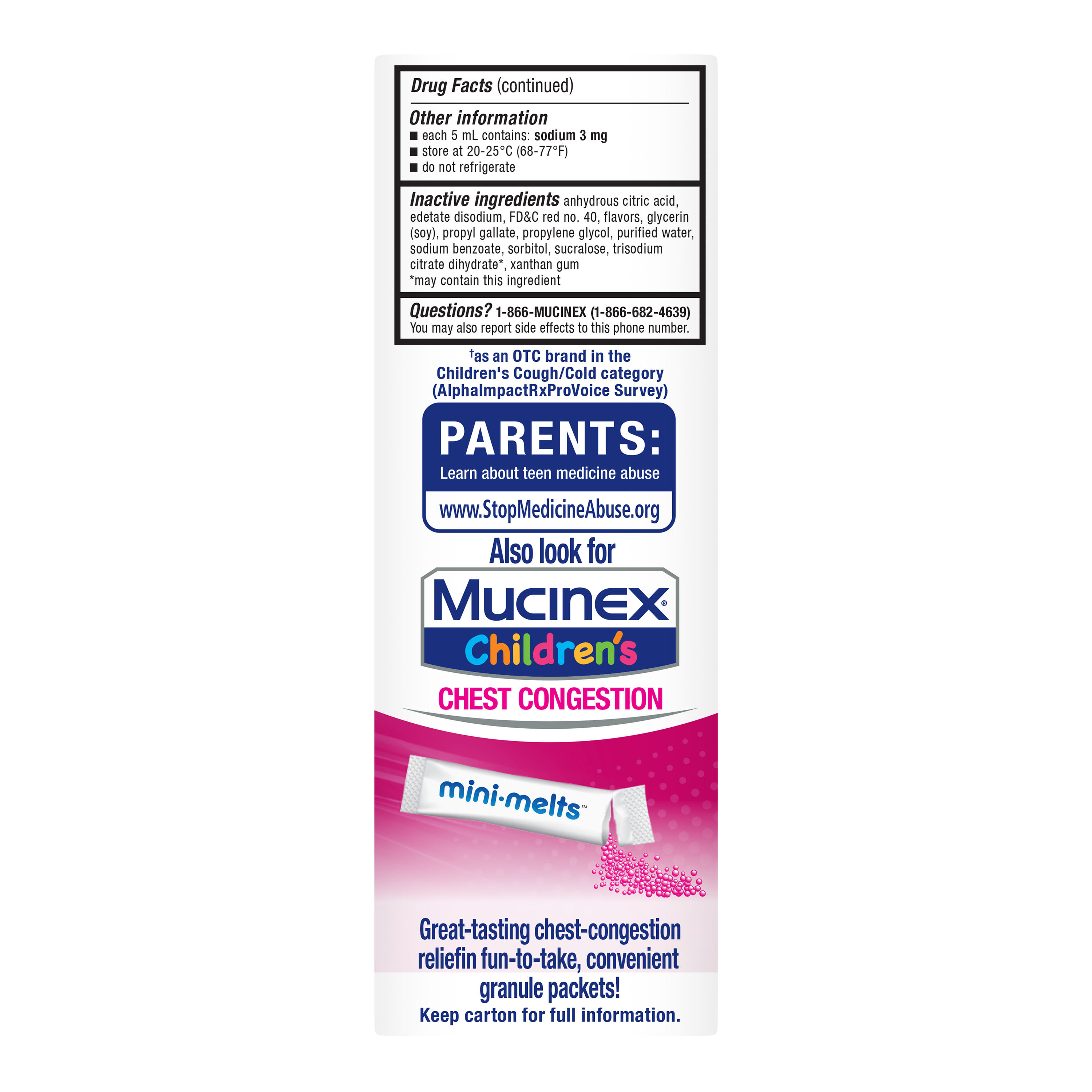 - PEDIATRICIAN RECOMMENDED: Mucinex is the #1 Pediatrician Recommended Brand among Non-Homeopathic Children’s Cough / Cold OTC products (IQVIA, ProVoice Survey, May 2023)