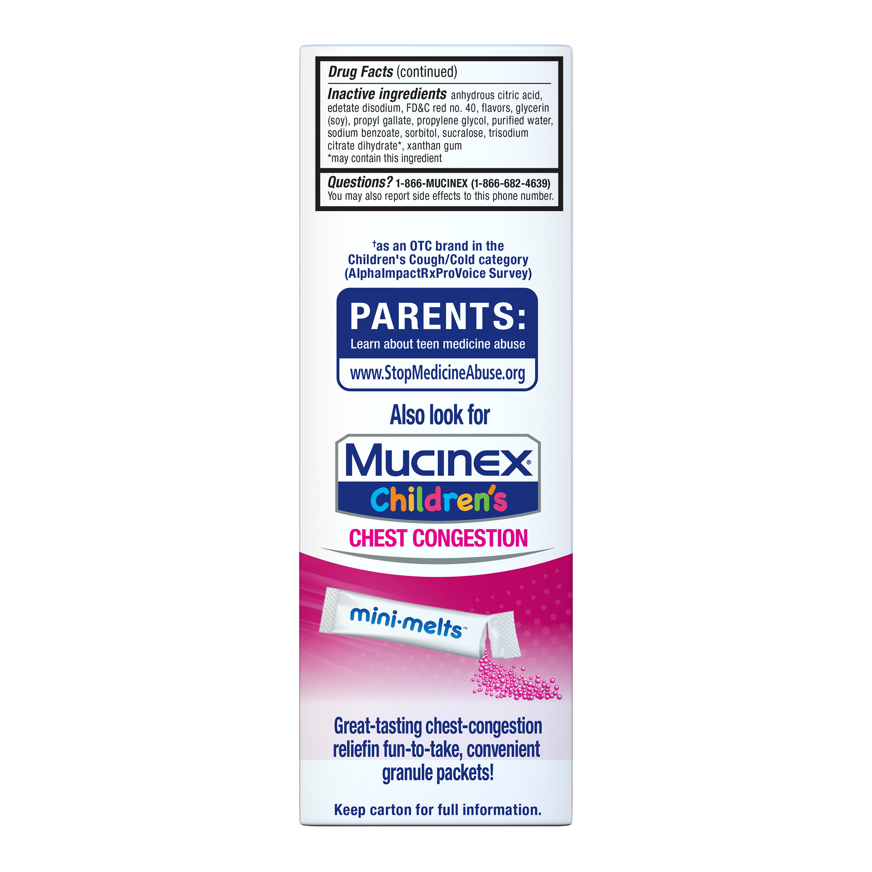 - #1 PEDIATRICIAN RECOMMENDED: Mucinex Children’s is the #1 Pediatrician Recommended Brand among Non-Homeopathic Children’s Cough / Cold OTC products