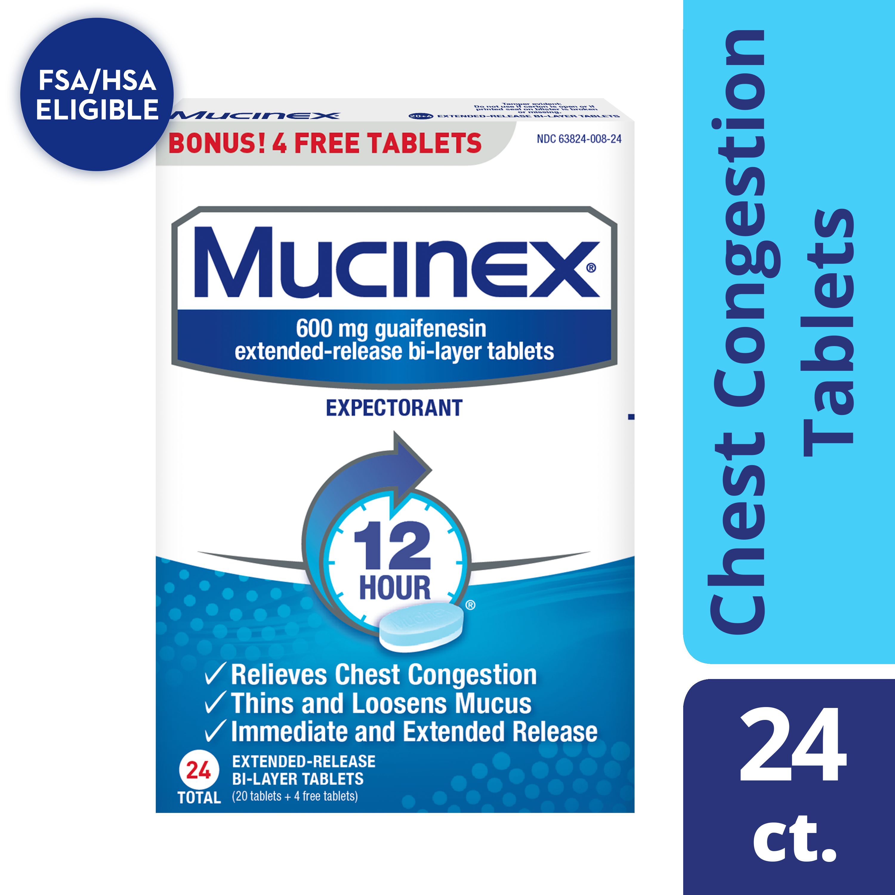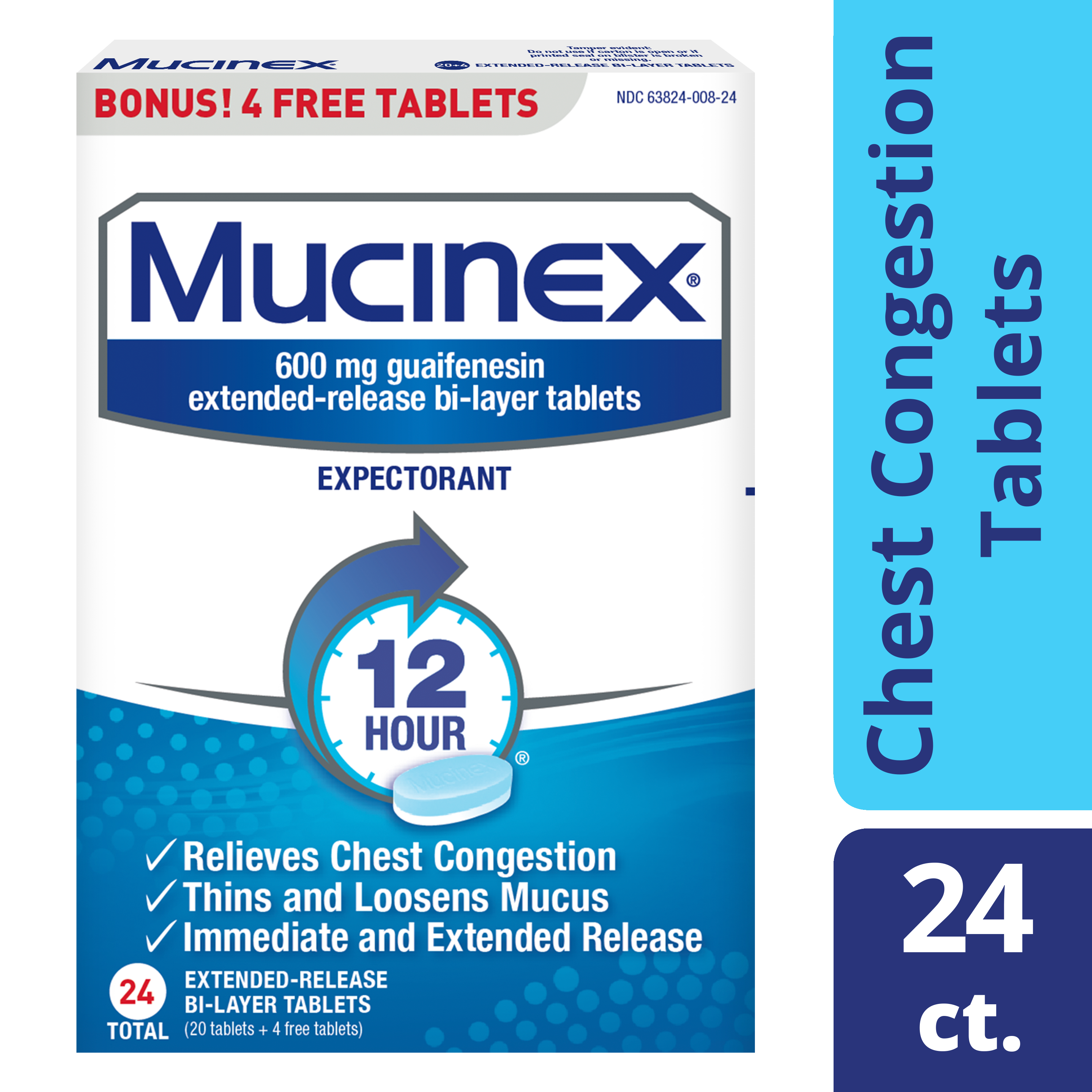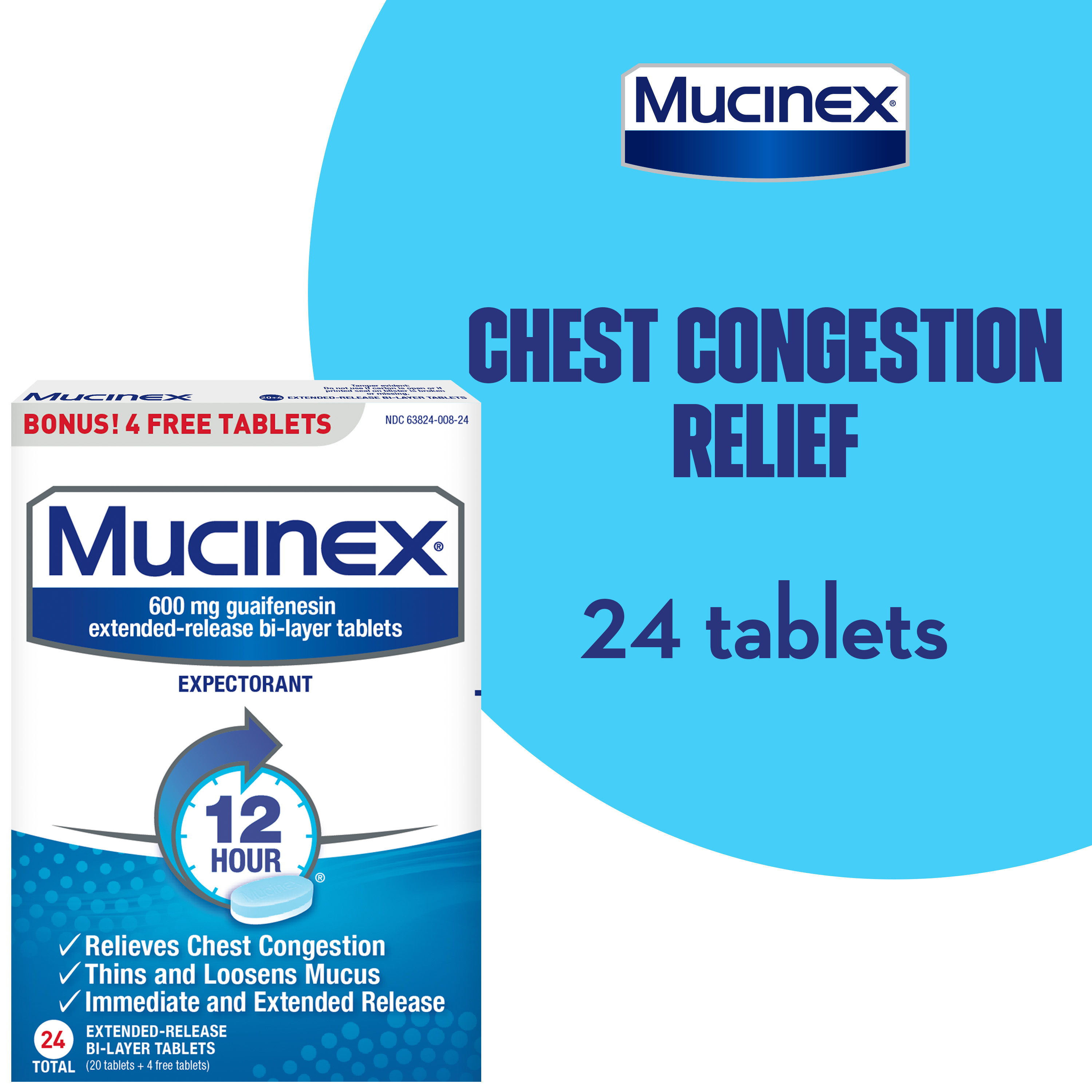| Amazon Title | Mucinex 12 hour Chest Congestion Medicine, Chest Congestion Relief, Expectorant, Lasts 12 hours, Powerful Symptom Relief, Extended-Release Bi-layer tablets, 20+4 count (Bonus 4 Free Tablets) |
