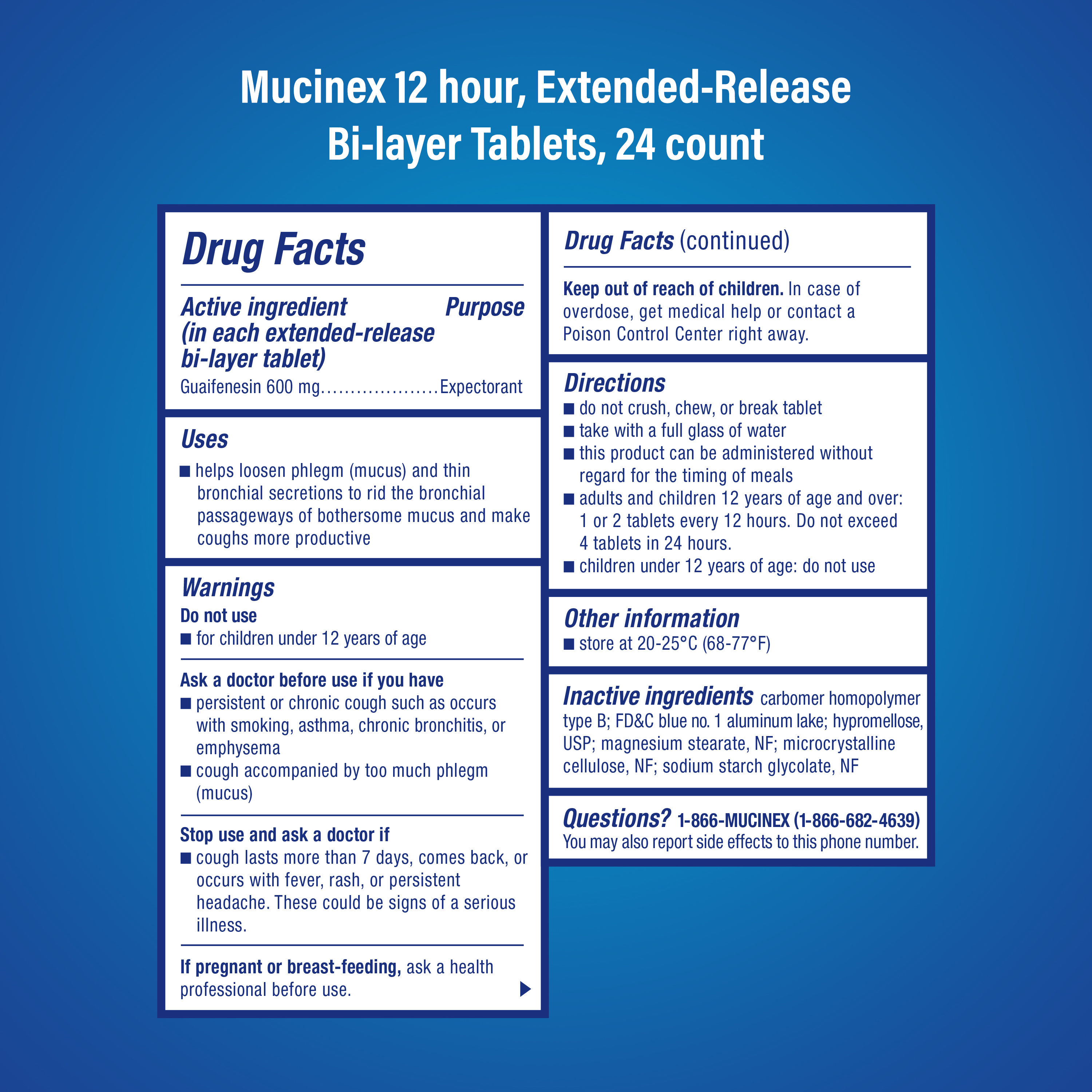 | Product Description | Mucinex Extended-release Bi-layer tablets provide powerful symptom relief. The product relieves chest congestion, thins and loosens mucus and lasts for 12 hours. It contains a unique bi-layer tablet - one layer for immediate release and one layer for extended release, so the medicine starts to release right away and lasts for up to 12 hours, so you can say goodbye to retaking medicine every 4 hours. Mucinex is the #1 Cough & Cold Brand Doctors Trust* and the #1 Pharmacist Recommended Brand† as well. This product contains 120 tablets. It can be used by Adults and Children 12 years of age and over.