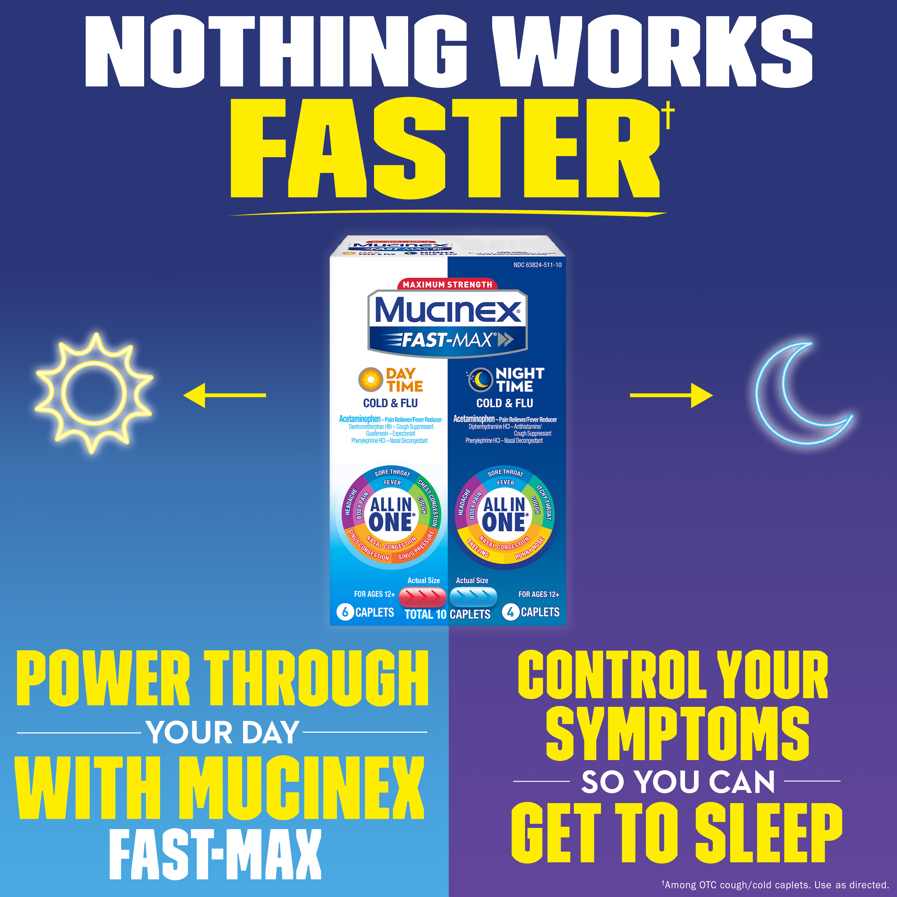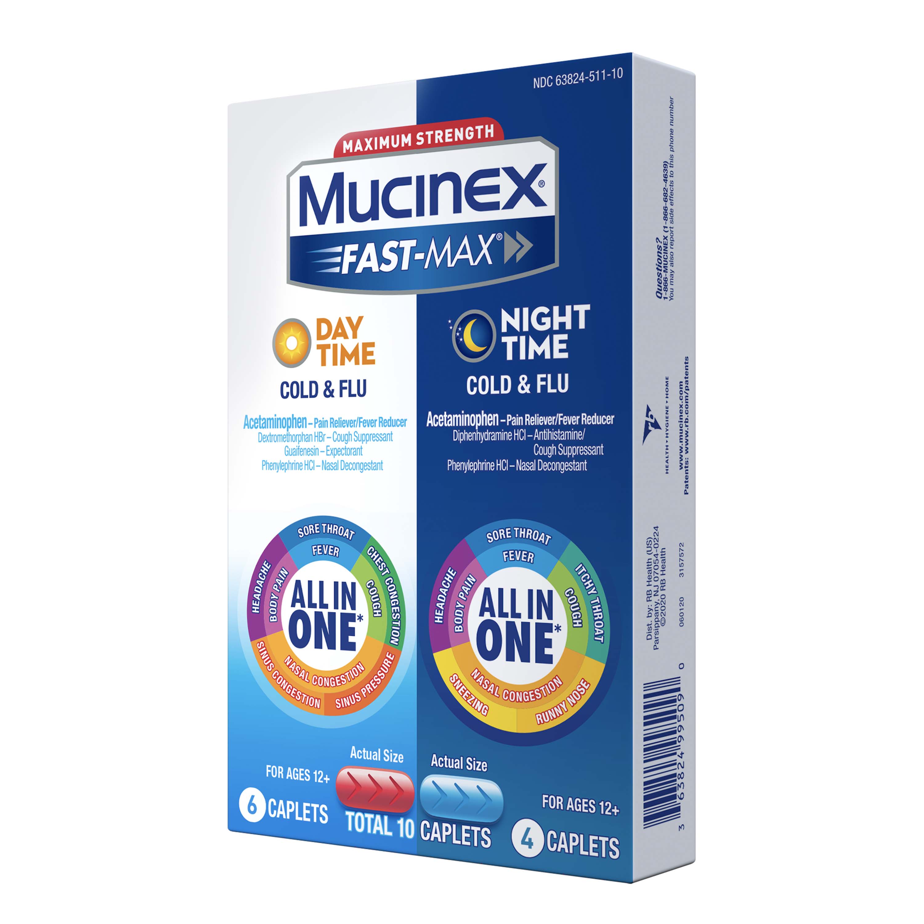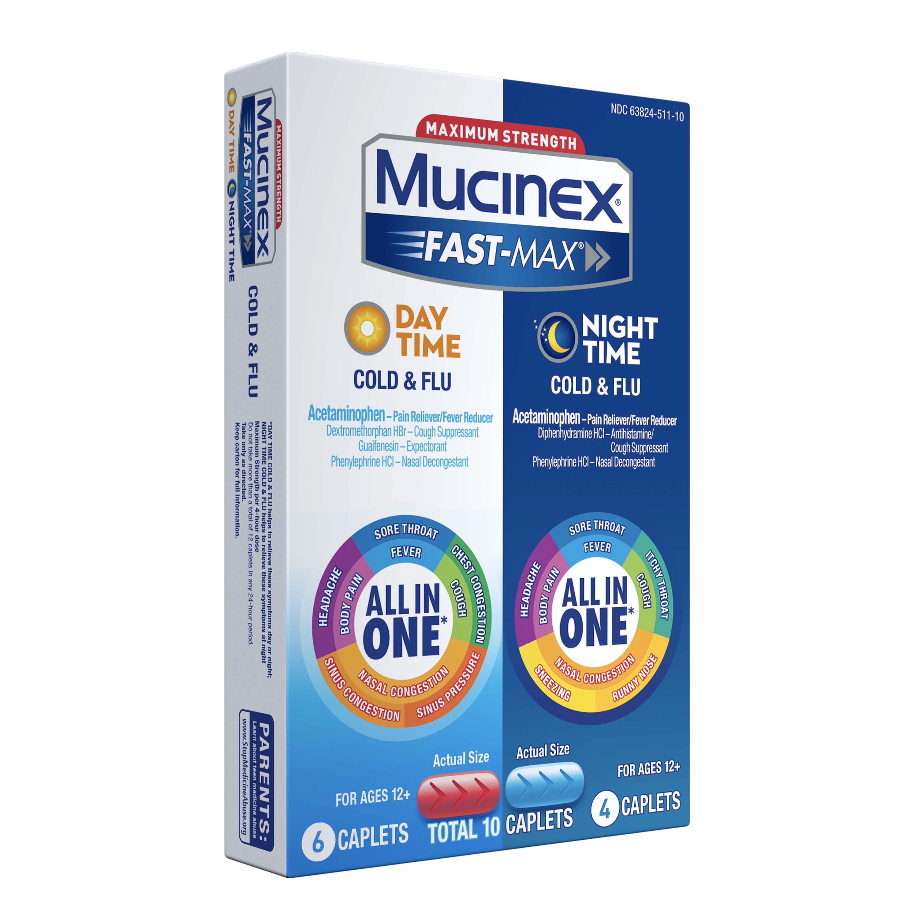 | Product Description | Maximum Strength Mucinex Fast-Max Day Time and Night Time Cold & Flu Combo pack is a Multi-Symptom Relief medicine and All-in-One solution for Cold & Flu symptoms. Day Time Caplets help reduce fever, relieve cough, chest, nasal & sinus congestion that can cause mucus buildup, sinus pressure, minor aches and pains, headache and sore throat. Night Time Caplets help reduce fever, relieve cough, nasal congestion that leads to stuffy nose, minor aches and pains, headache, sneezing, runny nose and sore and itchy throat. Mucinex is the #1 Cough & Cold Brand Doctors Trust* and #1 Pharmacist Recommended Brand† as well. This product contains 10 caplets – 6 Day Time and 4 Night Time caplets. It can be used by Adults and Children 12 years of age and over. The product is also available in Liquid form.
