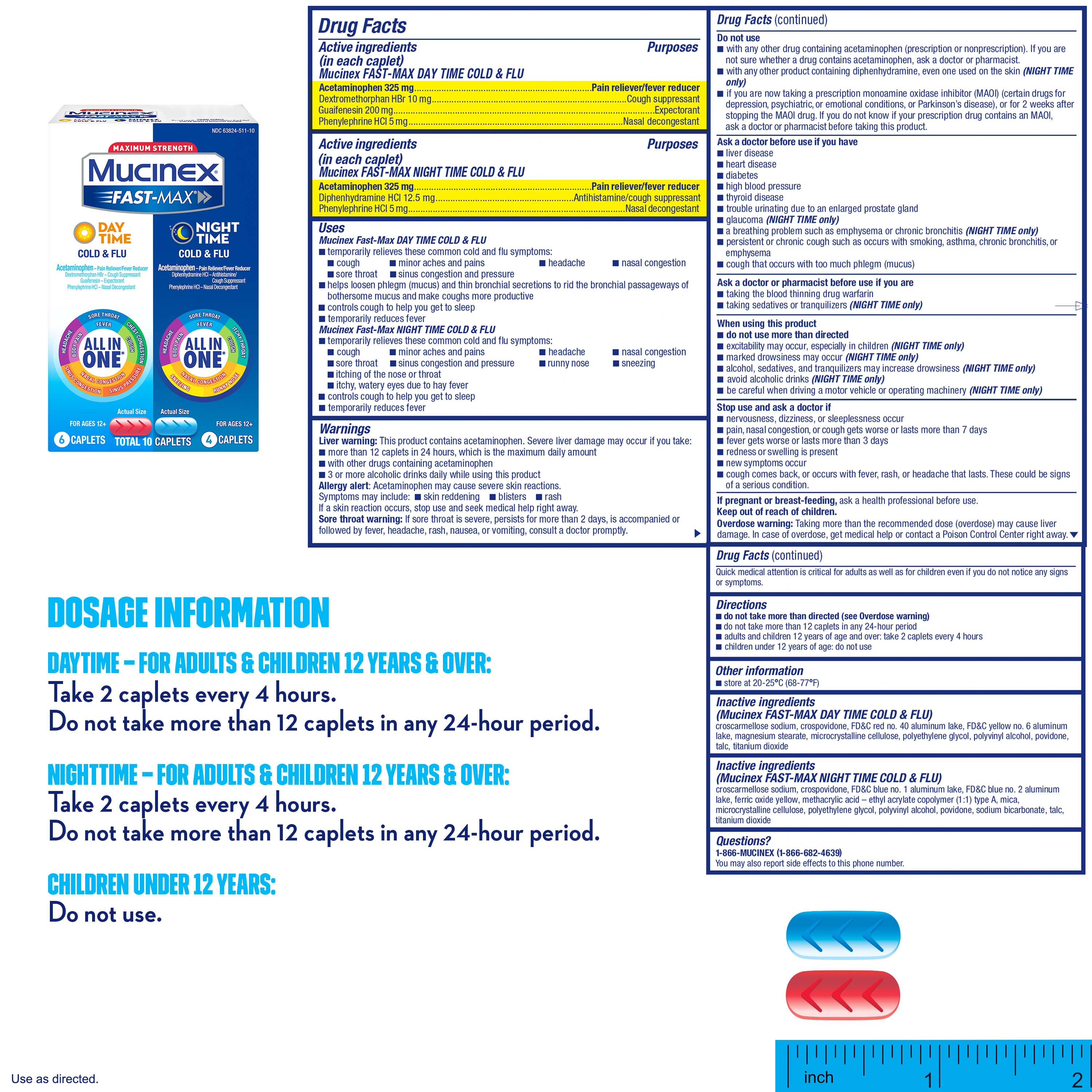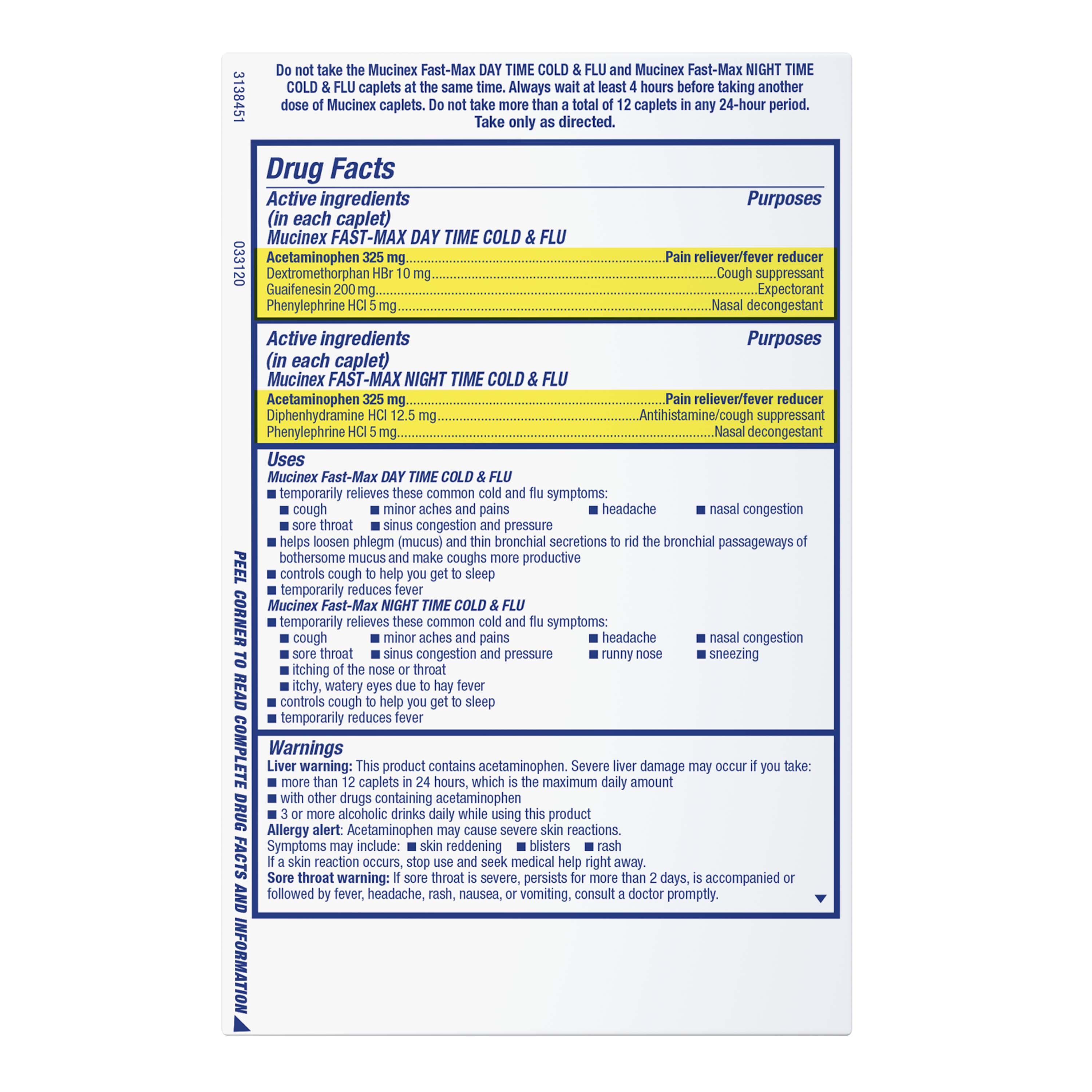 Do not take the Mucinex Fast-Max Day Time Cold & Flu and Mucinex Fast-Max Night Time Cold & Flu caplets at the same time. Always wait at least 4 hours before taking another dose of Mucinex caplets. Do not take more than a total of 12 caplets in any 24-hour period. Take only as directed.