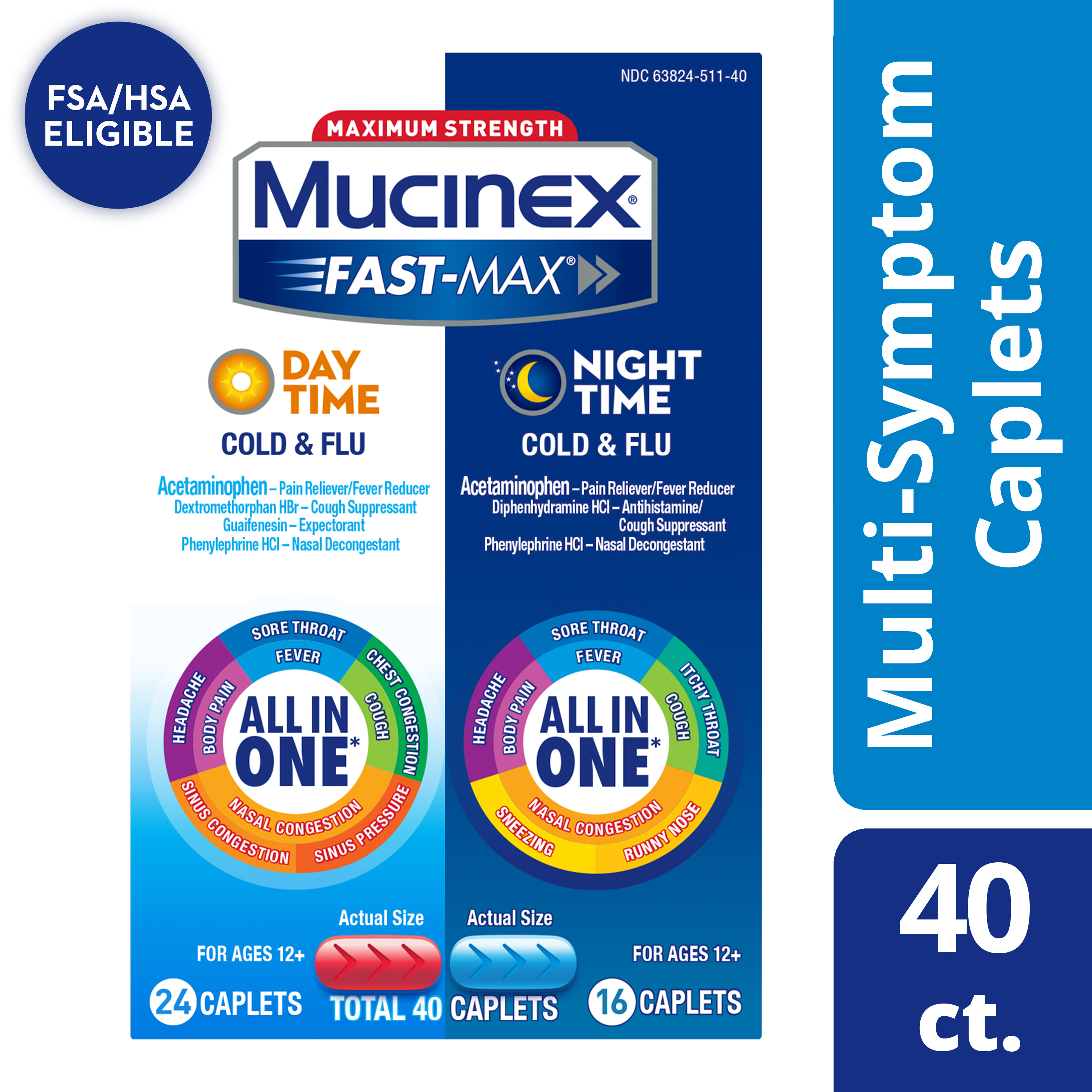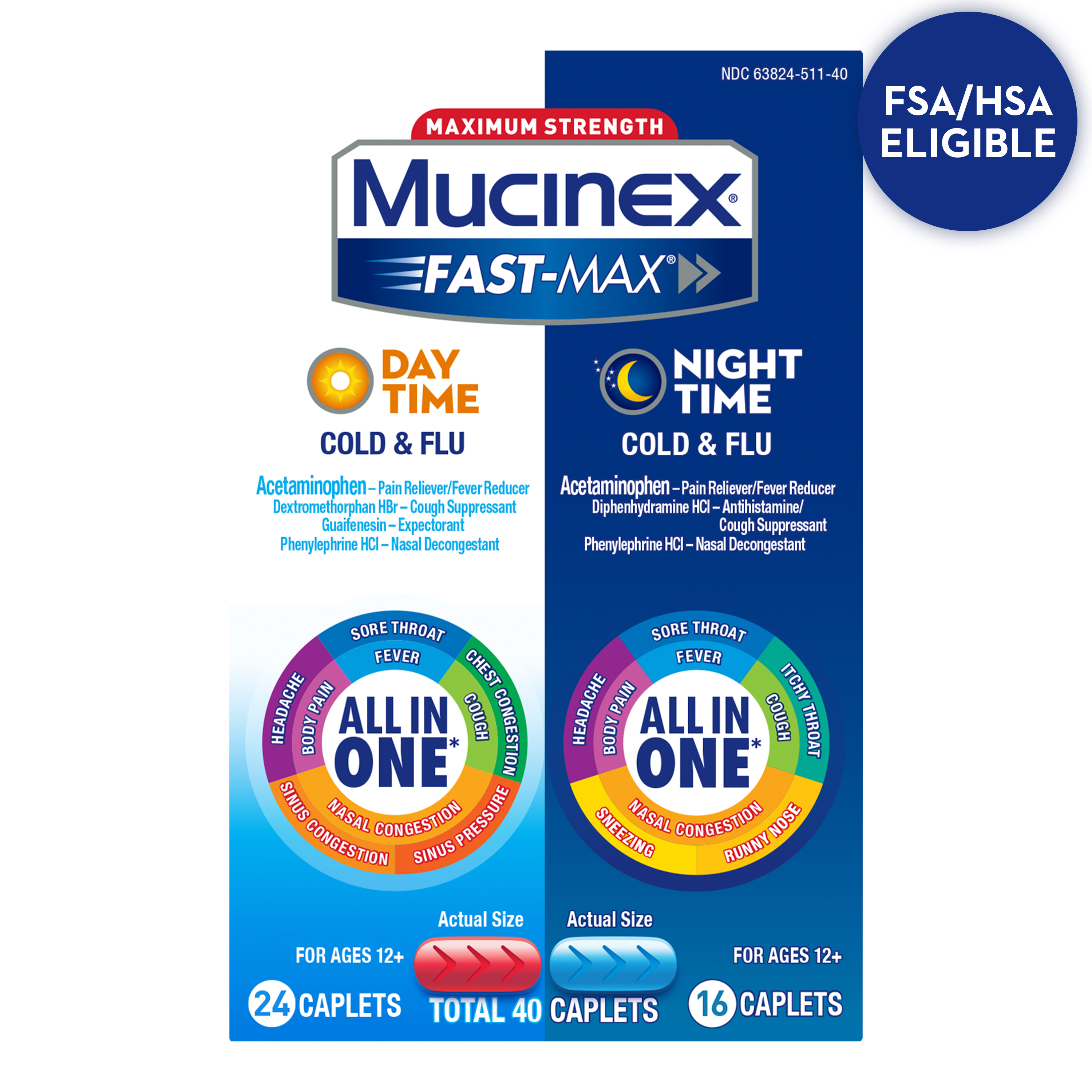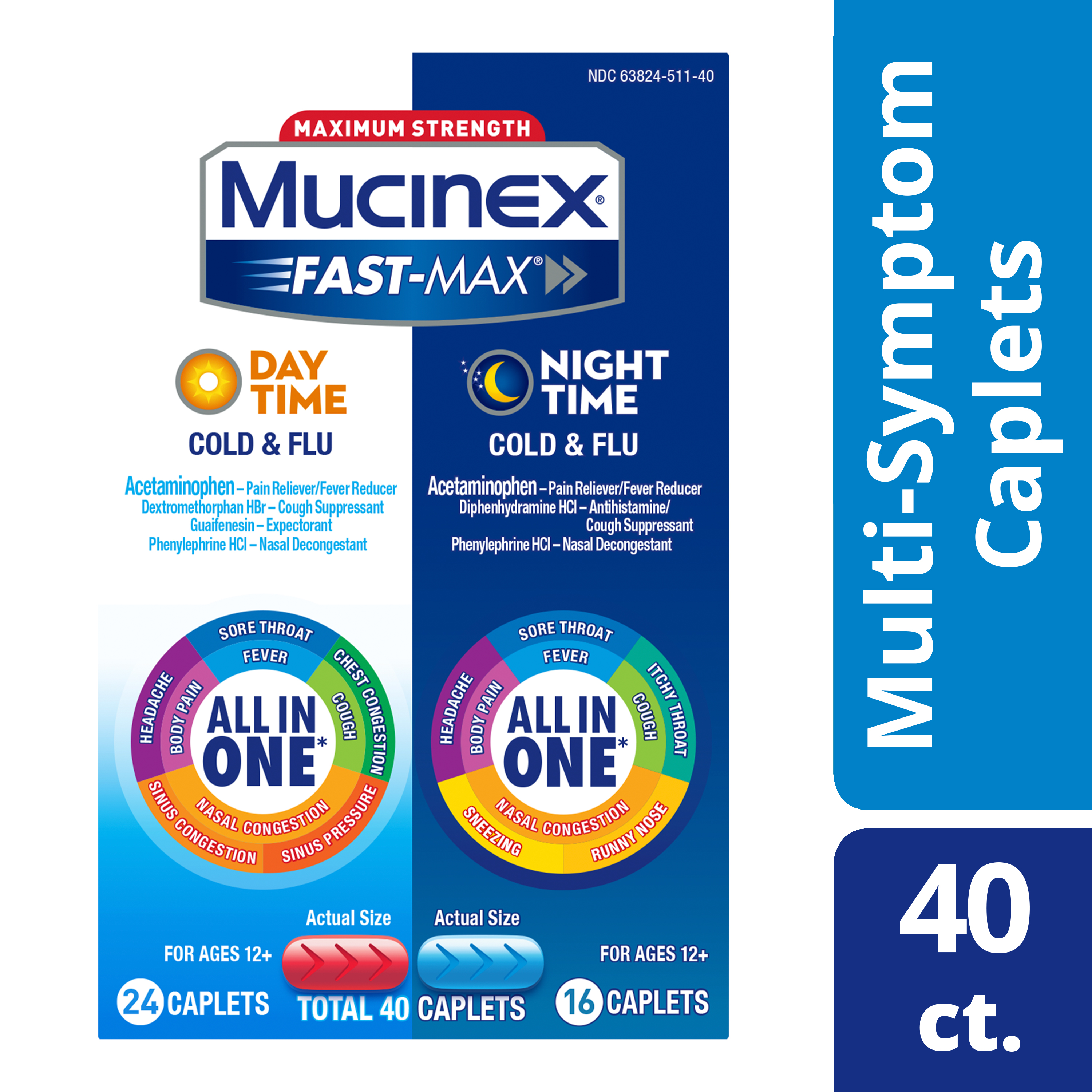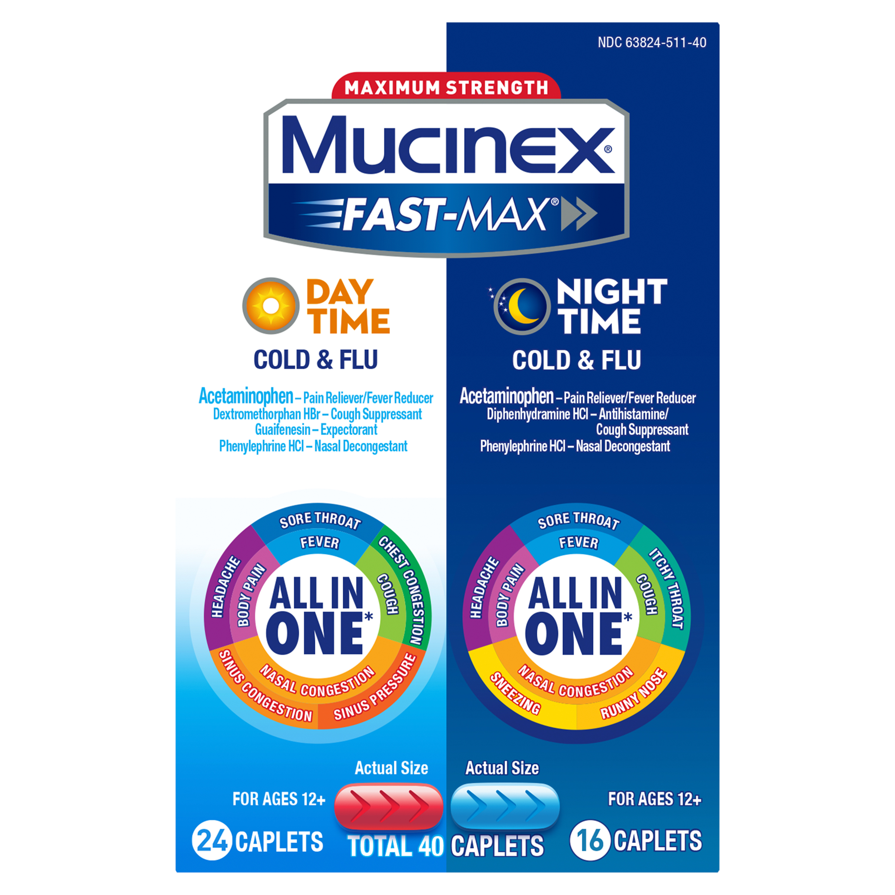 | Product Description | Maximum Strength Mucinex Fast-Max Day time and Night time Cold & Flu Combo pack is a Multi-Symptom Relief medicine and All-in-One solution for Cold & Flu symptoms. Day time caplets help relieve Fever, Cough, Nasal congestion, Body pain, Sore Throat, Chest Congestion, Sinus Pressure & Congestion, Headache. Night time caplets help reduce Fever, relieve Cough, Nasal Congestion, Body pain, Sore Throat, Itchy Throat, Runny Nose, Sneezing and Headache Mucinex is the #1 Cough & Cold Brand Doctors Trust* and #1 Pharmacist Recommended Brand† as well. This product contains 40 caplets – 24 Day time caplets and 16 Night time caplets. It can be used by Adults and Children 12 years of age and over. The product is also available in Liquid form.