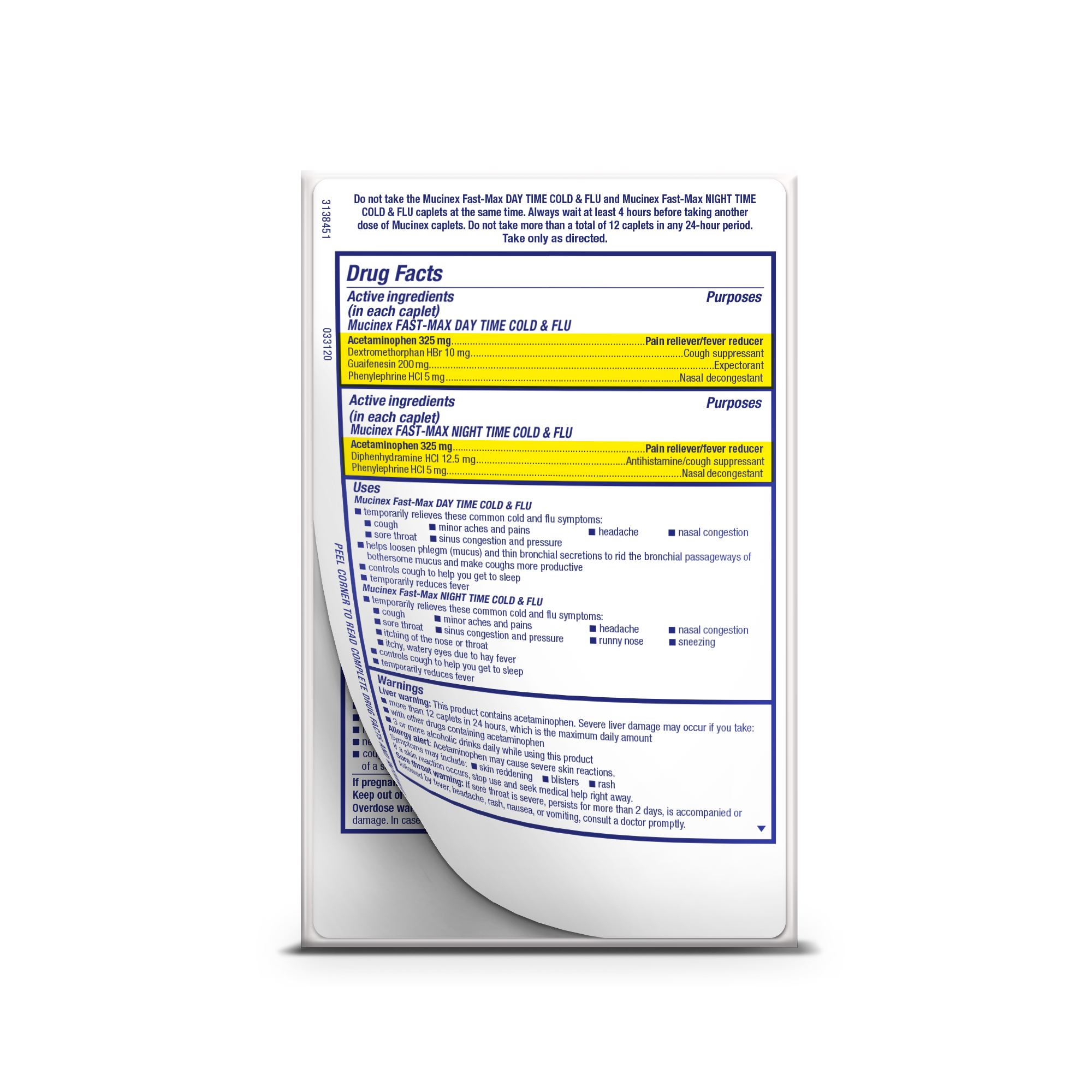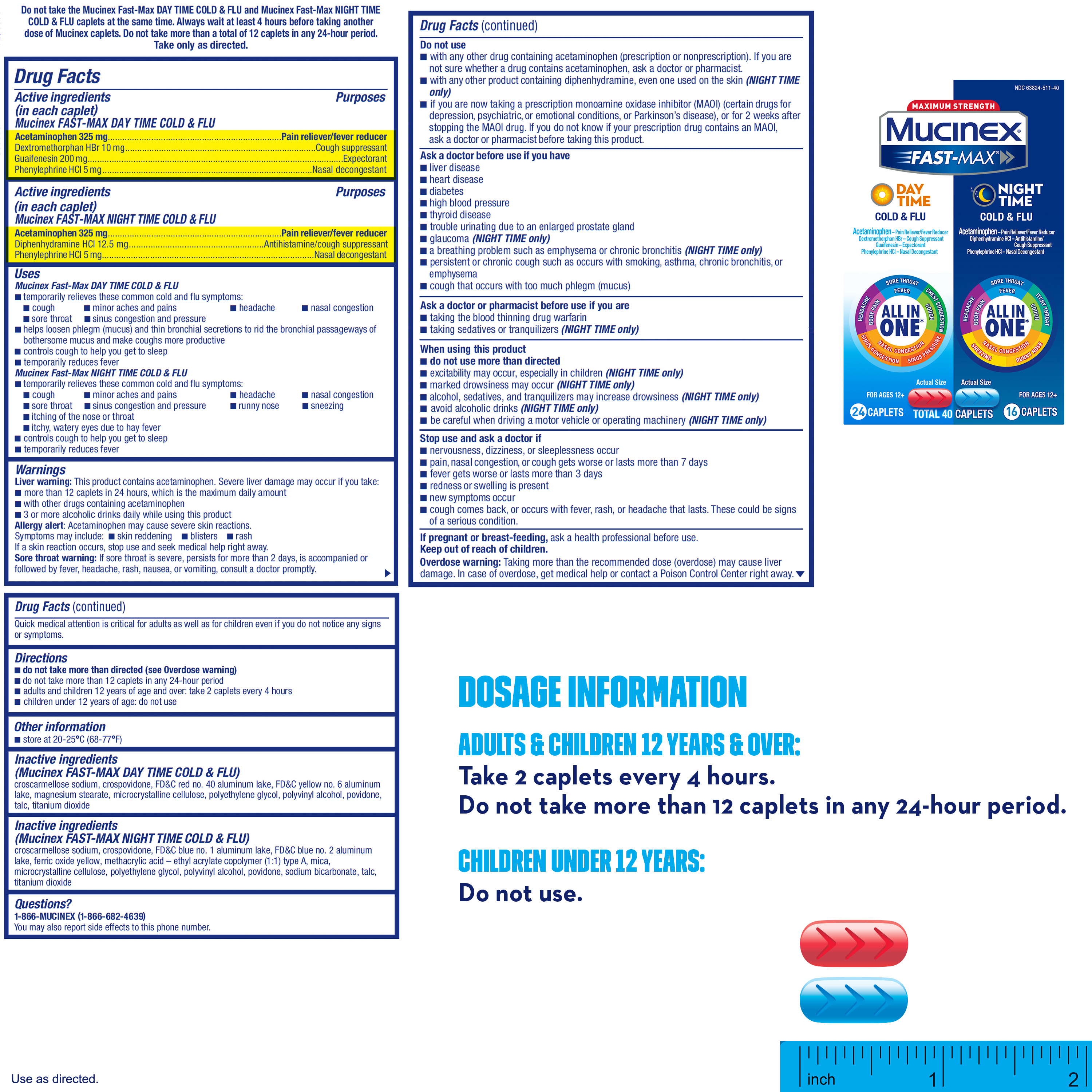 Do not take the Mucinex Fast-Max Day Time Cold & Flu and Mucinex Fast-Max Night Time Cold & Flu caplets at the same time. Always wait at least 4 hours before taking another dose of Mucinex caplets. Do not take more than a total of 12 caplets in any 24-hour period. Take only as directed.
