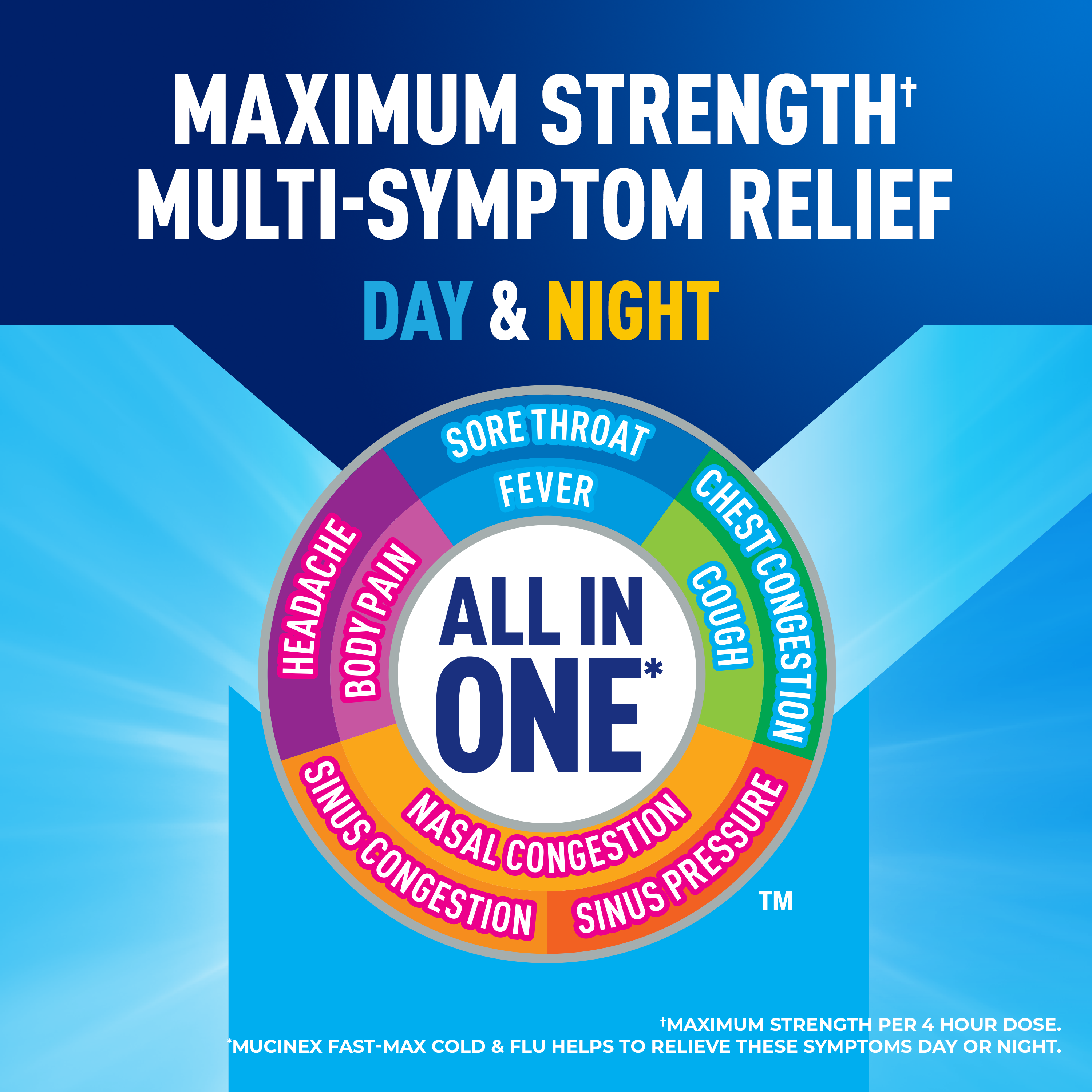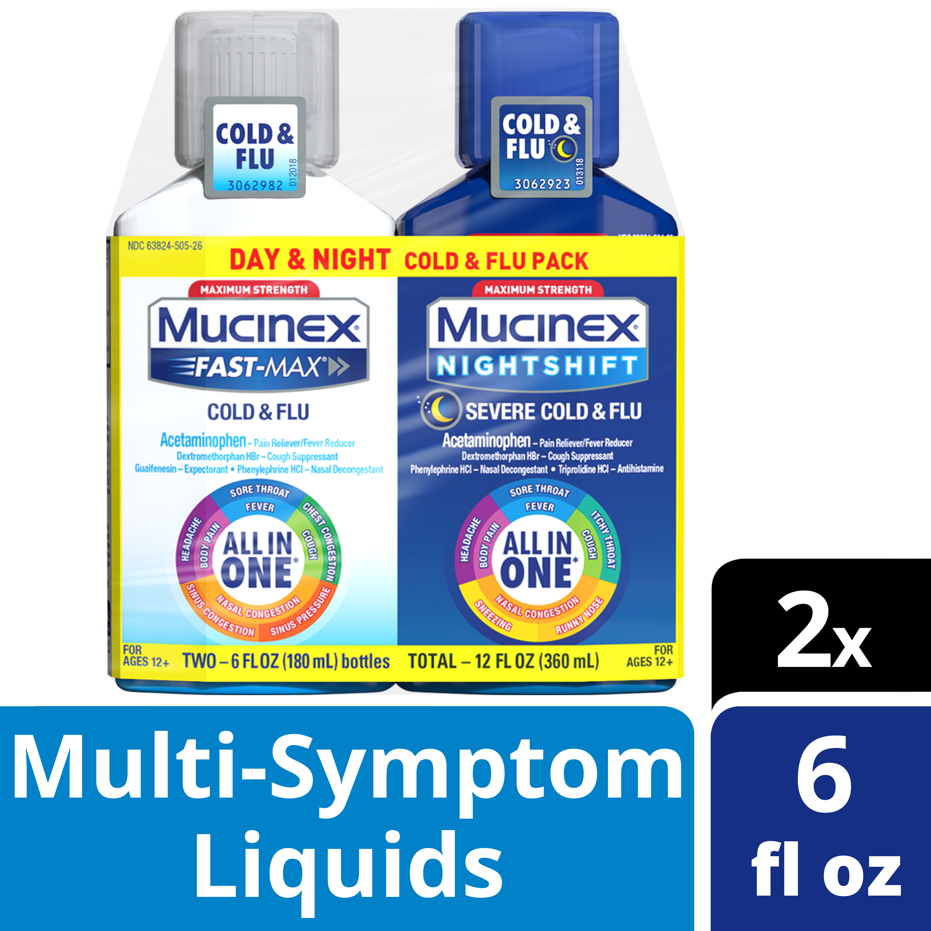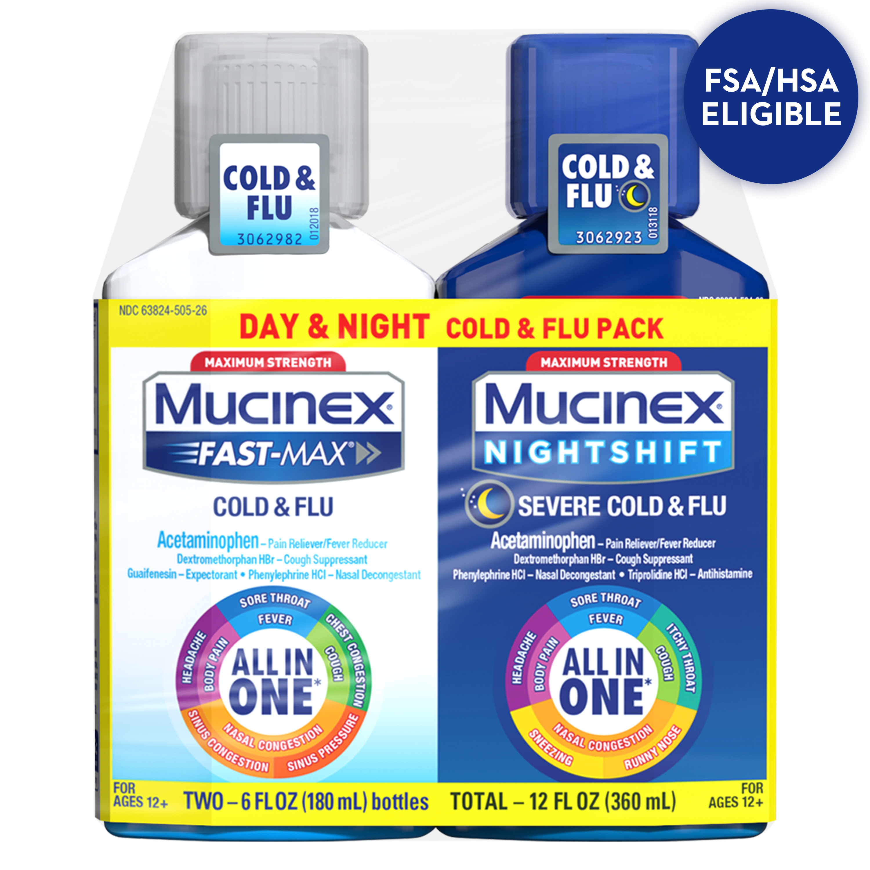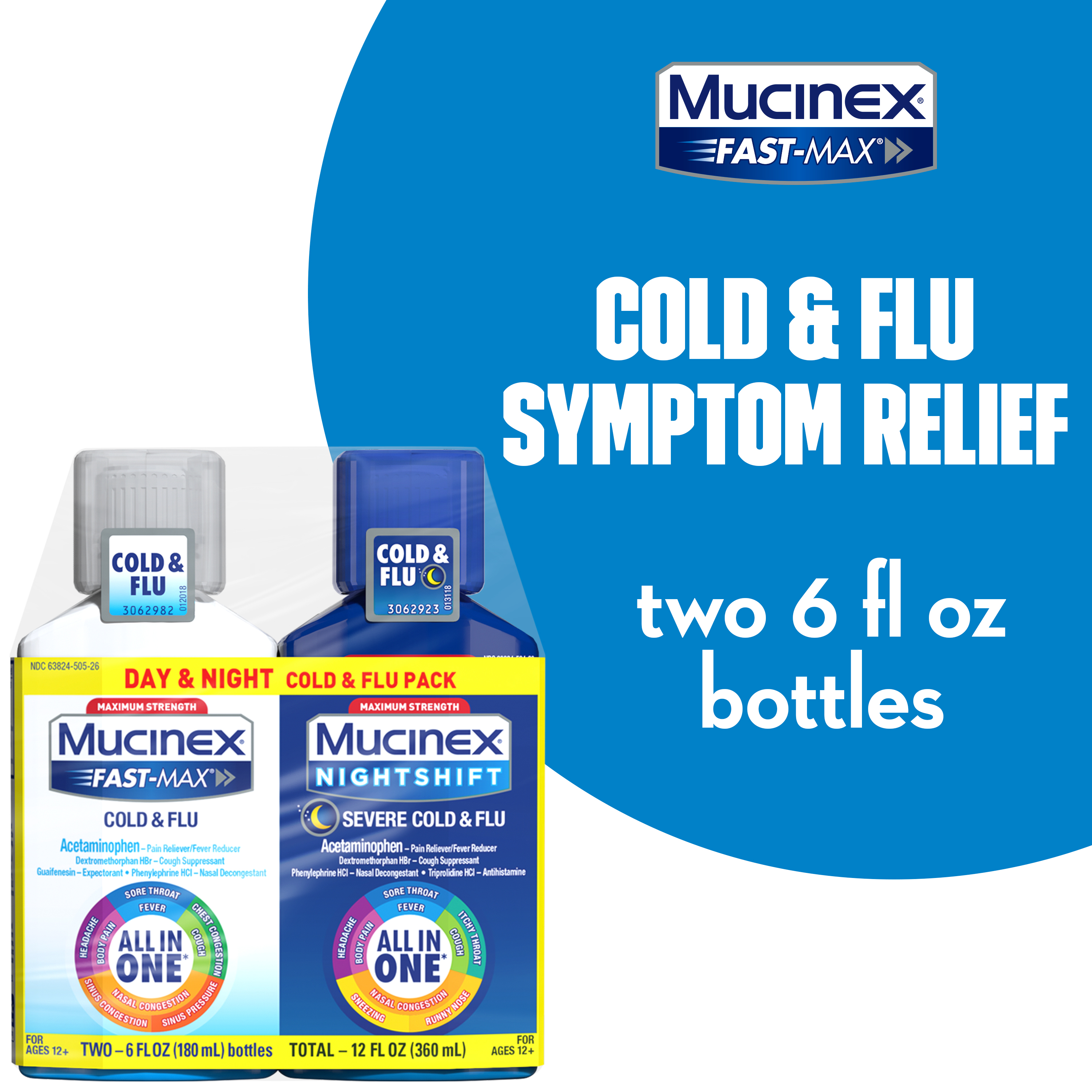 - COUGH COLD AND FLU MEDICINES FOR ADULTS: This combo pack of Maximum Strength Mucinex Fast-Max Cold & Flu and Nightshift Severe Cold & Flu provides powerful multi-symptom cold and flu relief for your worst cold and flu symptoms