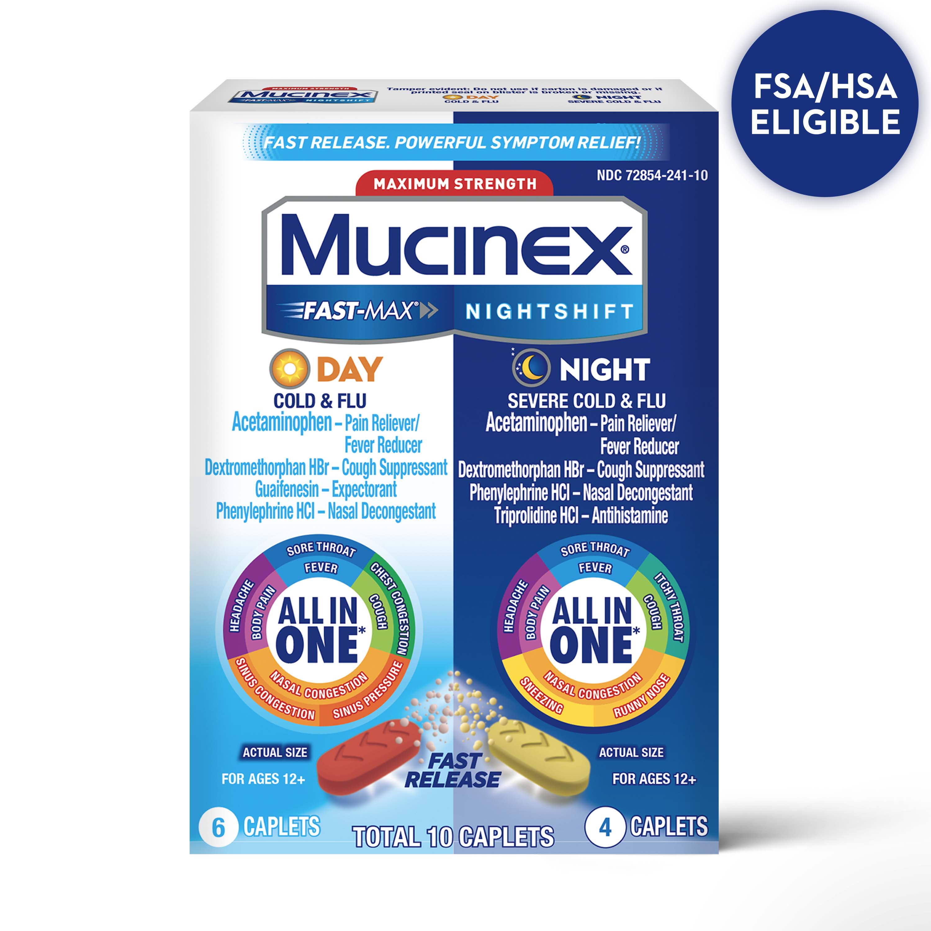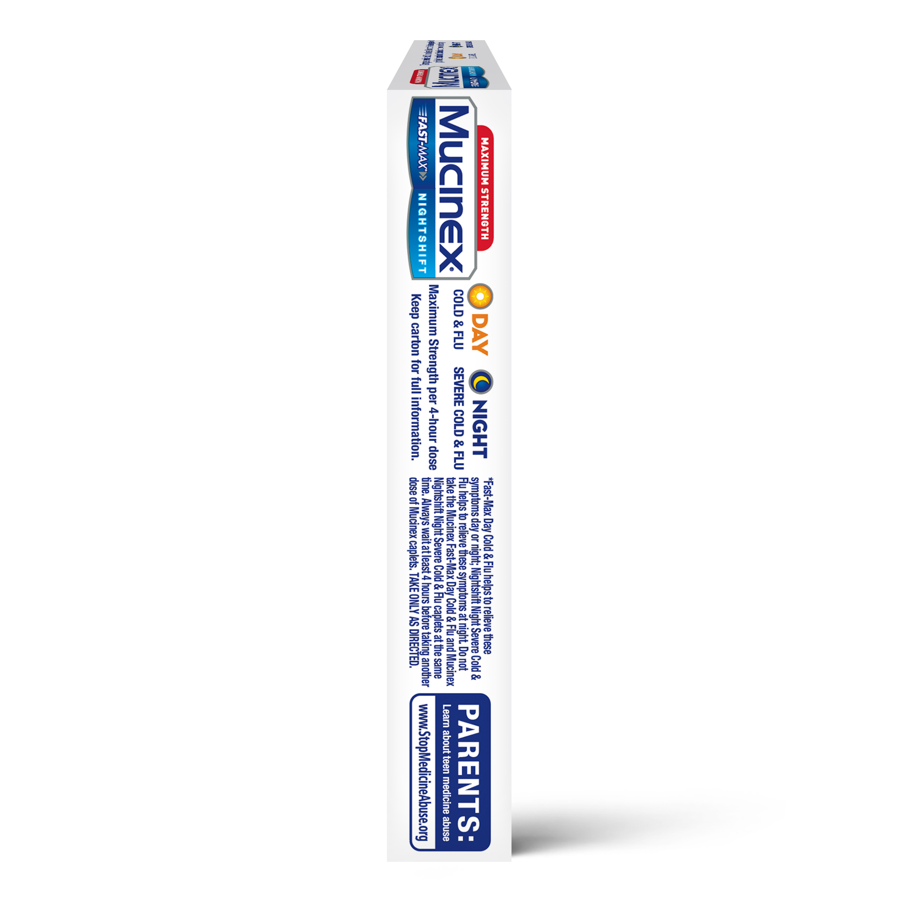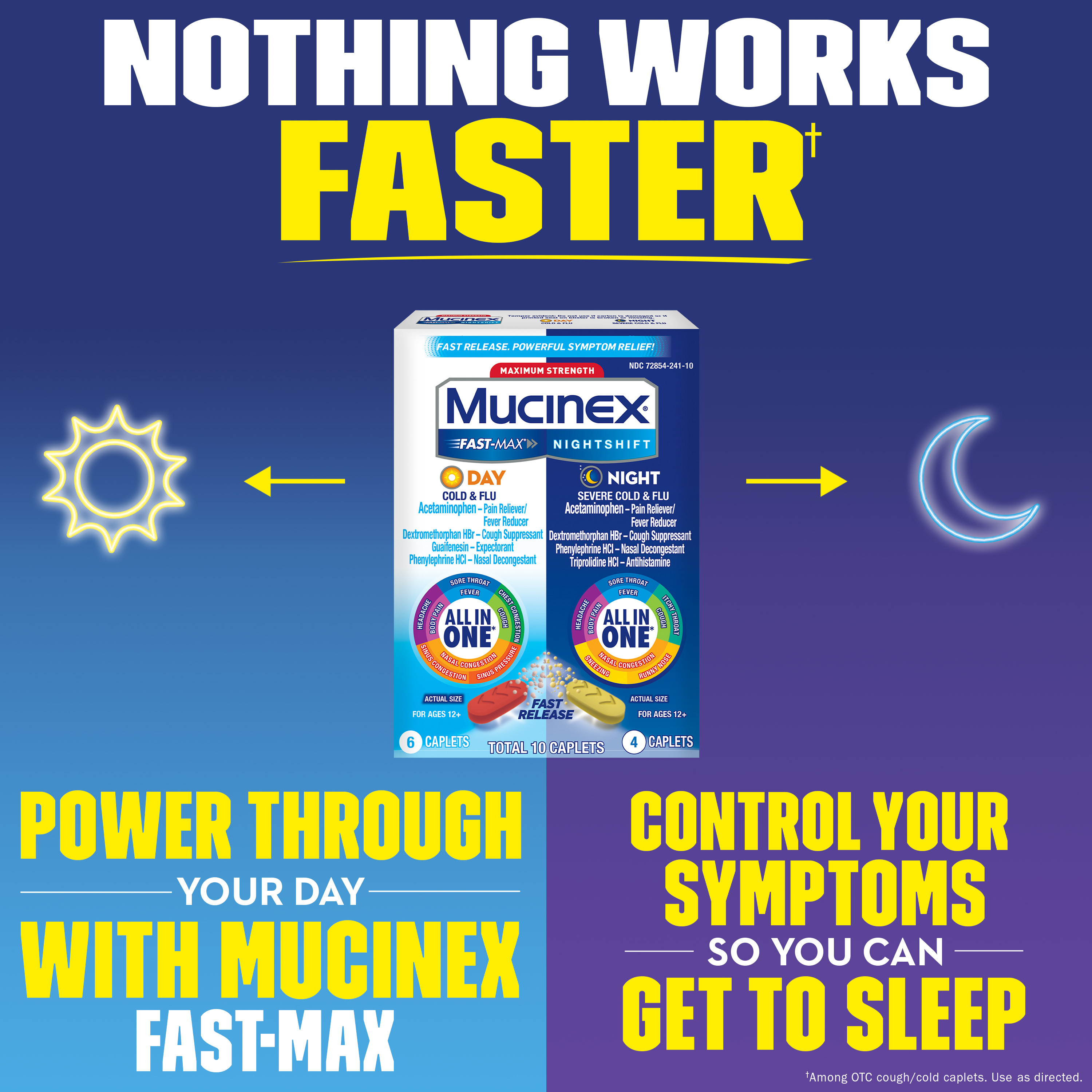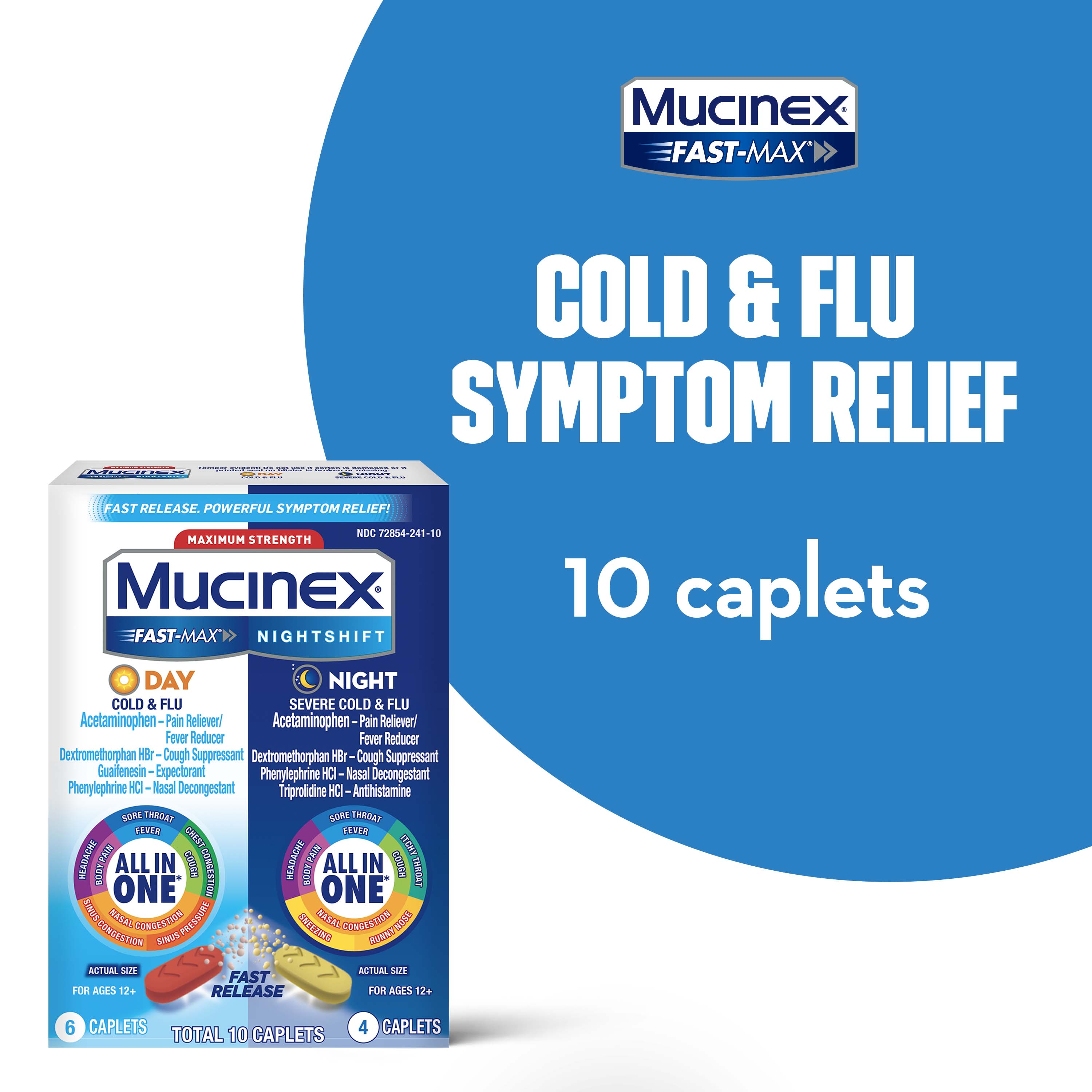 - MAXIMUM STRENGTH MUCINEX FAST-MAX DAY COLD & FLU & NIGHTSHIFT NIGHT SEVERE COLD & FLU: Fast Release, Powerful Multi-Symptom Relief medicine. 1 dose treats 9 symptoms - get back to what’s important thanks to the fast, powerful medicine
