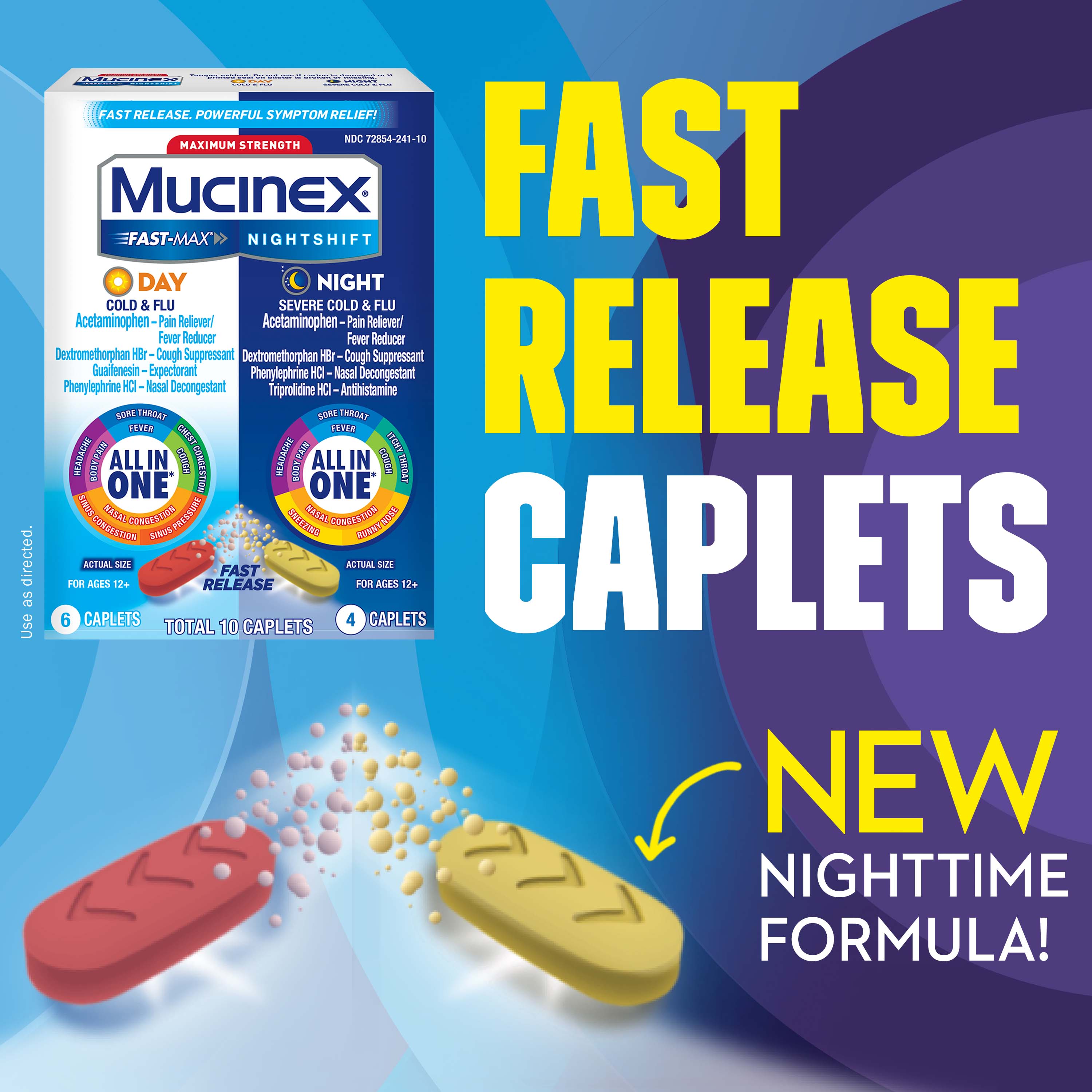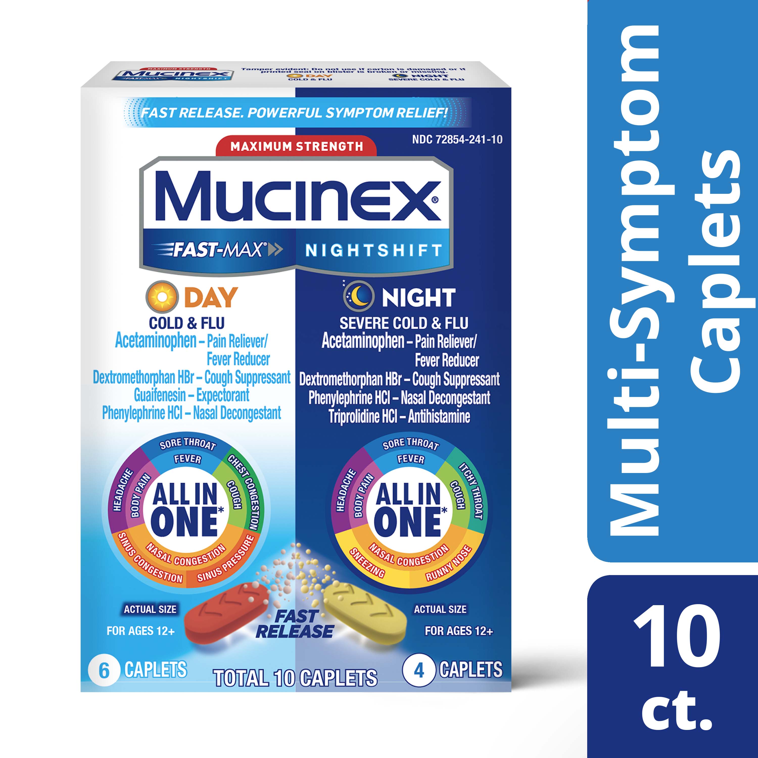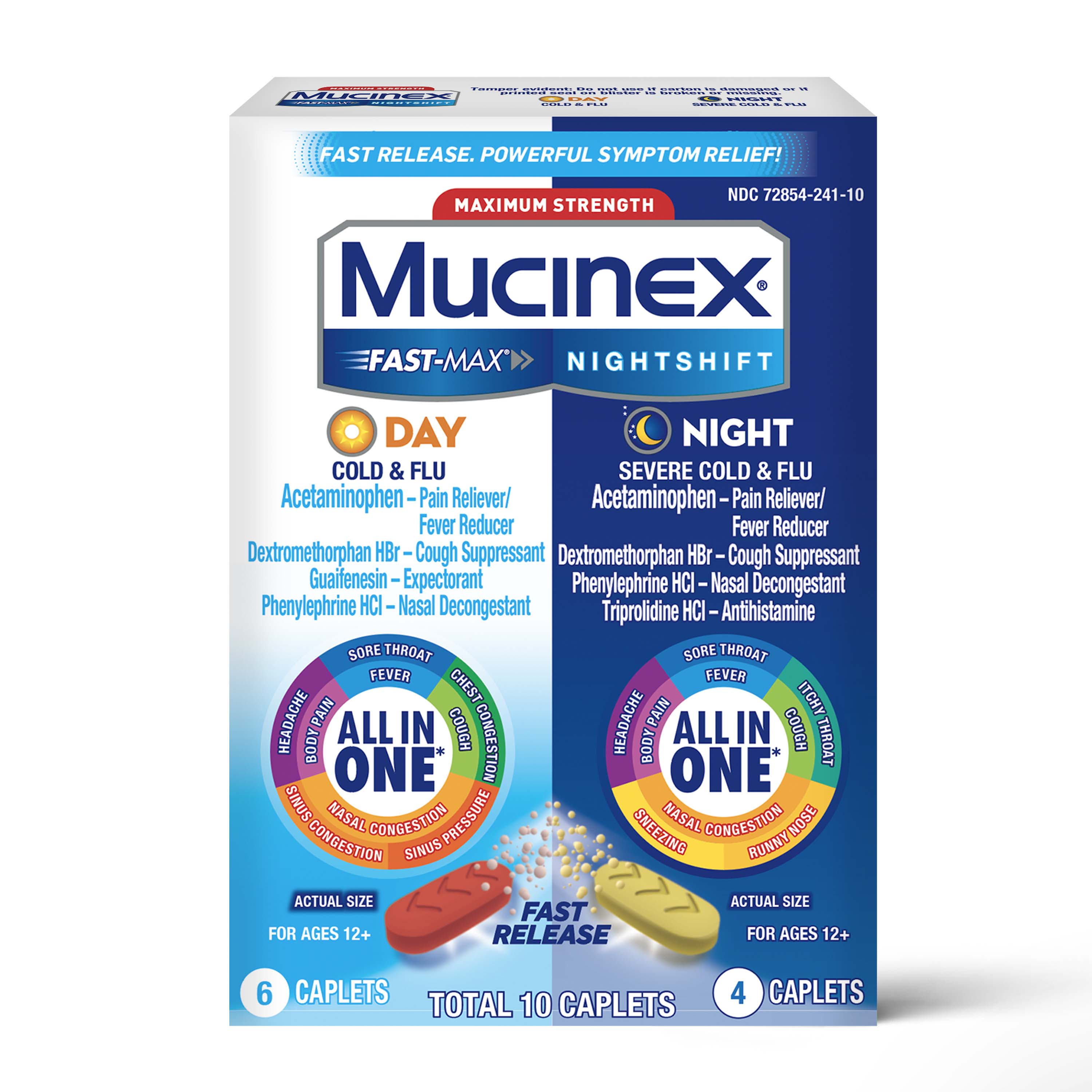 - MAXIMUM STRENGTH MUCINEX FAST-MAX DAY COLD & FLU & NIGHTSHIFT NIGHT SEVERE COLD & FLU: Fast Release, Powerful Multi-Symptom Relief medicine. 1 dose treats 9 symptoms - get back to what’s important thanks to the fast, powerful medicine