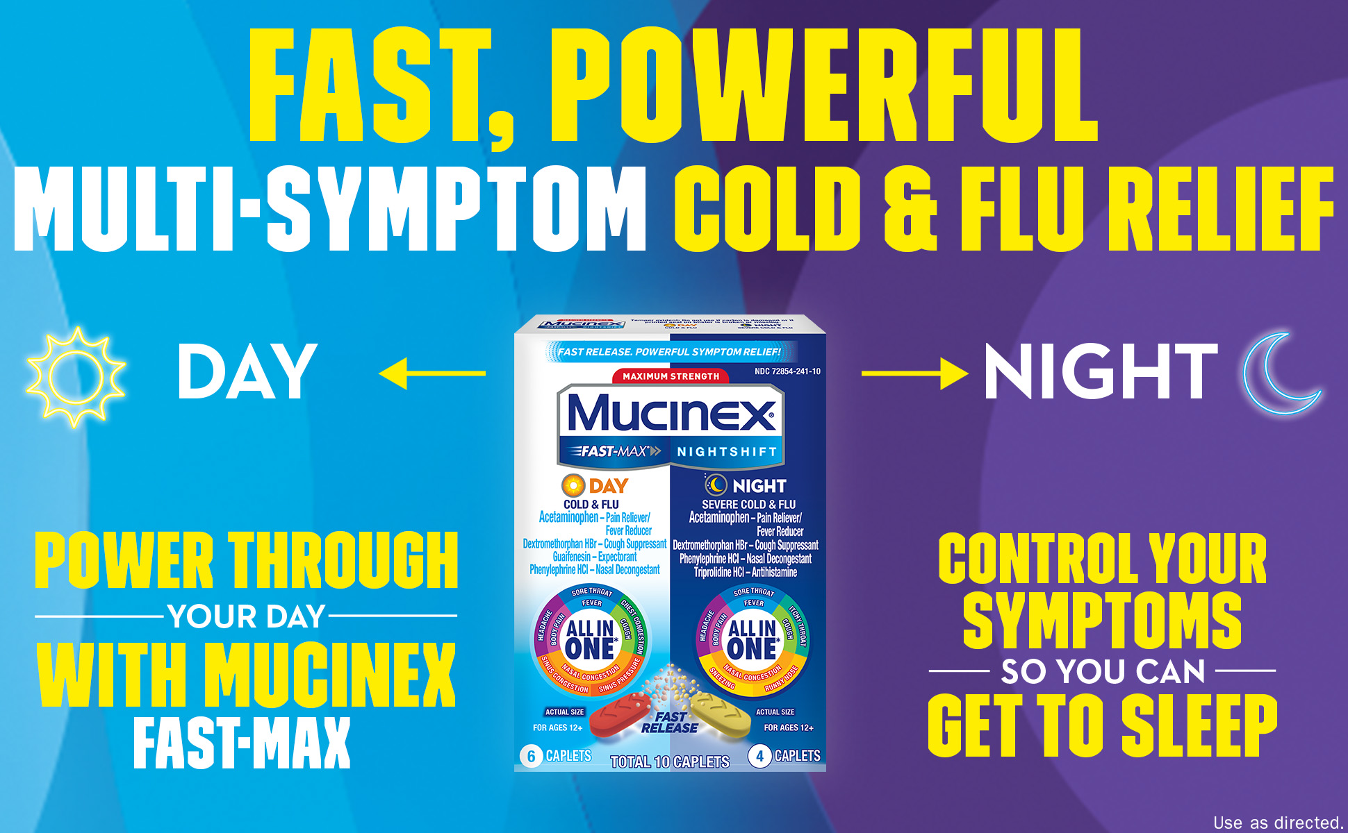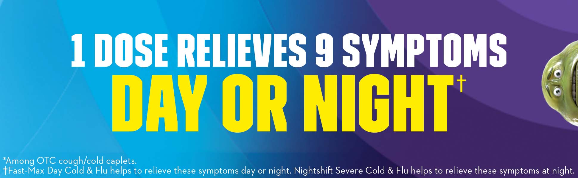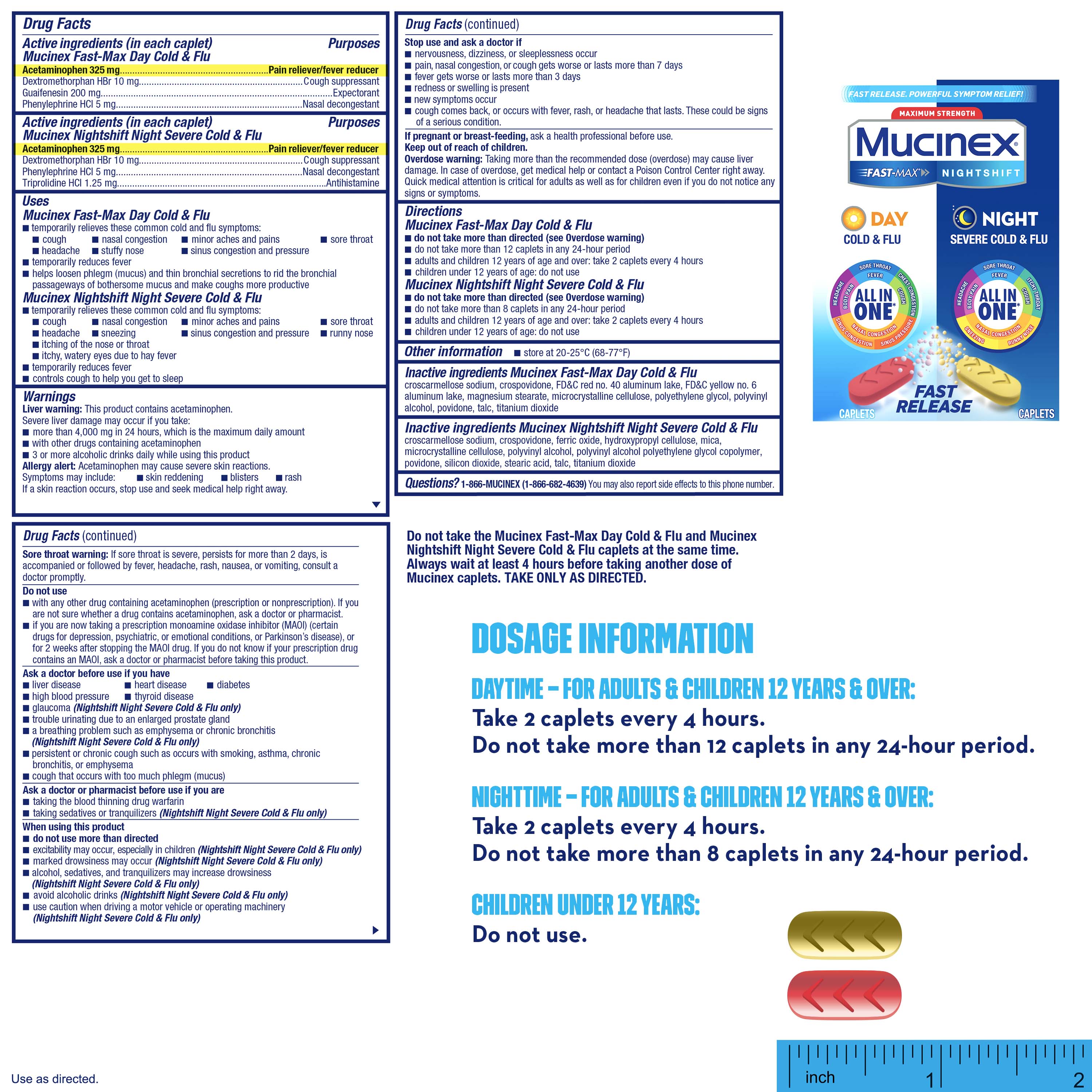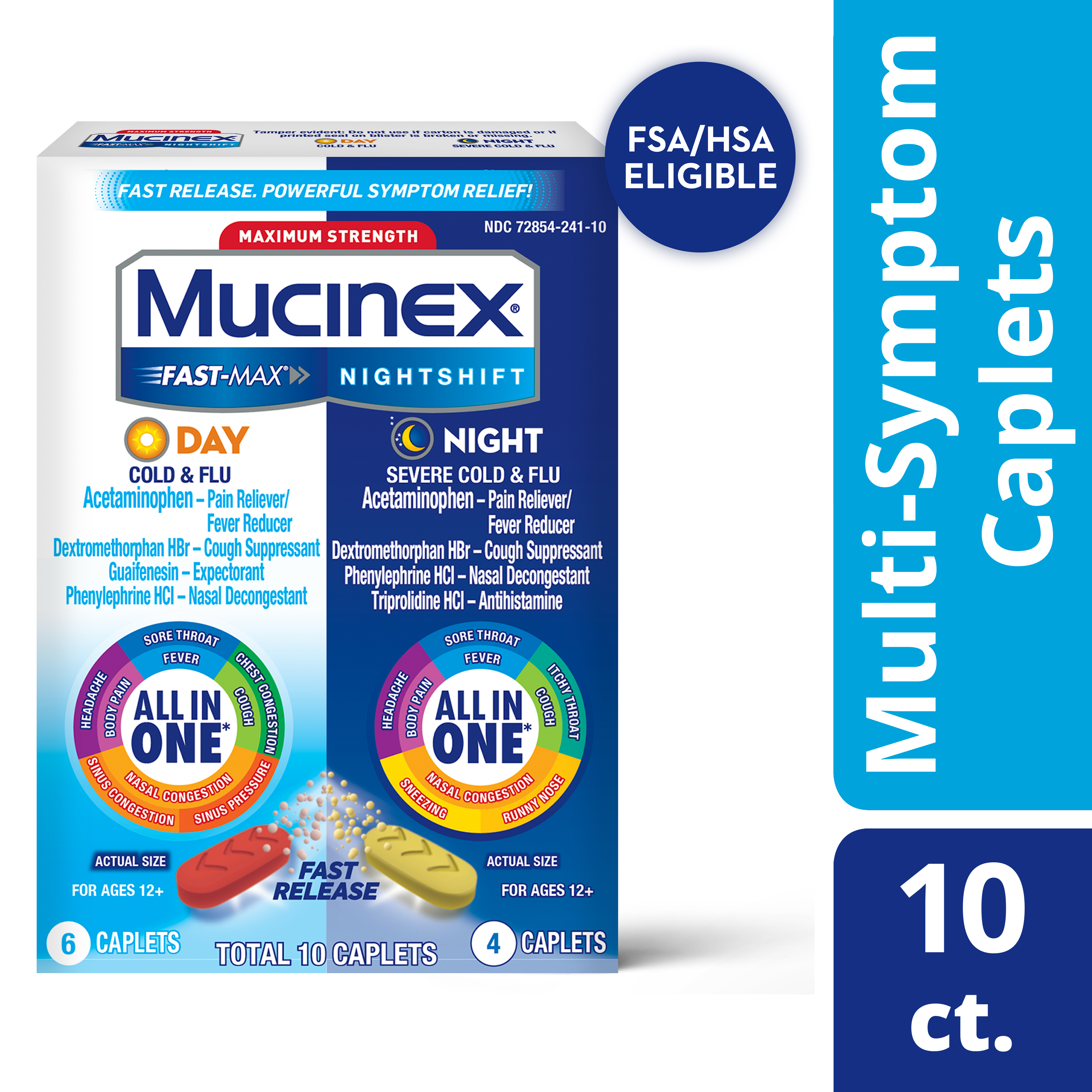 - MAXIMUM STRENGTH MUCINEX FAST-MAX DAY COLD & FLU & NIGHTSHIFT NIGHT SEVERE COLD & FLU: Fast Release, Powerful Multi-Symptom Relief medicine. 1 dose treats 9 symptoms - get back to what’s important thanks to the fast, powerful medicine