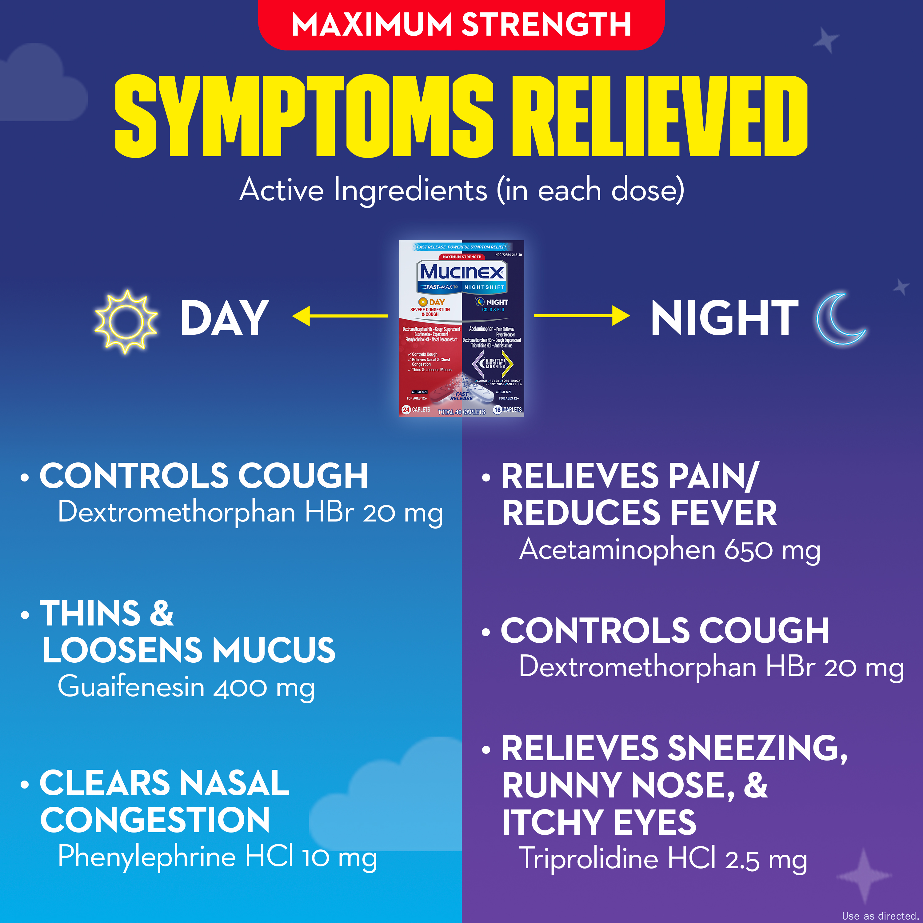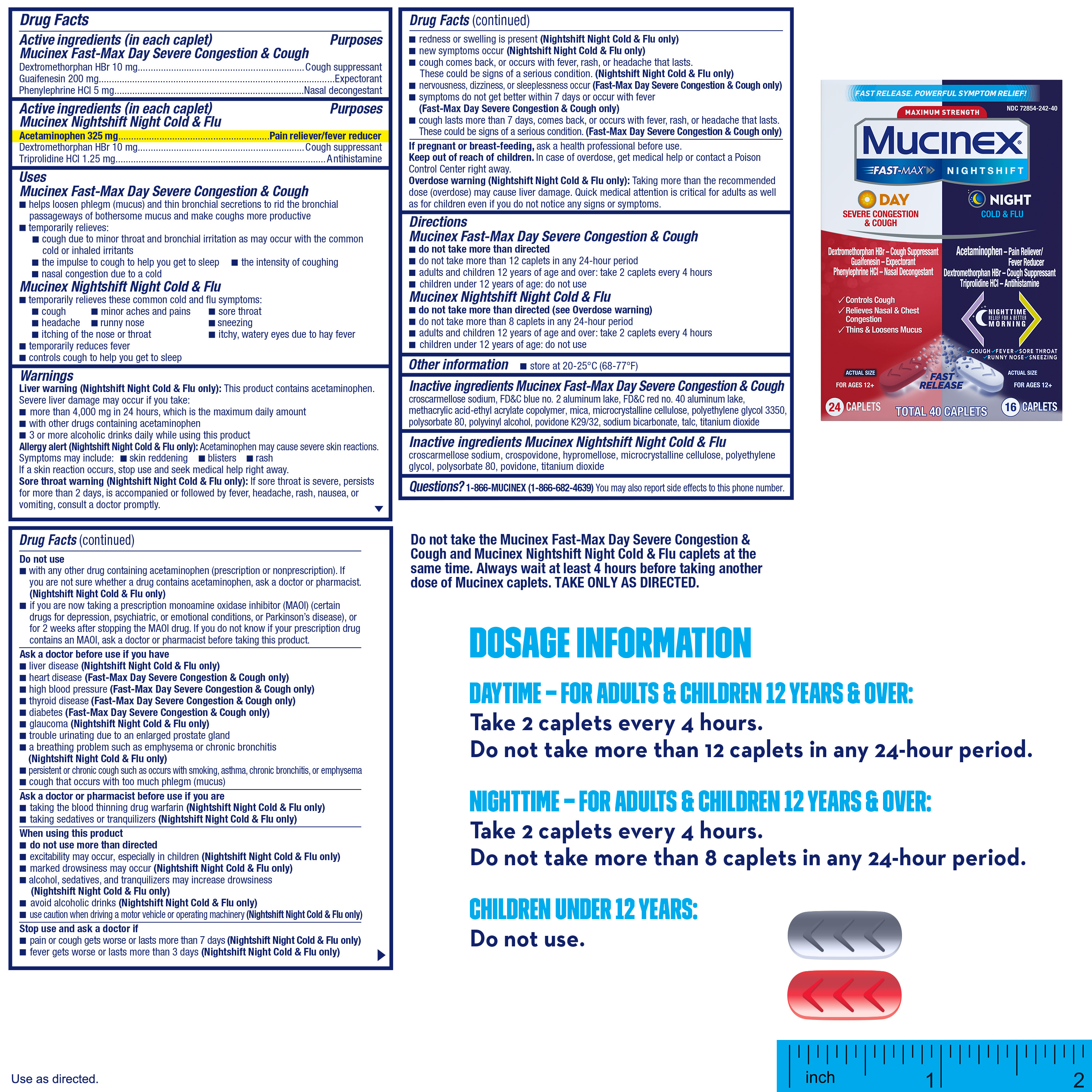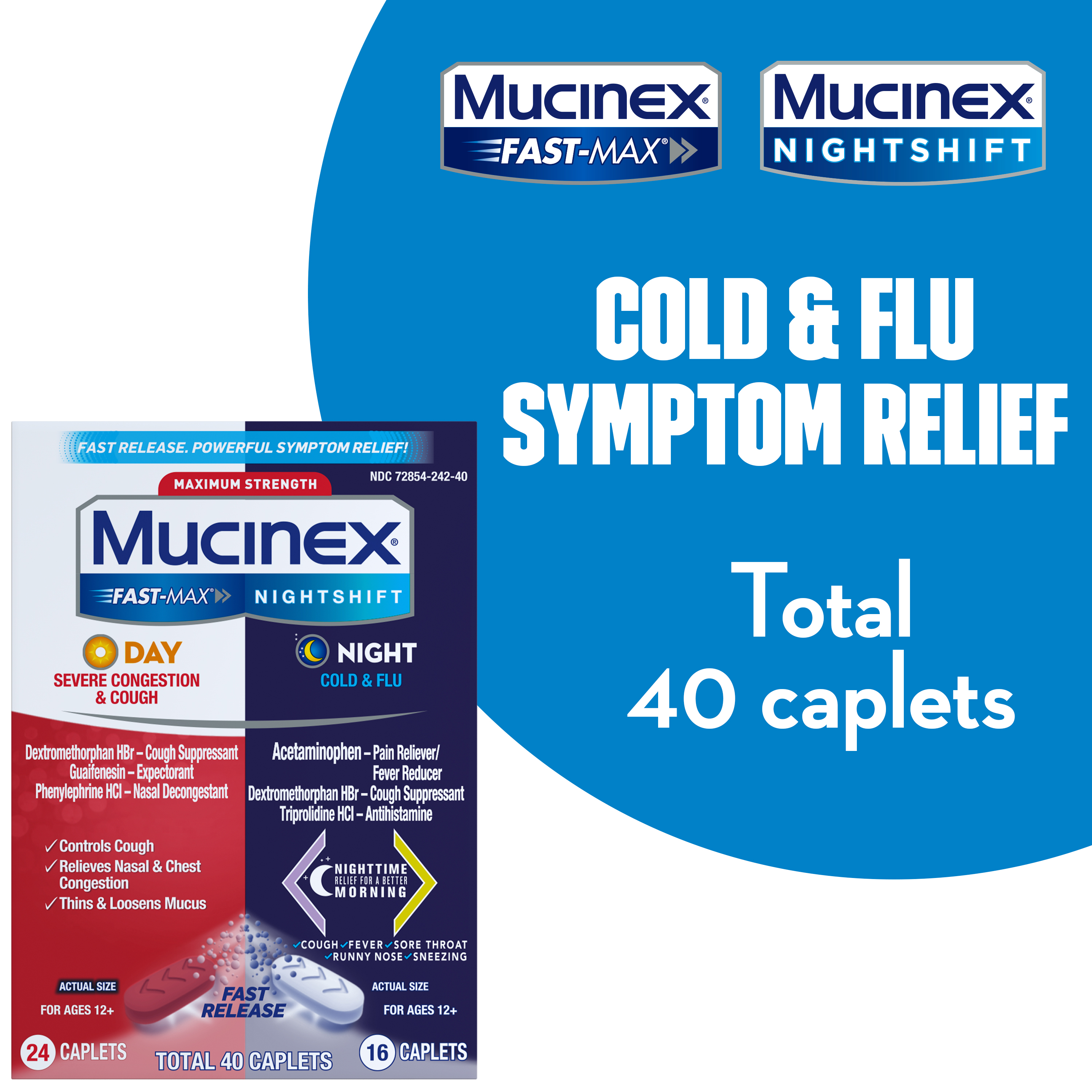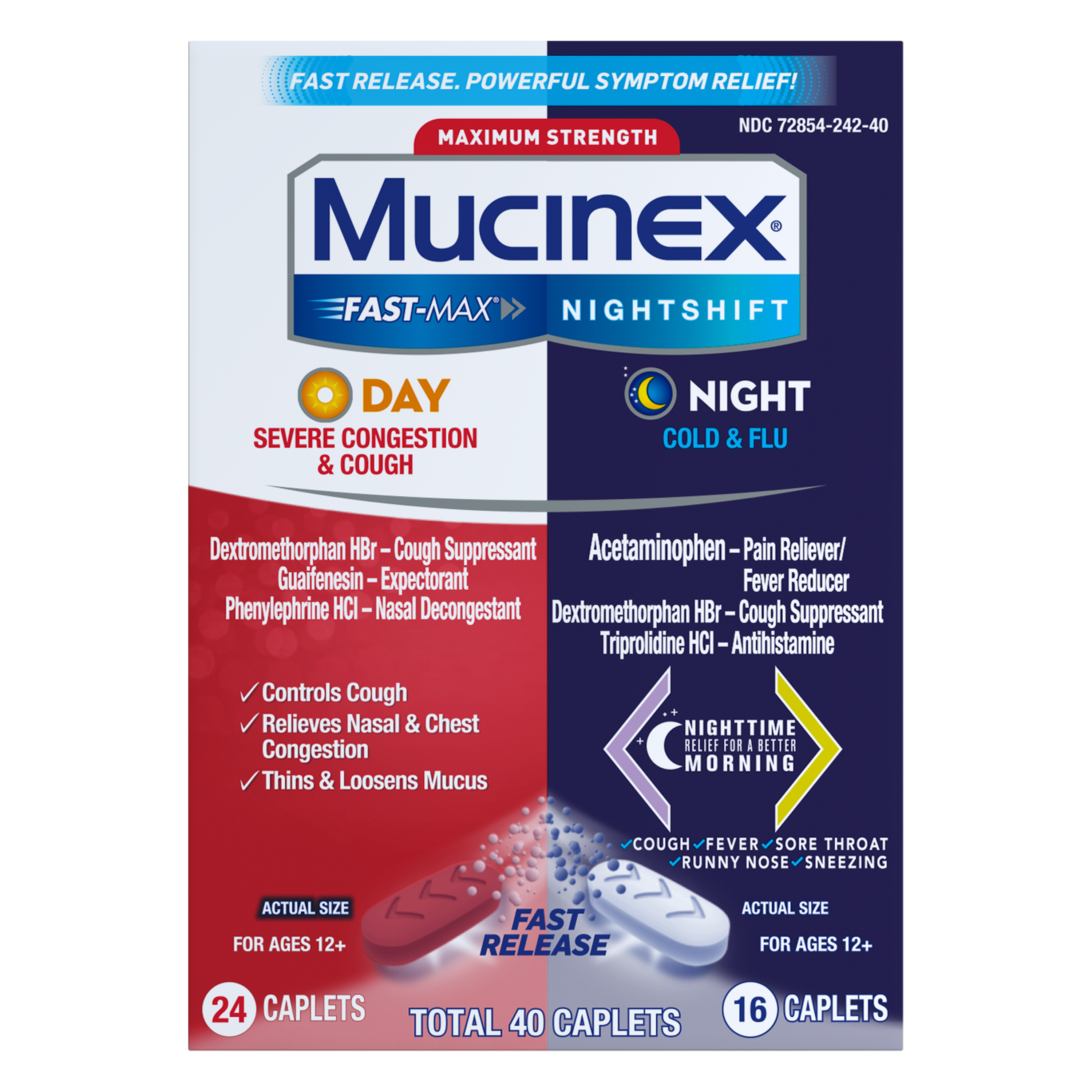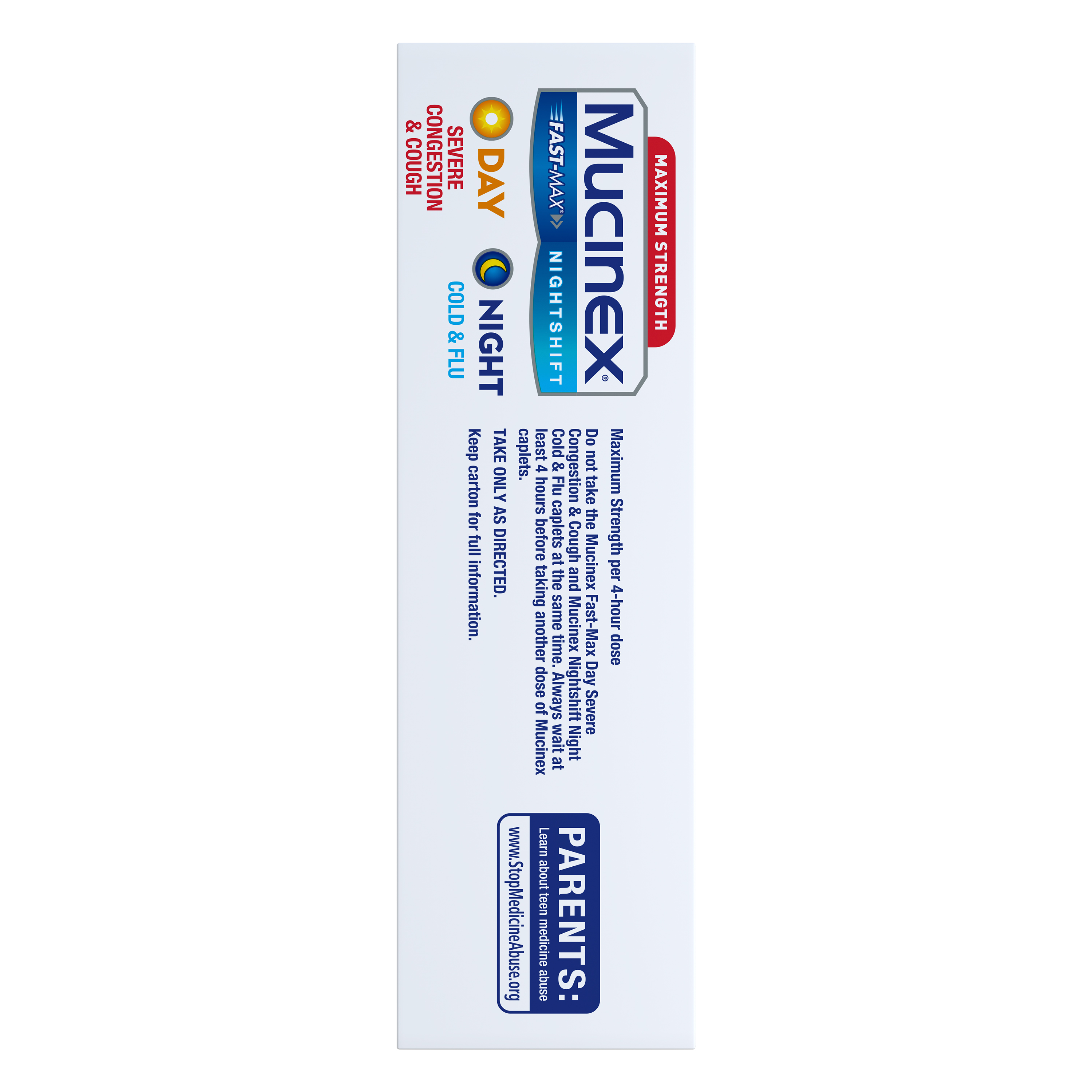 - MAXIMUM STRENGTH MUCINEX FAST-MAX DAY SEVERE CONGESTION & COUGH & NIGHTSHIFT NIGHT COLD & FLU: Fast Release, Powerful Multi-Symptom Relief medicine. Get back to what’s important thanks to the fast, powerful medicine