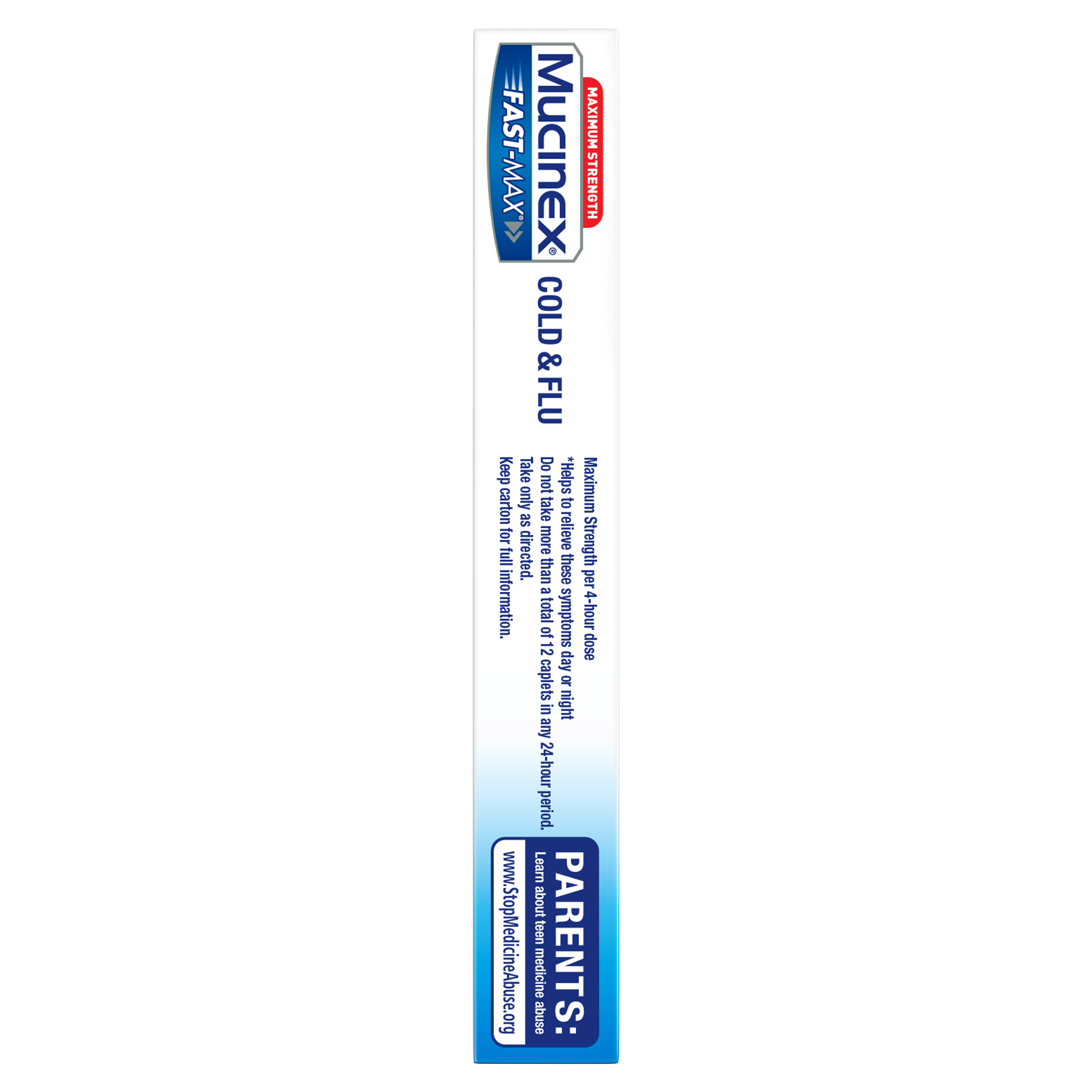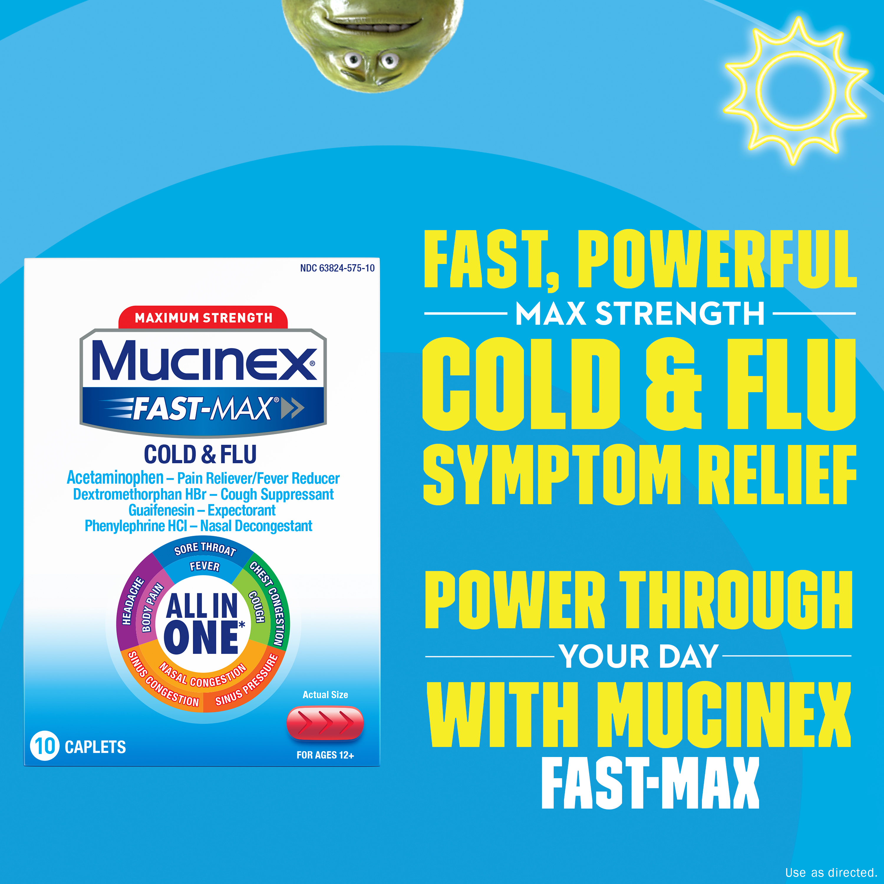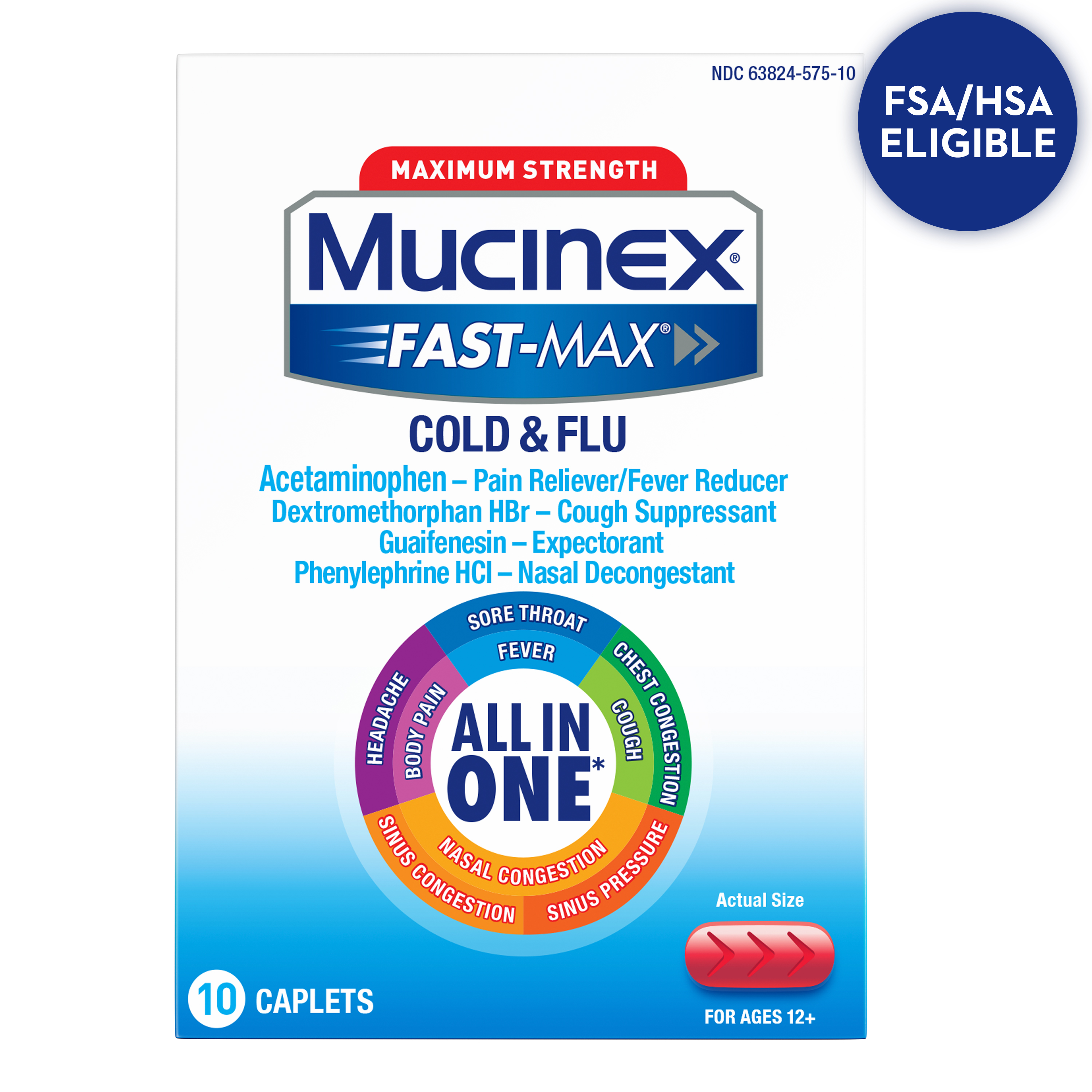- MUCINEX COLD & FLU ALL IN ONE: 1 Dose, 9 Symptom Relief! Mucinex Fast-Max Cold & Flu All in One caplets Relieve Headache & Body Pain, Reduce Fever & Sore Throat, Nasal & Chest Congestion, Thin & Loosen Mucus, also relieve Sinus Pressure & Sinus Congestion & Control Cough. Maximum strength formula so you can power through your day.