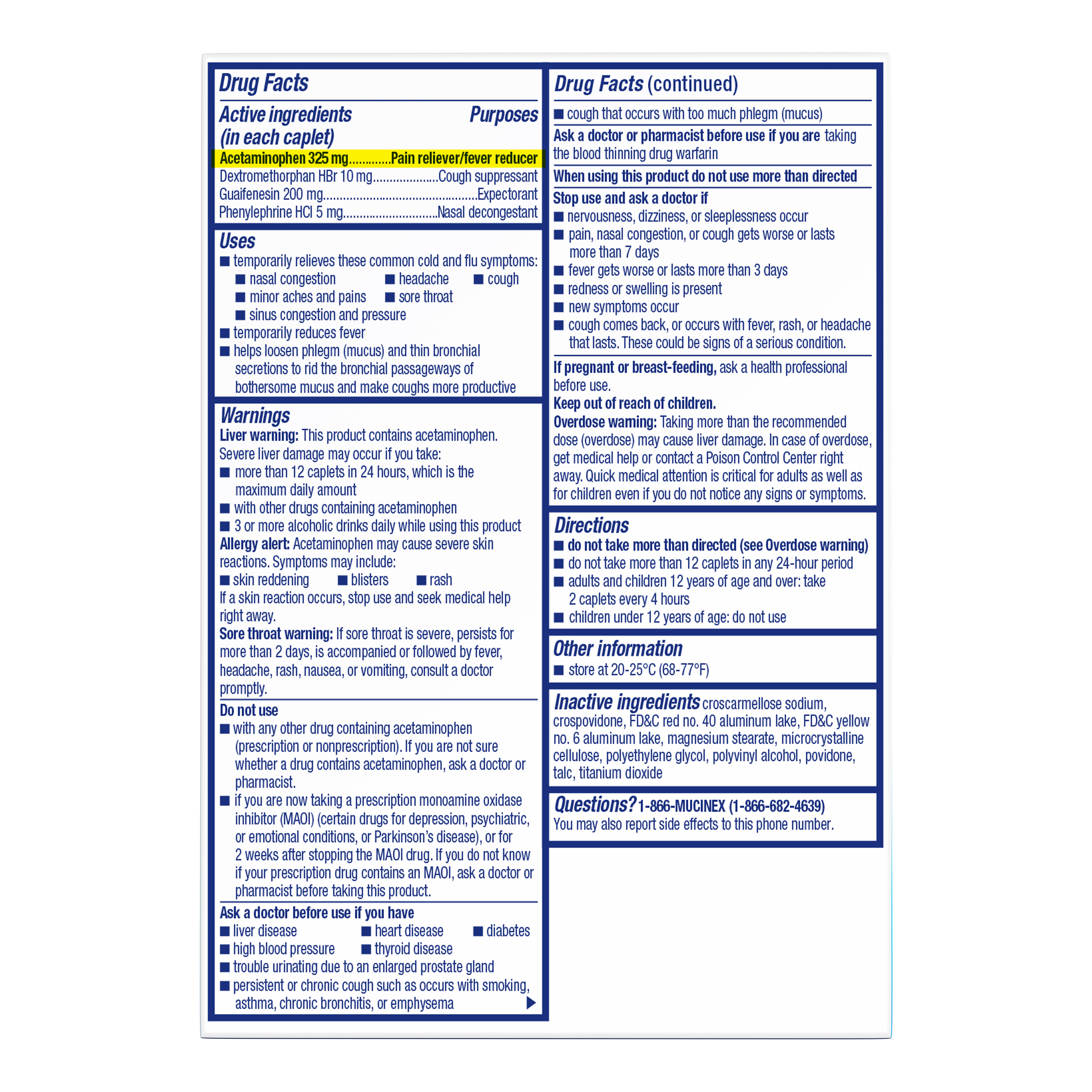 - ACTIVE INGREDIENTS PER CAPLET: Acetaminophen (325 mg) - Pain Reliever/ Fever Reducer; Dextromethorphan (10 mg) - Cough Suppressant; Guaifenesin (200 mg) - Expectorant; Phenylephrine HCl (5 mg) - Nasal Decongestant