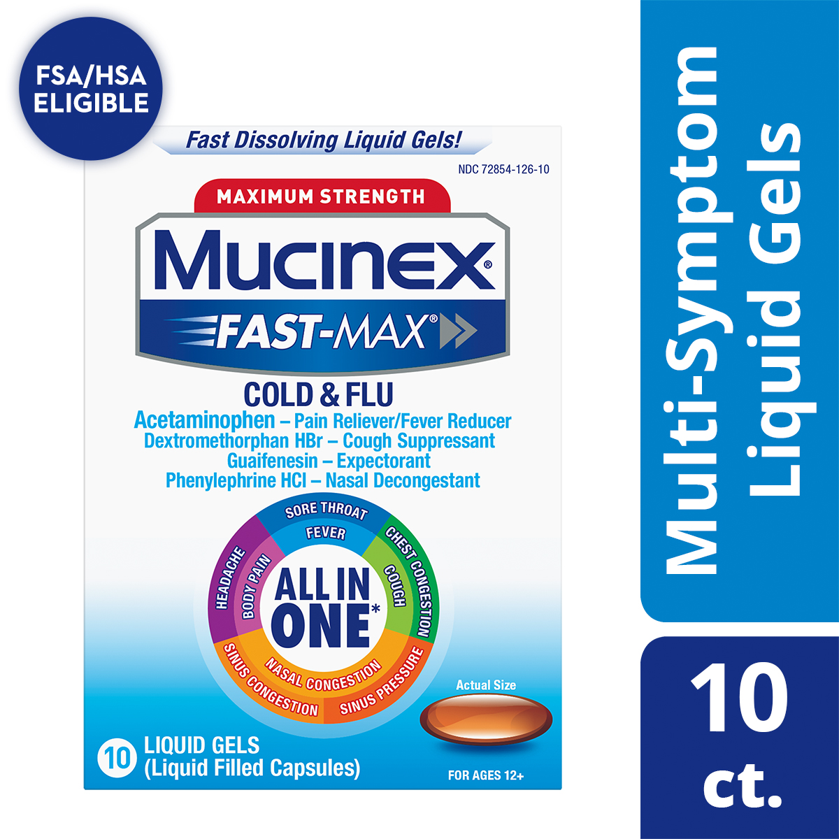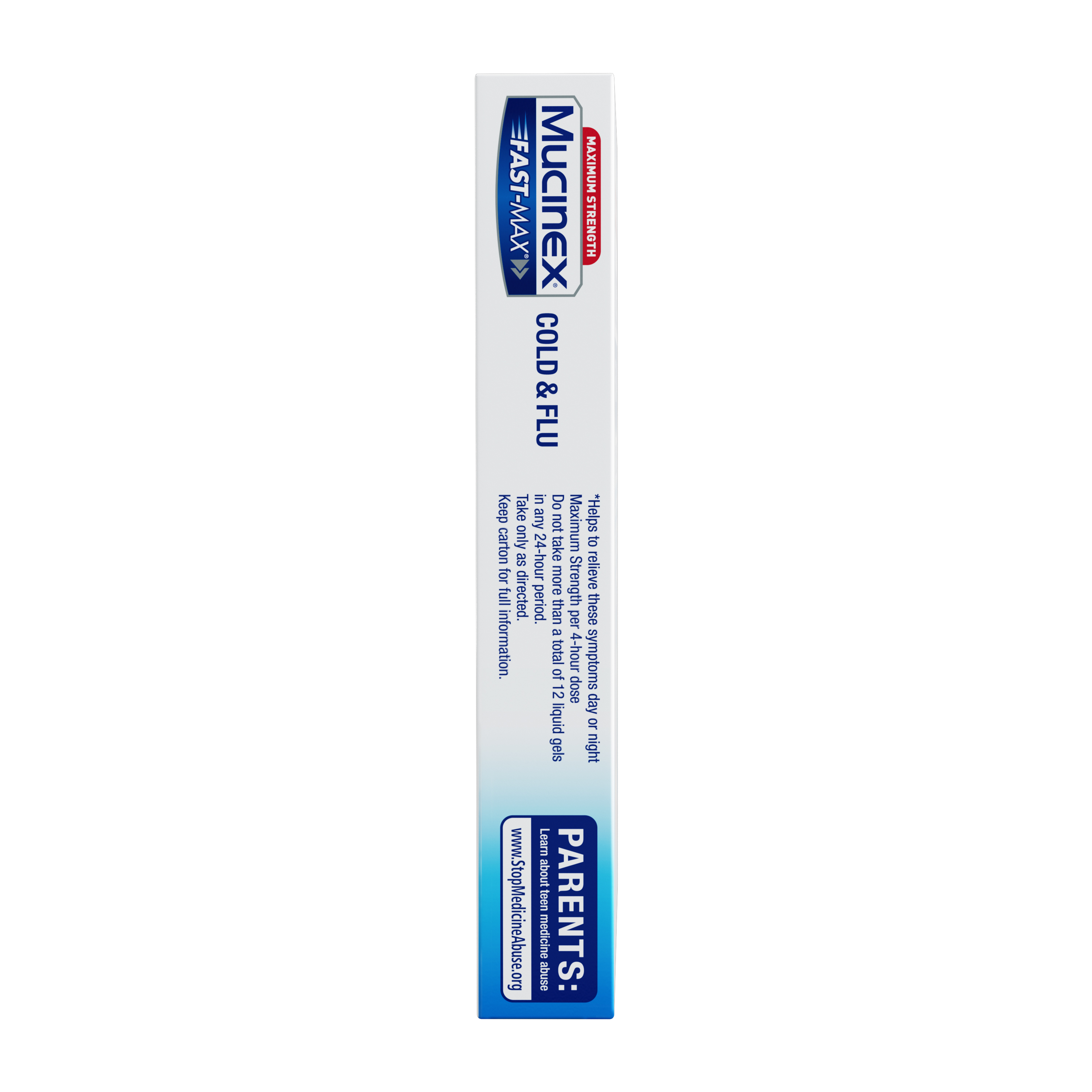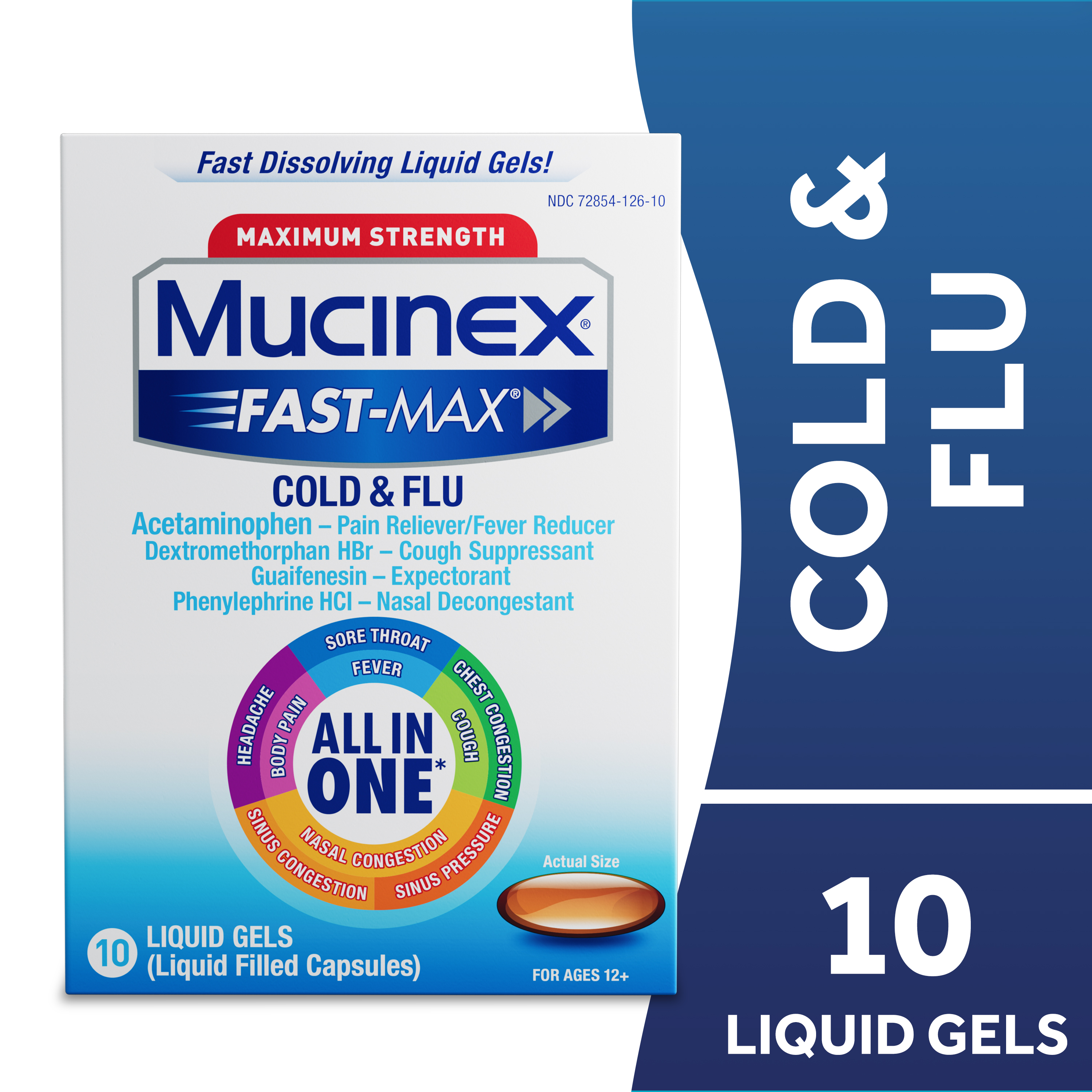 - MAXIMUM STRENGTH RELIEF: Maximum Strength Mucinex Fast-Max Cold & Flu All In One helps reduce fever and relieve cough, sore throat, stuffy nose, chest & nasal congestion, headache and minor aches and pains