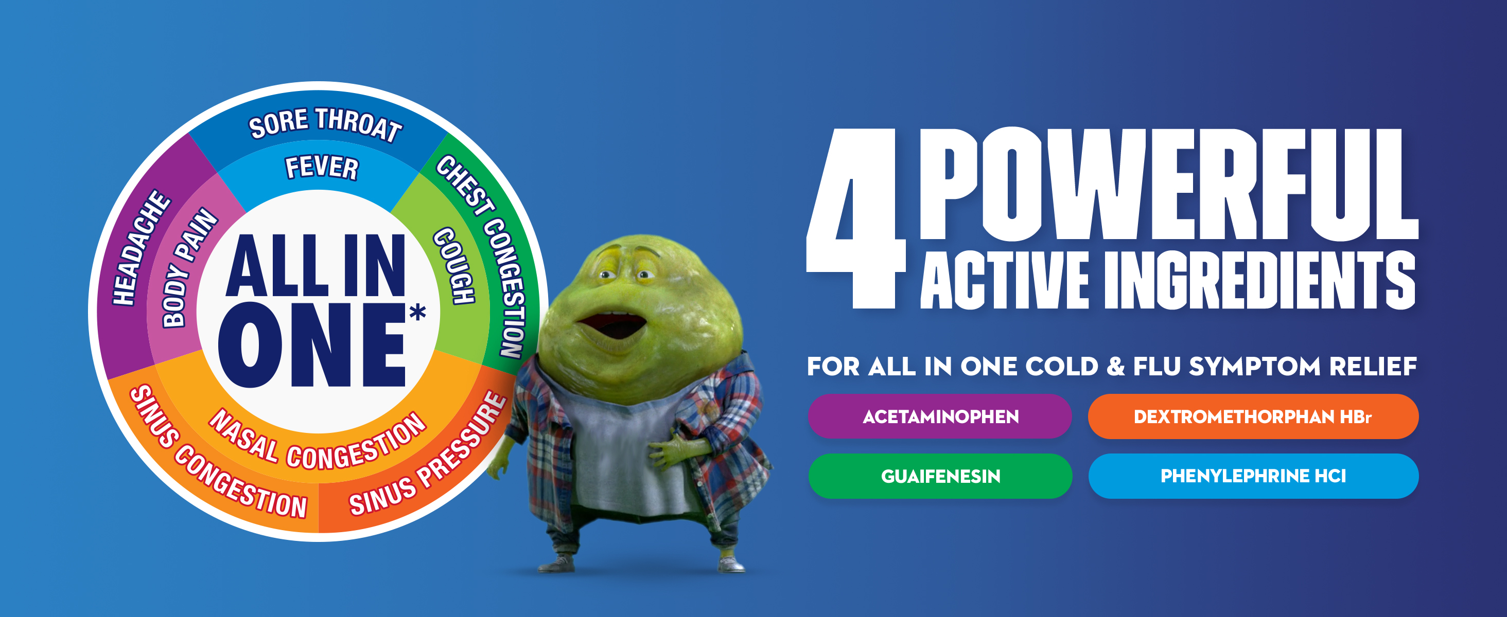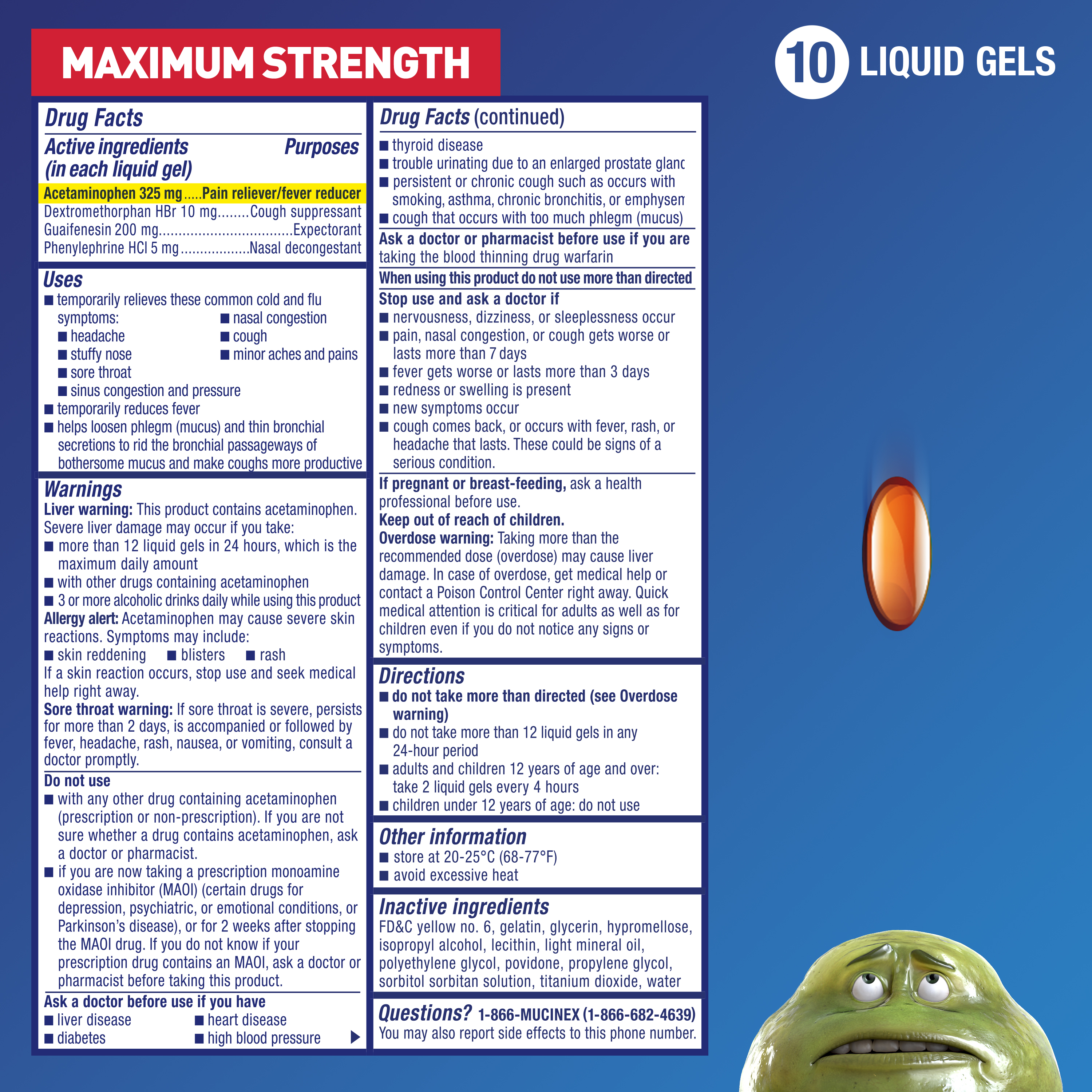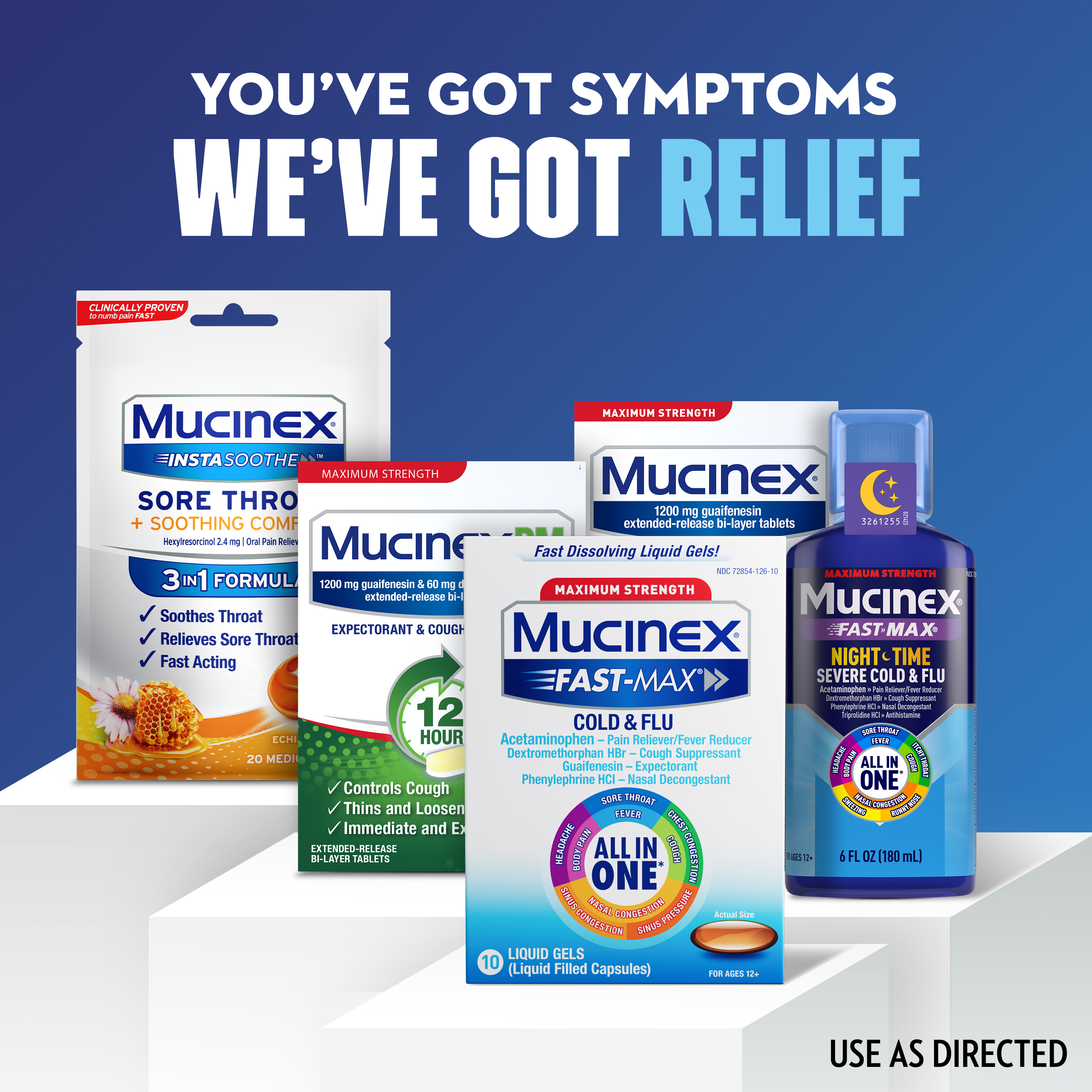 - MAXIMUM STRENGTH RELIEF: Maximum Strength Mucinex Fast-Max Cold & Flu All In One helps reduce fever and relieve cough, sore throat, stuffy nose, chest & nasal congestion, headache and minor aches and pains