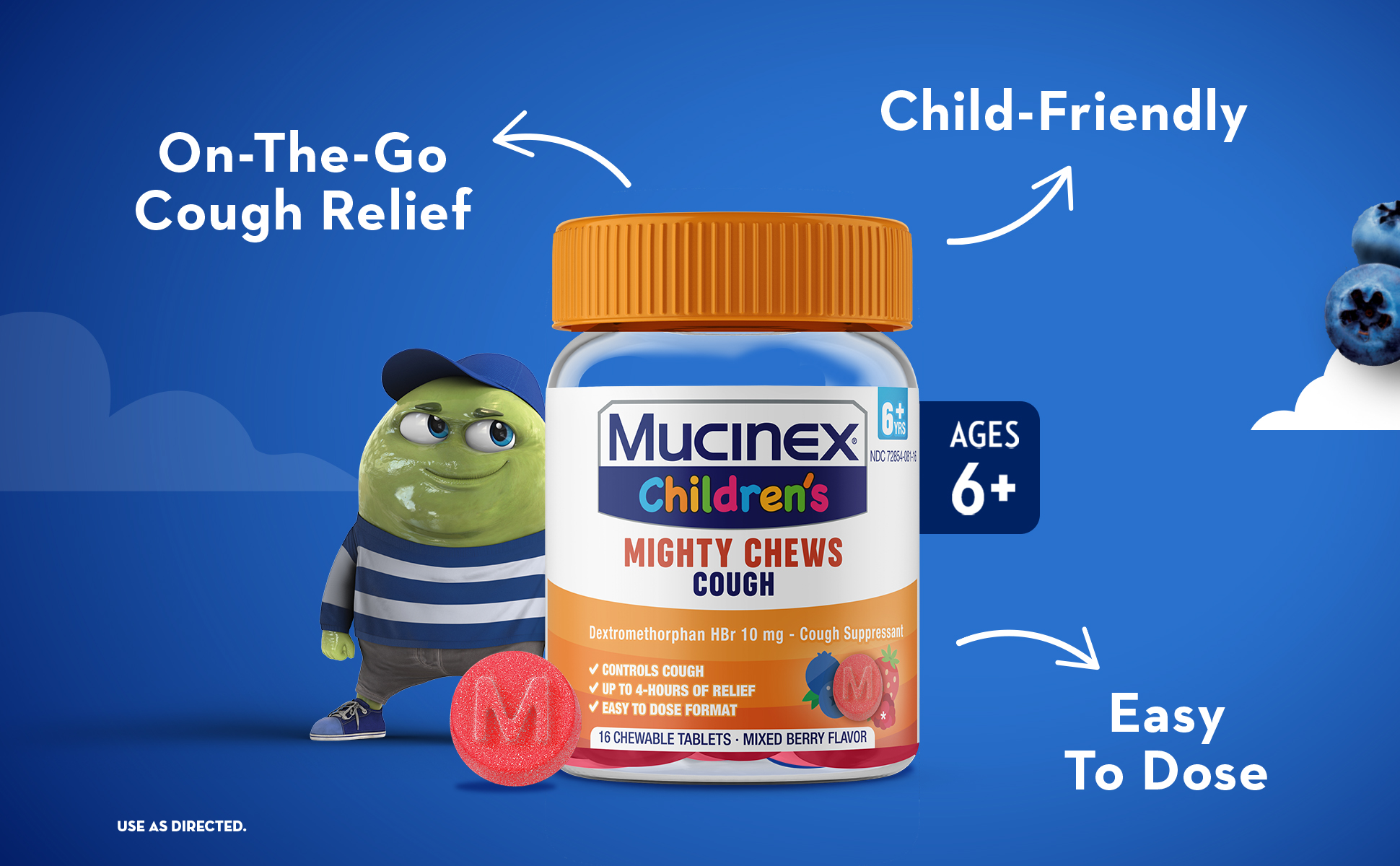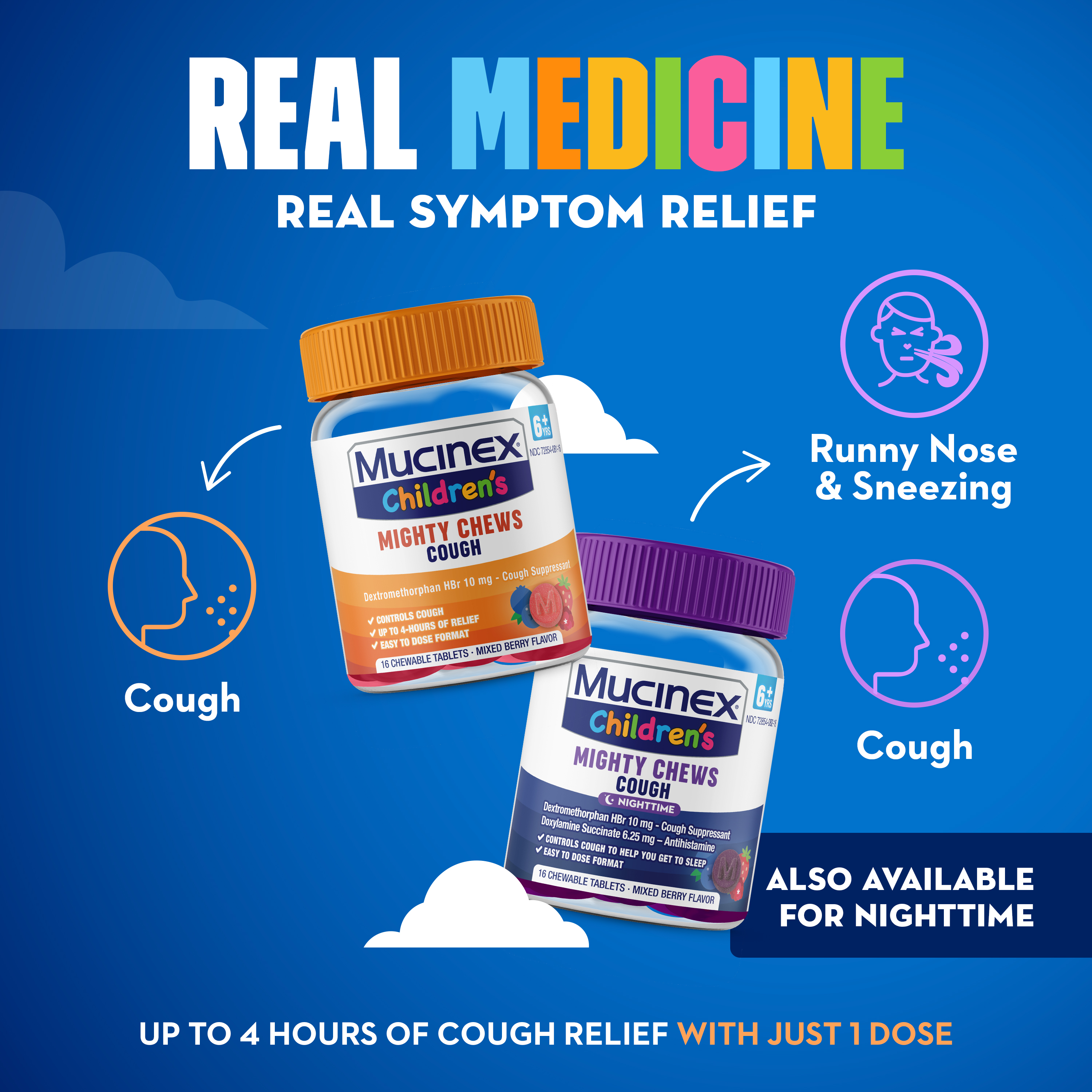 - MUCINEX CHILDREN'S COUGH MEDICINE: Mucinex Children's Mighty Chews are formulated for children 6 years of age and older; When your child is sick, give them real medicine for real symptom relief