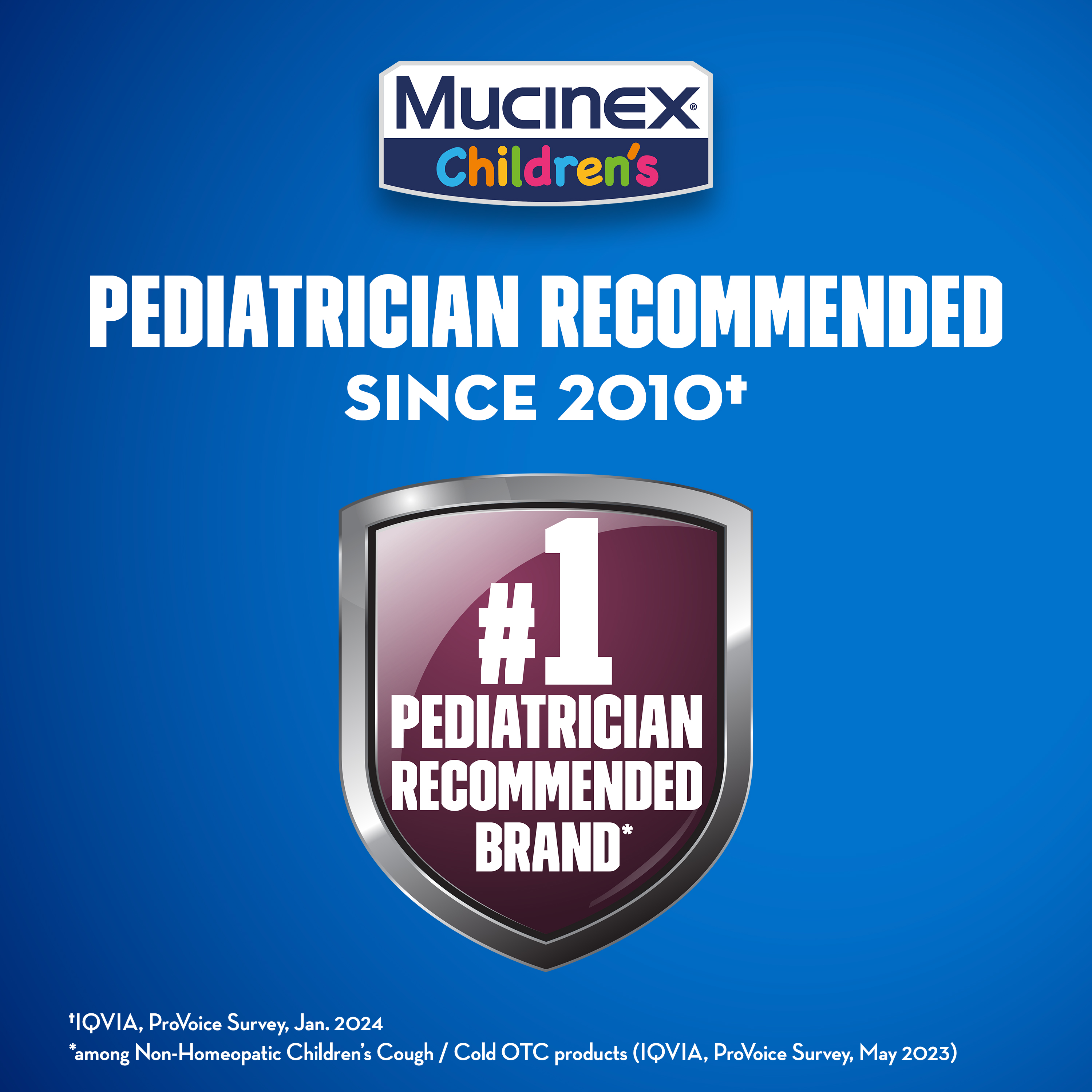 - PEDIATRICIAN RECOMMENDED SINCE 2010: Mucinex is the #1 Pediatrician Recommended Brand among Non-Homeopathic Children’s Cough / Cold OTC products (IQVIA, ProVoice Survey, May 2023)