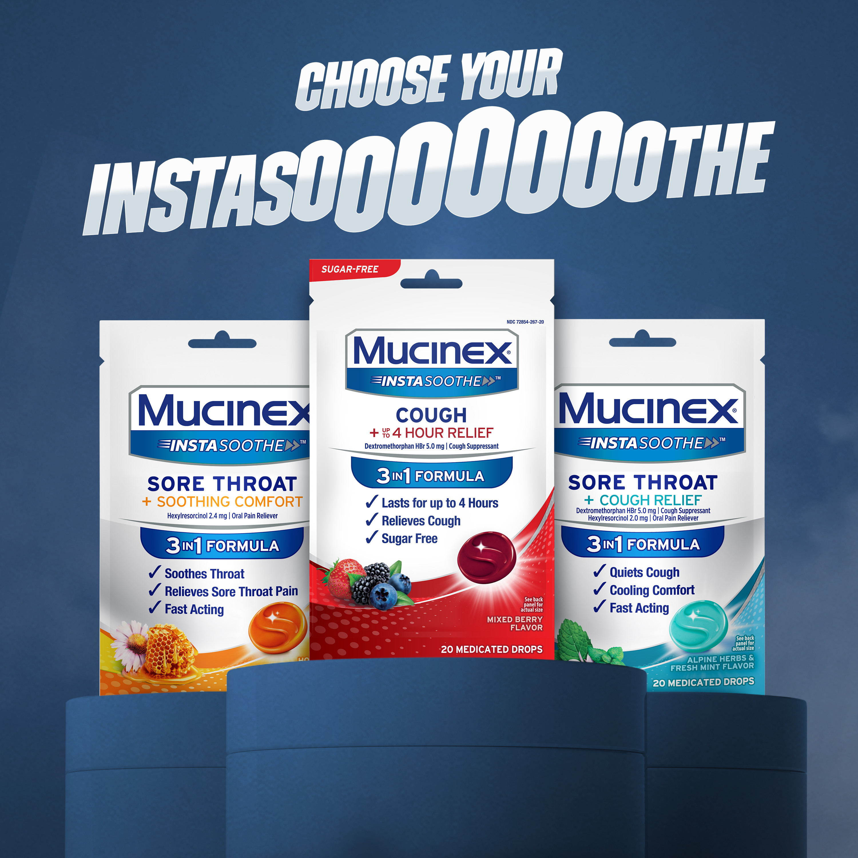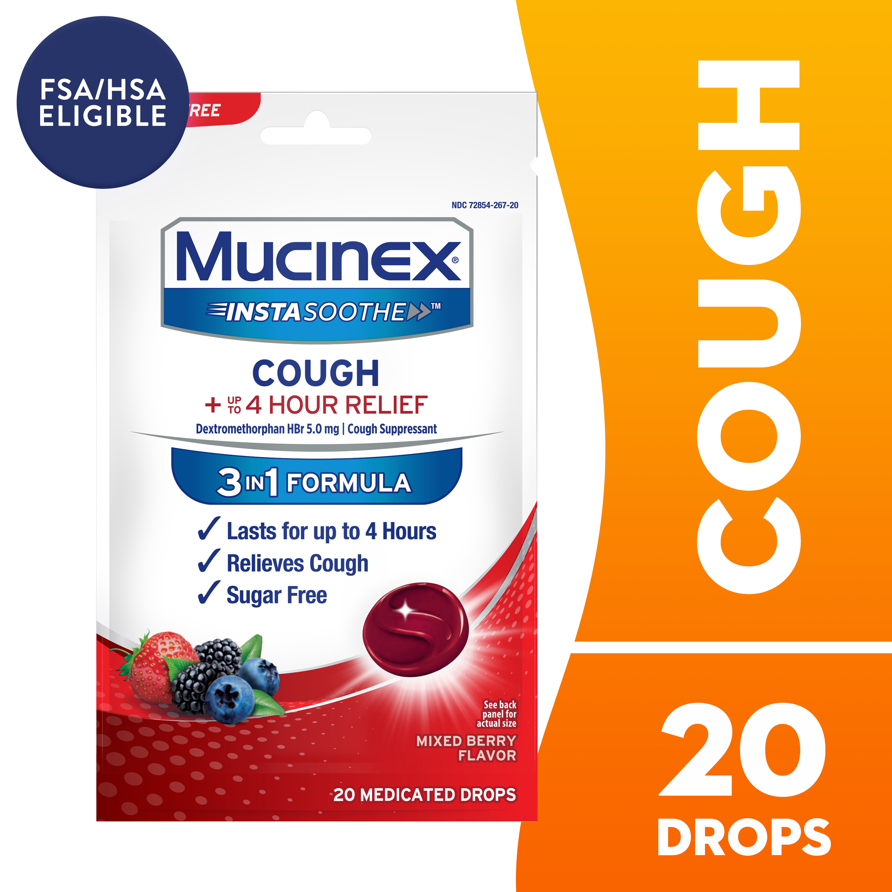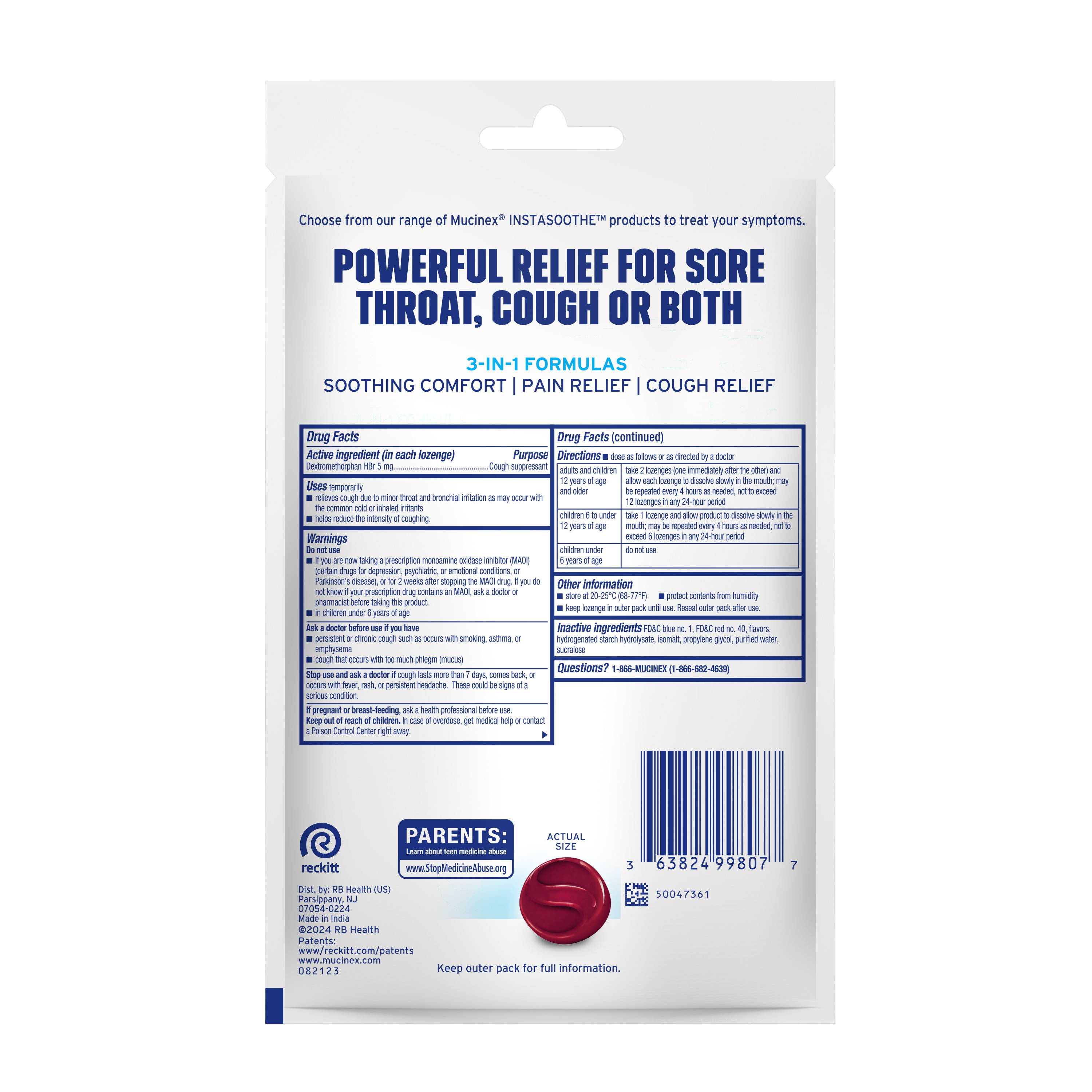 - SUGAR FREE COUGH DROPS: Mucinex Instasoothe Mixed Berry Medicated Cough Drops are sugar free and do not contain aspartame