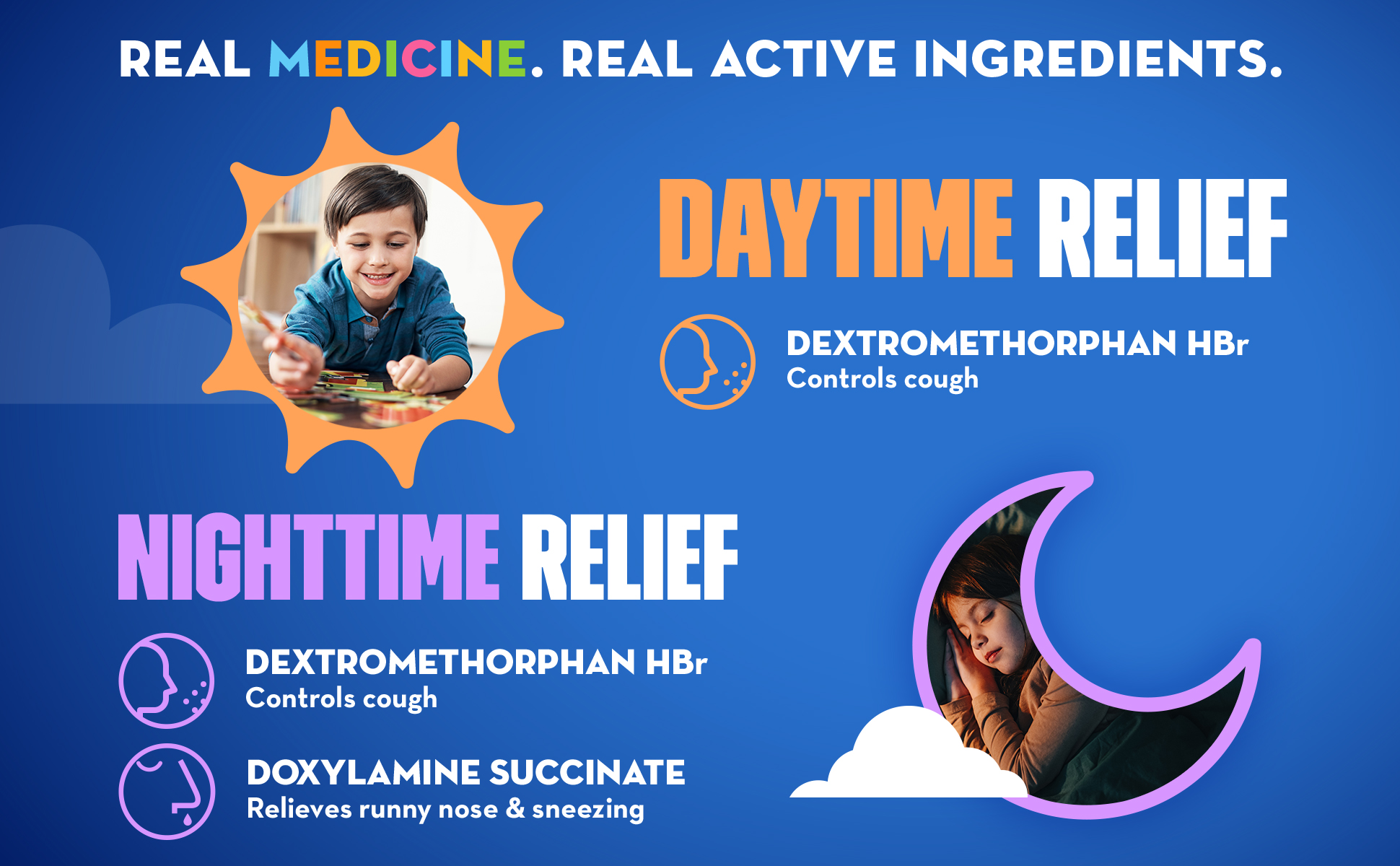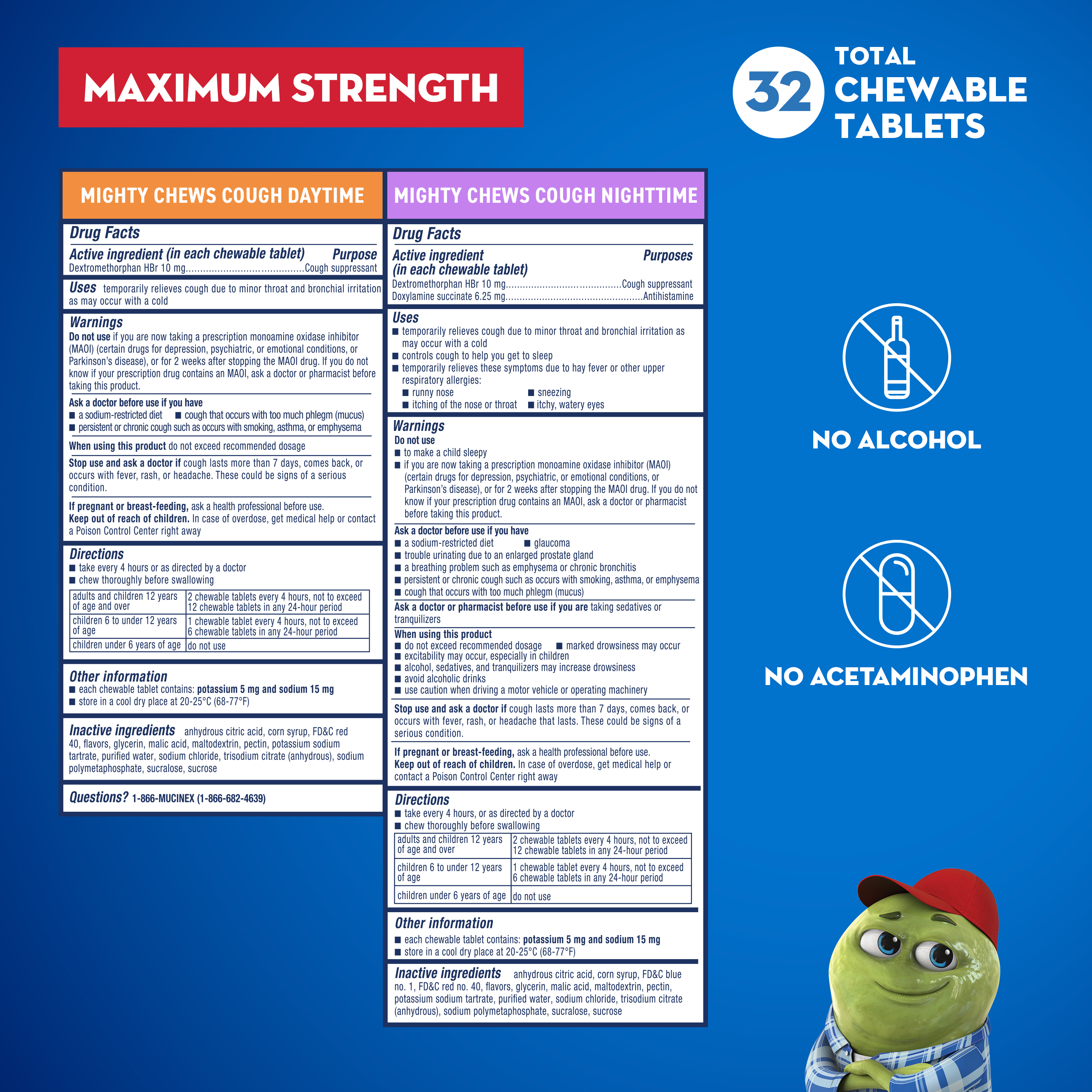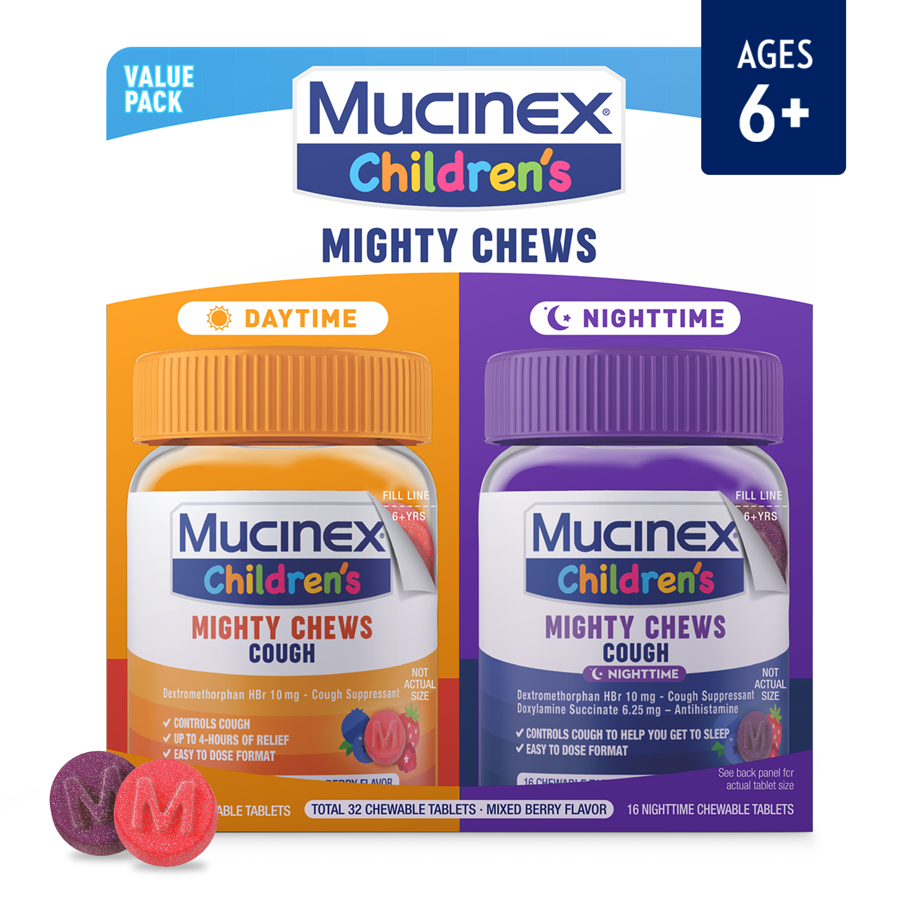 - REAL MEDICINE: Mucinex Children's Mighty Chews contain real active ingredients to help your child feel better; Dextromethorphan HBr is a cough suppressant & Doxylamine Succinate (night tablets only) is an antihistamine