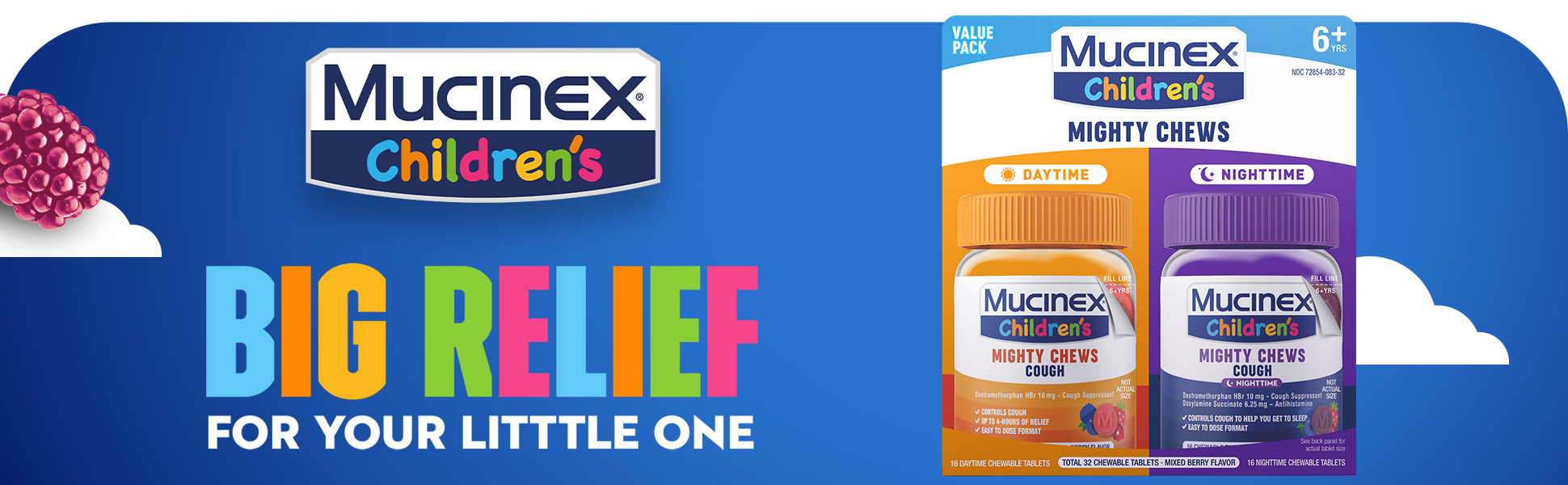 - BIG RELIEF FOR YOUR LITTLE ONE: Mucinex Children's Mighty Chews Cough mixed berry flavor chewable tablets are free of alcohol and acetaminophen