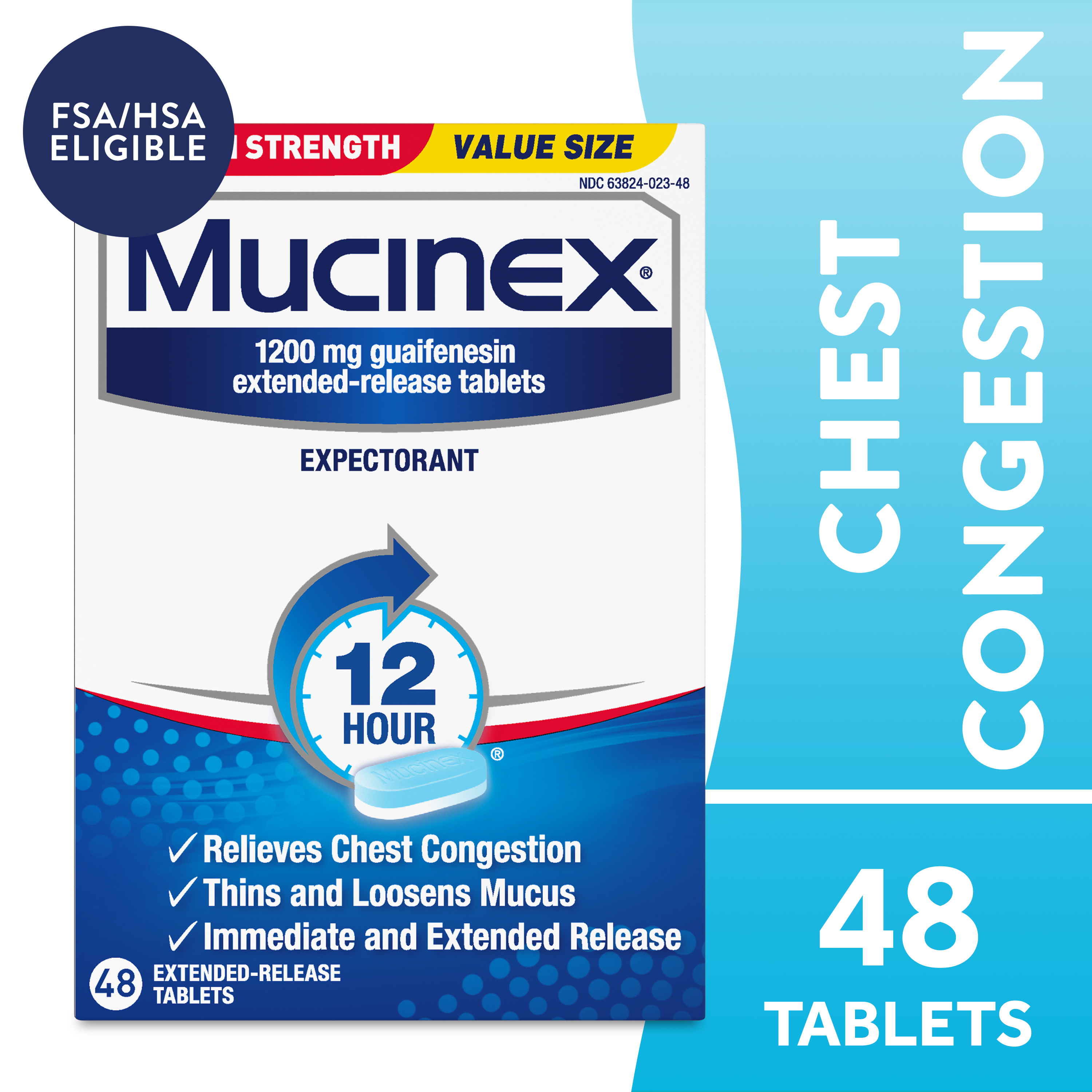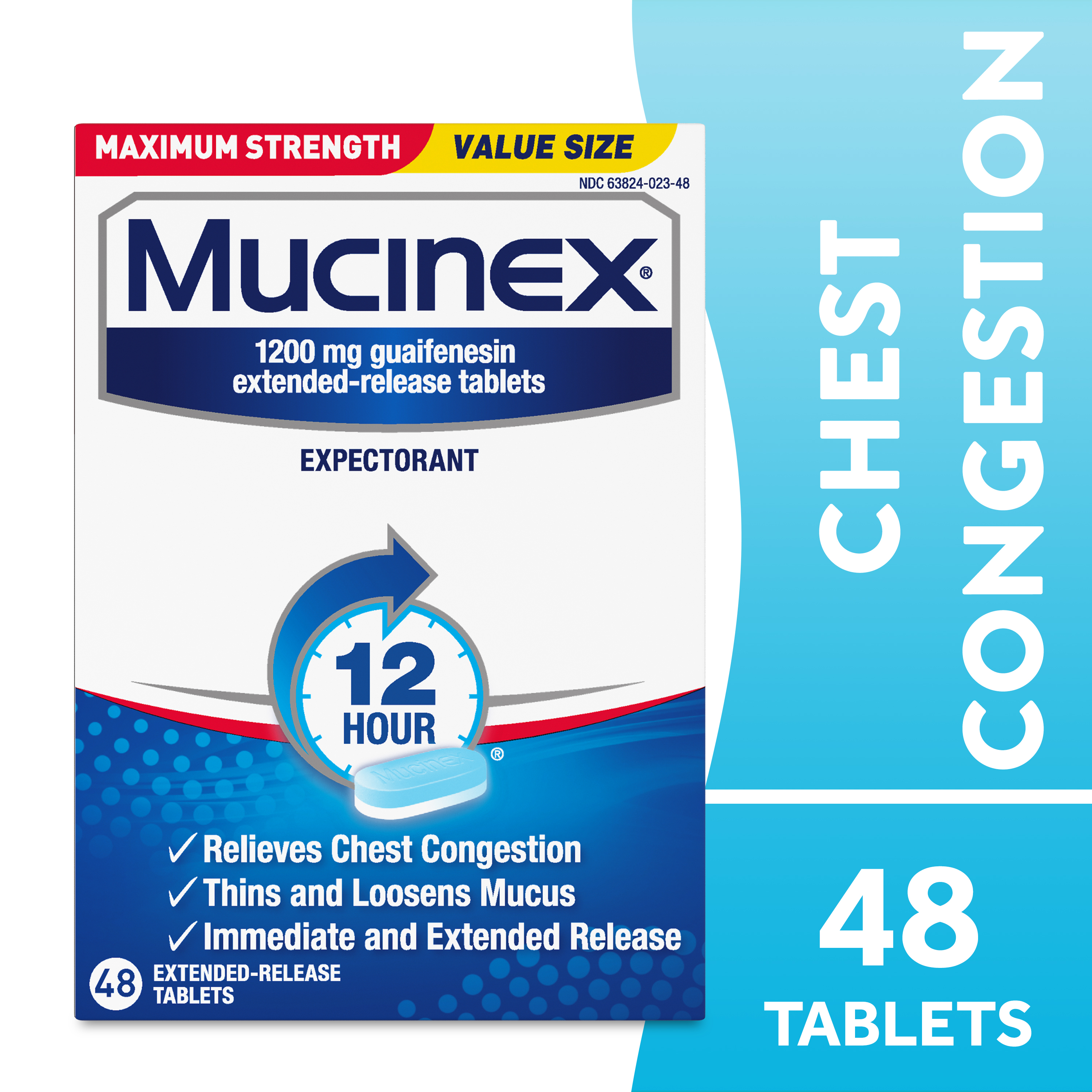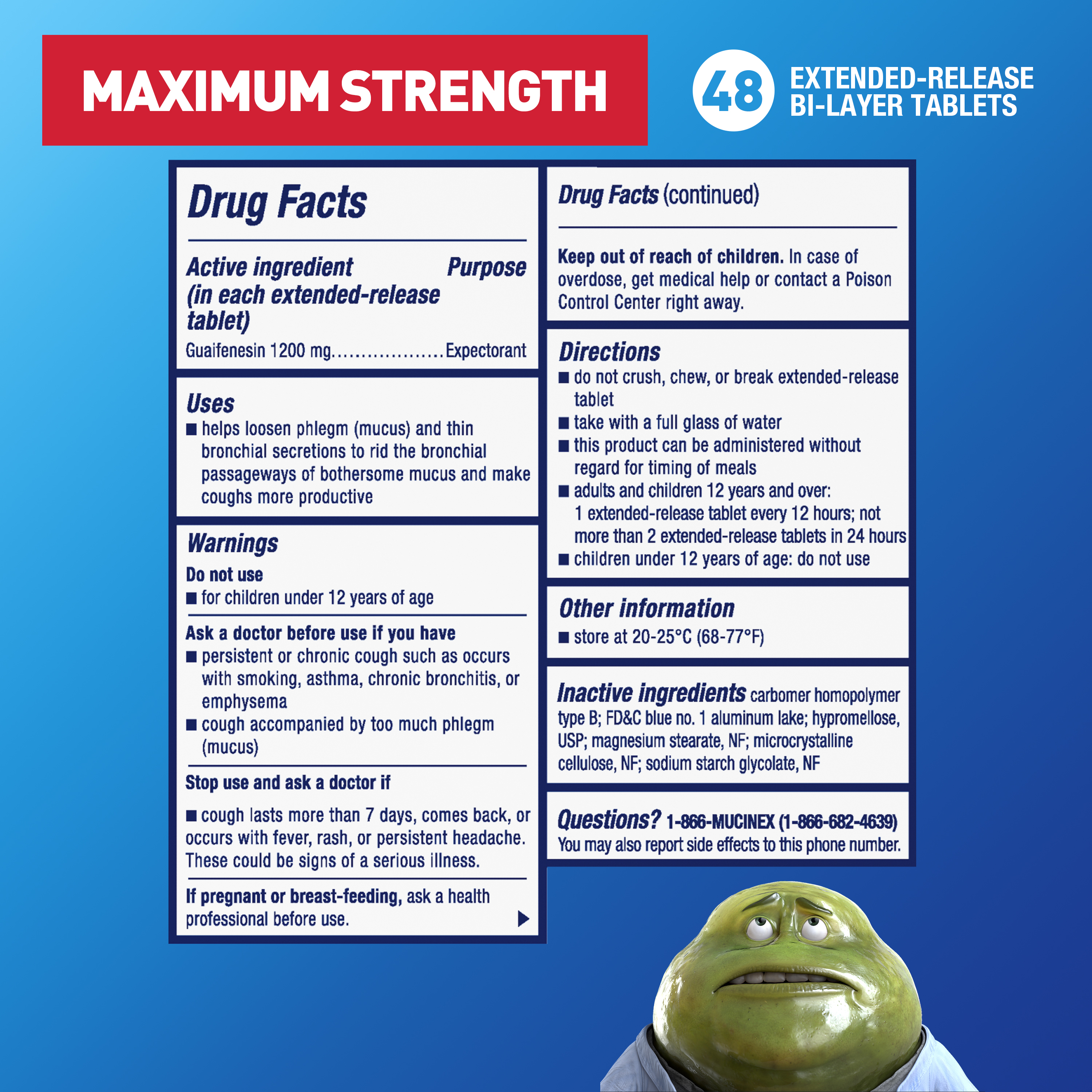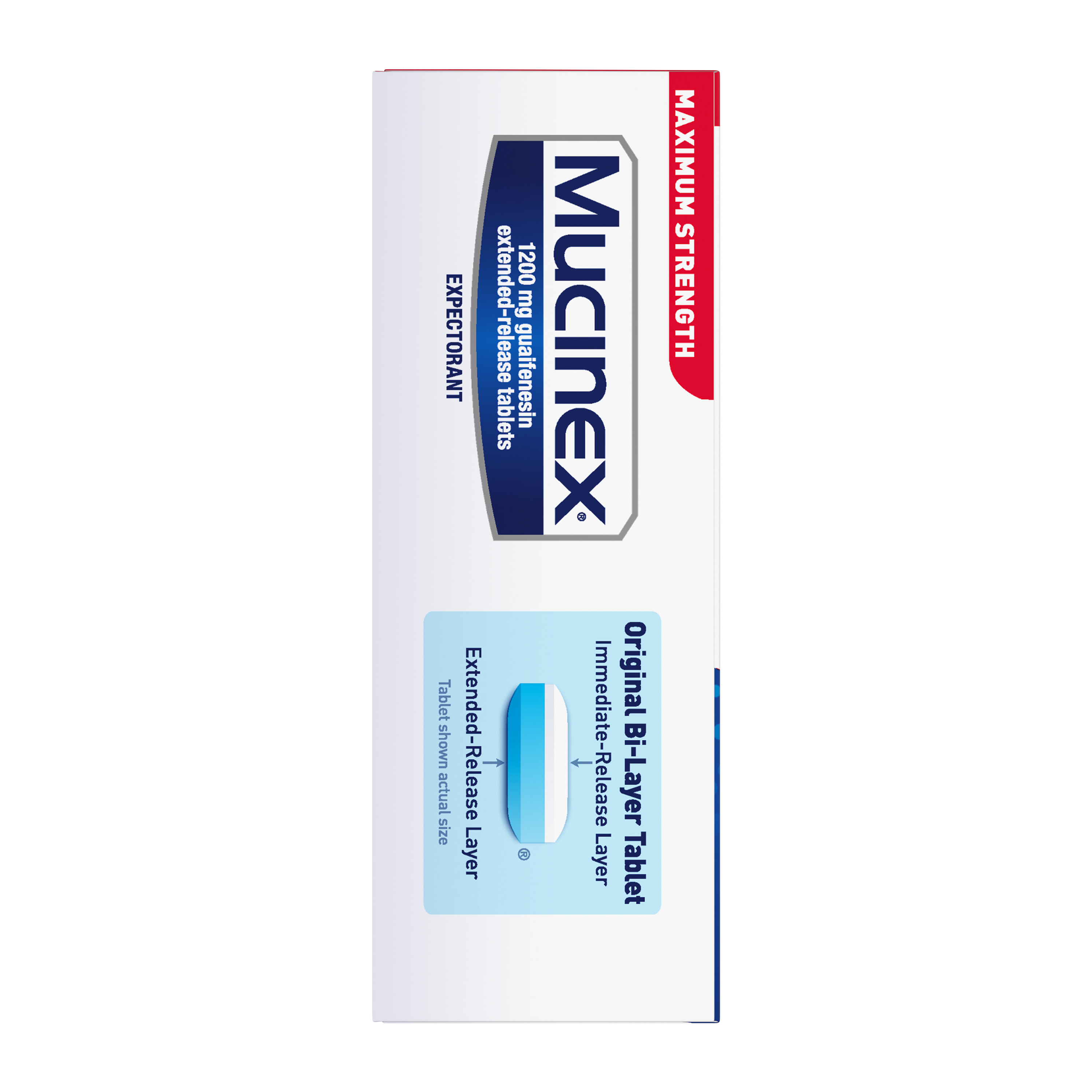 - EXTENDED RELEASE GUAIFENESIN: Experience long-lasting excess mucus relief with Mucinex's 12hr maximum strength extended-release 1200 mg guaifenesin bi-layer tablets with immediate & extended release