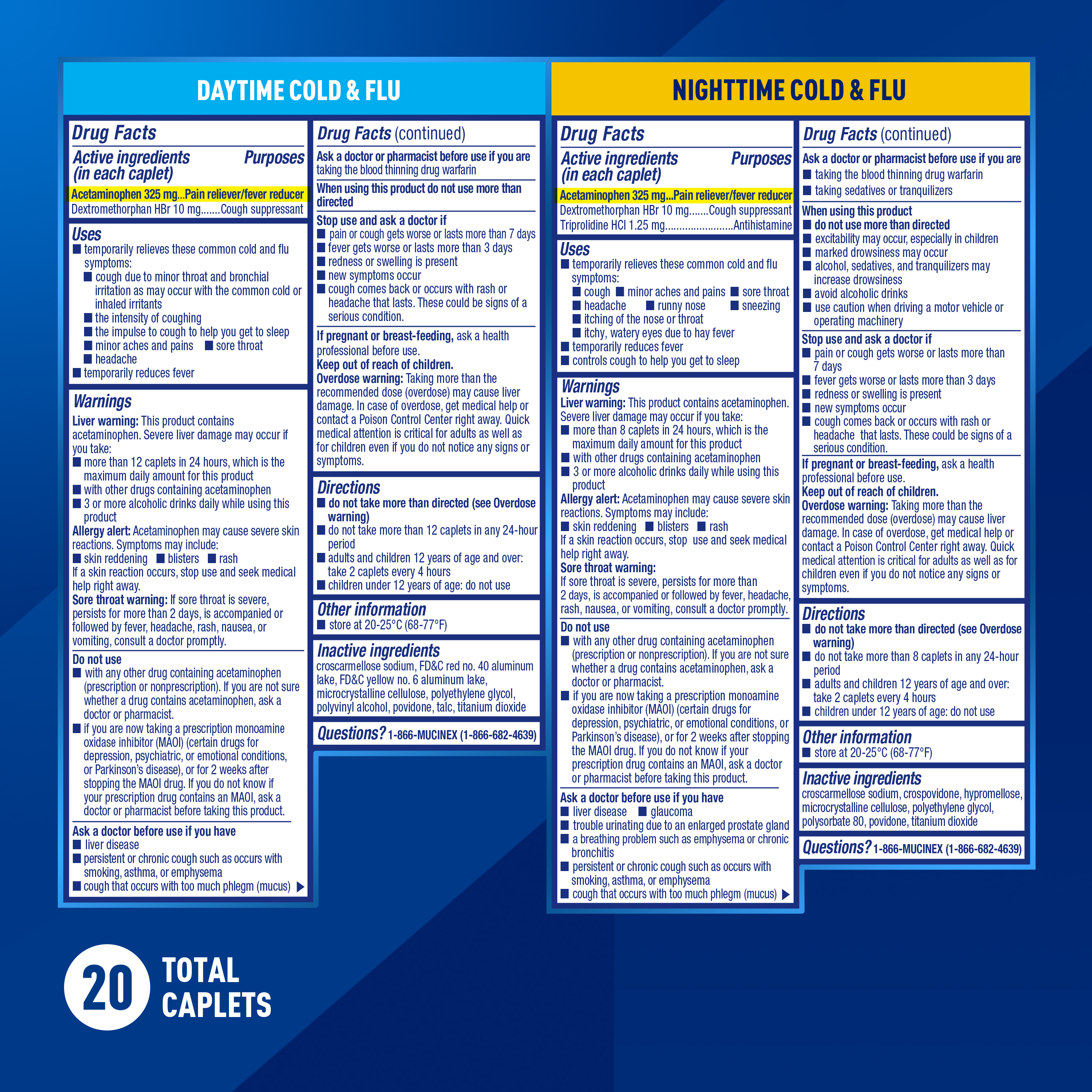 | Bullet Features | - COLD AND FLU MEDICINE: Mucinex Fast-Max Daytime Cold & Flu & Nighttime Cold & Flu Caplets give powerful relief for headache, sore throat, body pain, fever, cough, runny nose and more