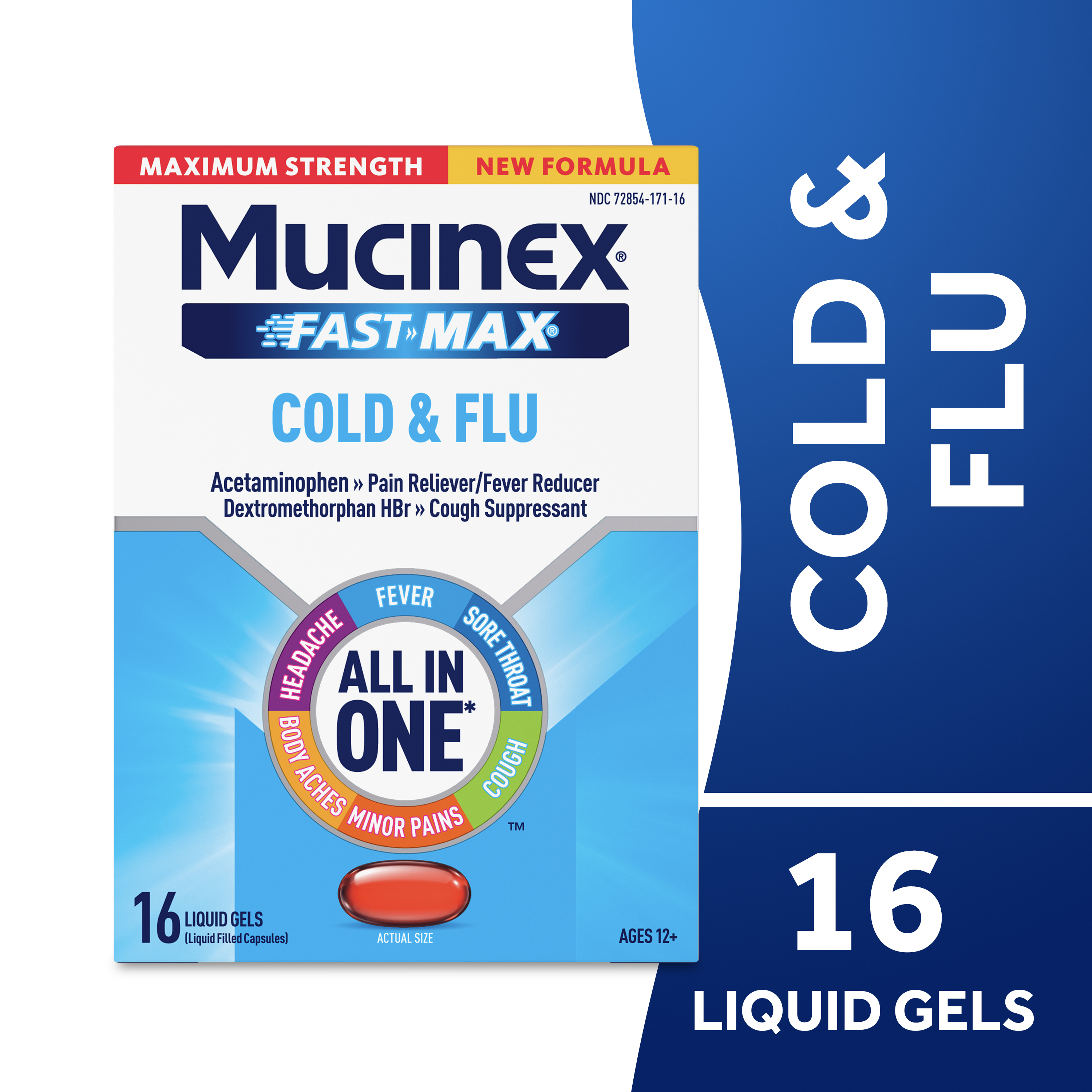 - COLD AND FLU MEDICINE: Mucinex Fast-Max Cold & Flu liquid gels provide powerful relief for headache, sore throat, minor pains, fever, cough and body aches