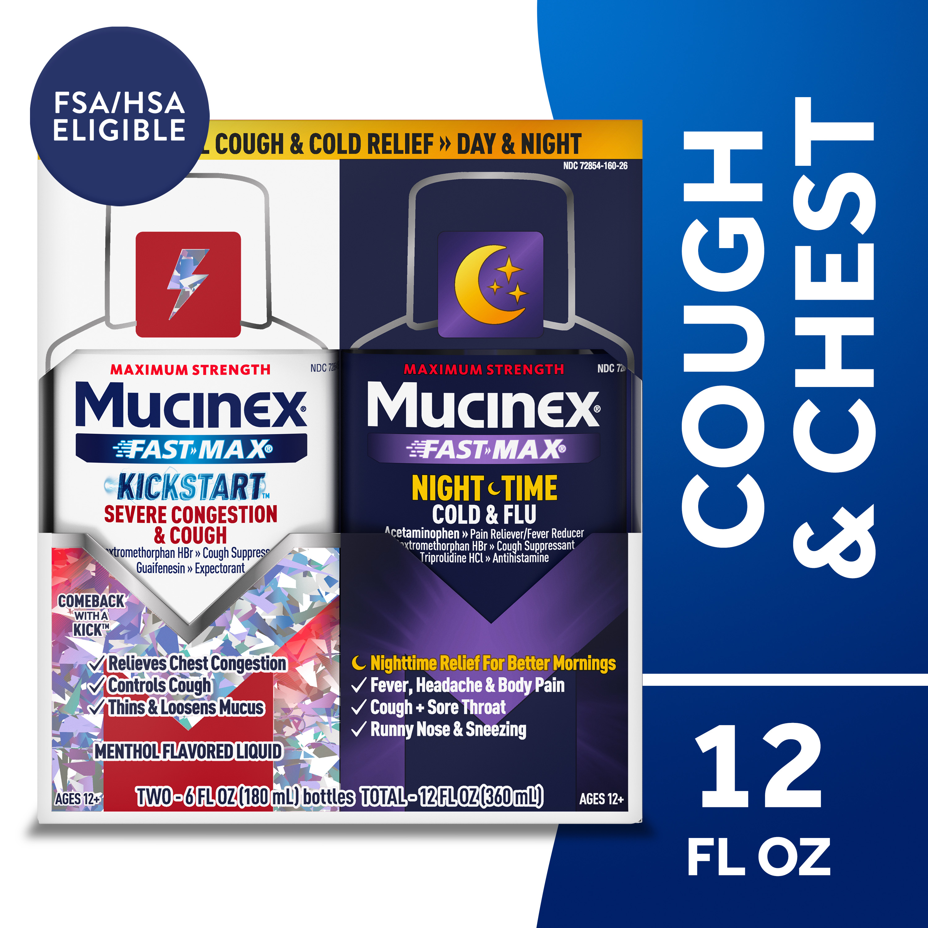 - COUGH MEDICINE FOR ADULTS: Relief starts with a kick! Mucinex Fast-Max Kickstart Severe Congestion & Cough liquid provides powerful cough & chest congestion relief with a jolt of menthol flavor