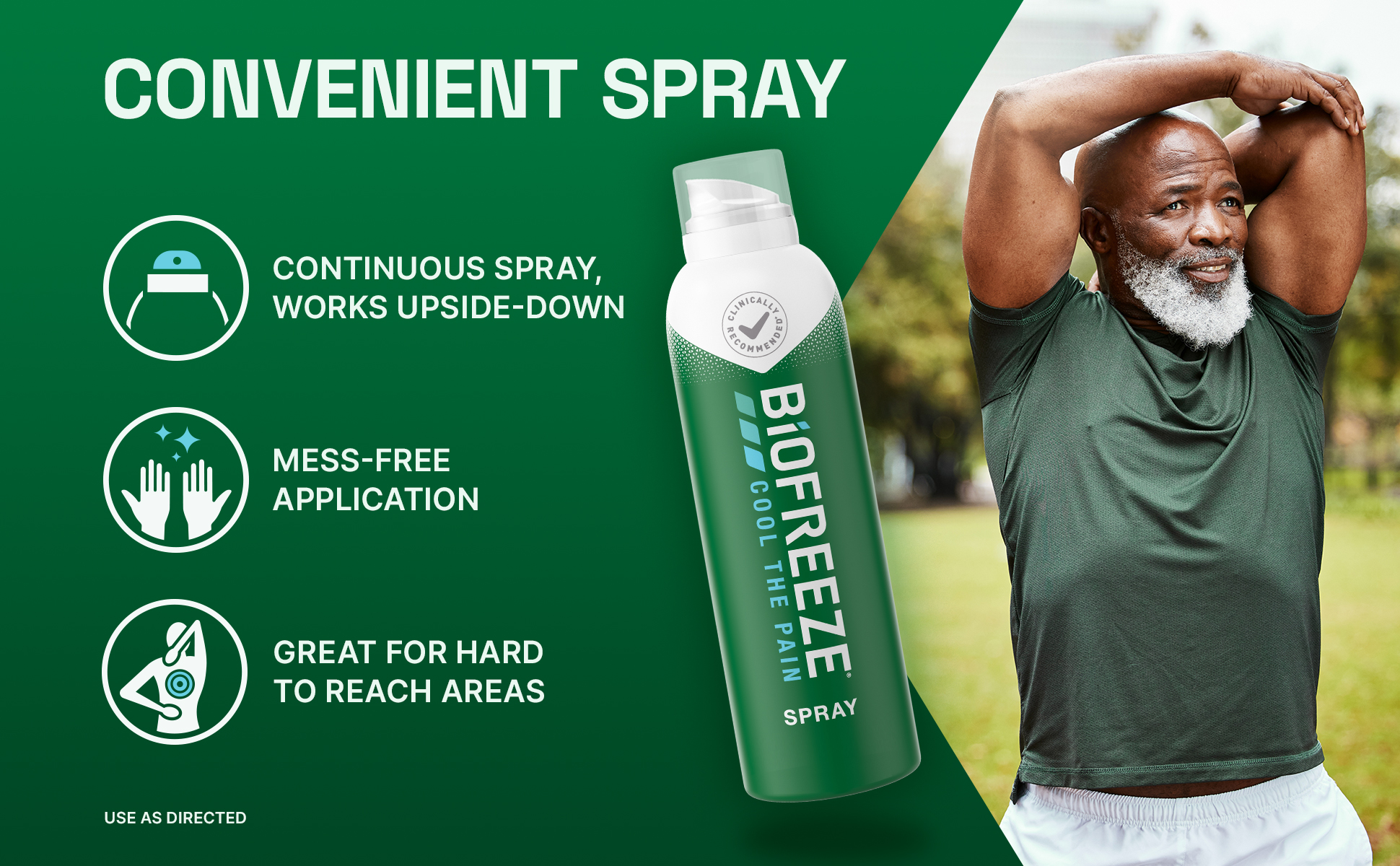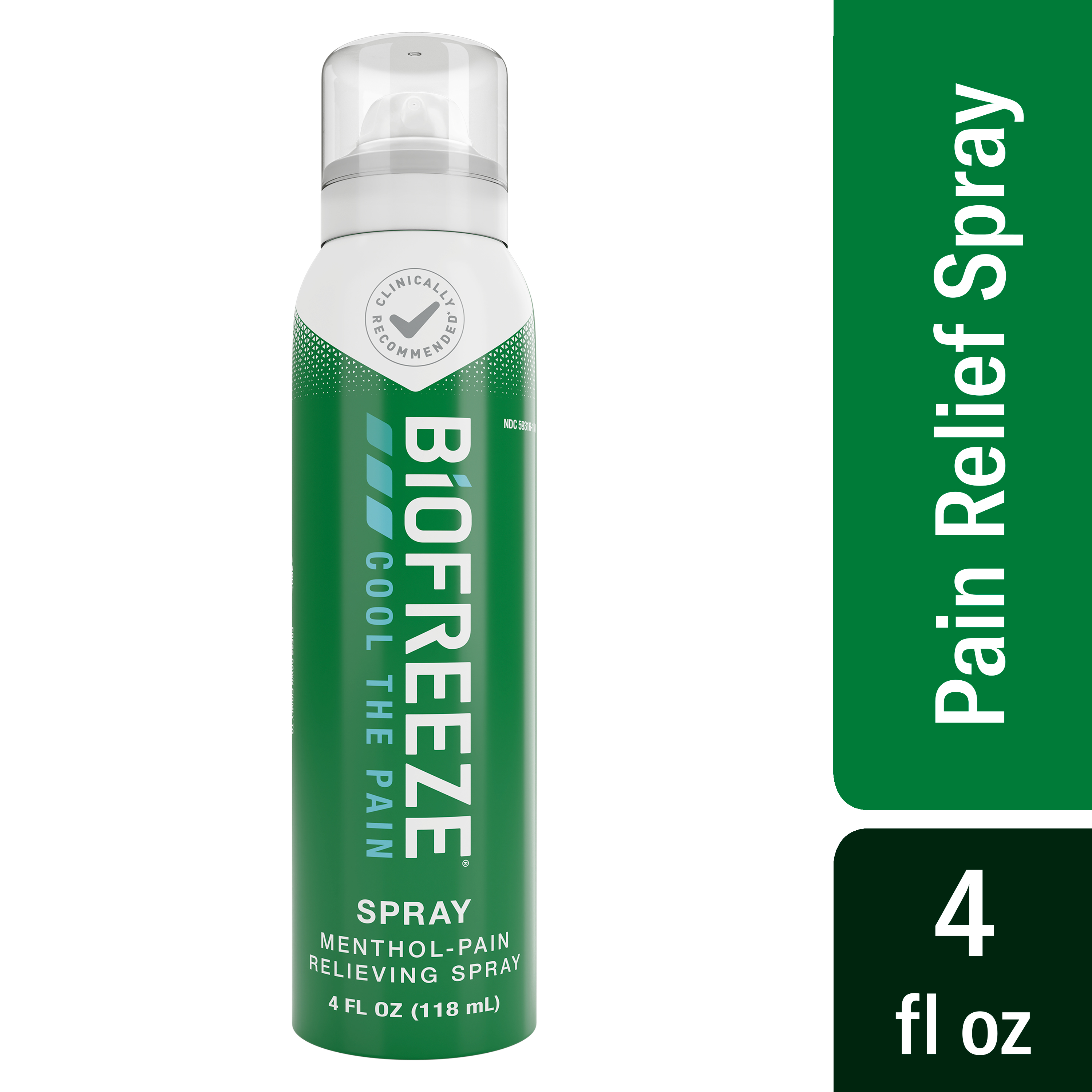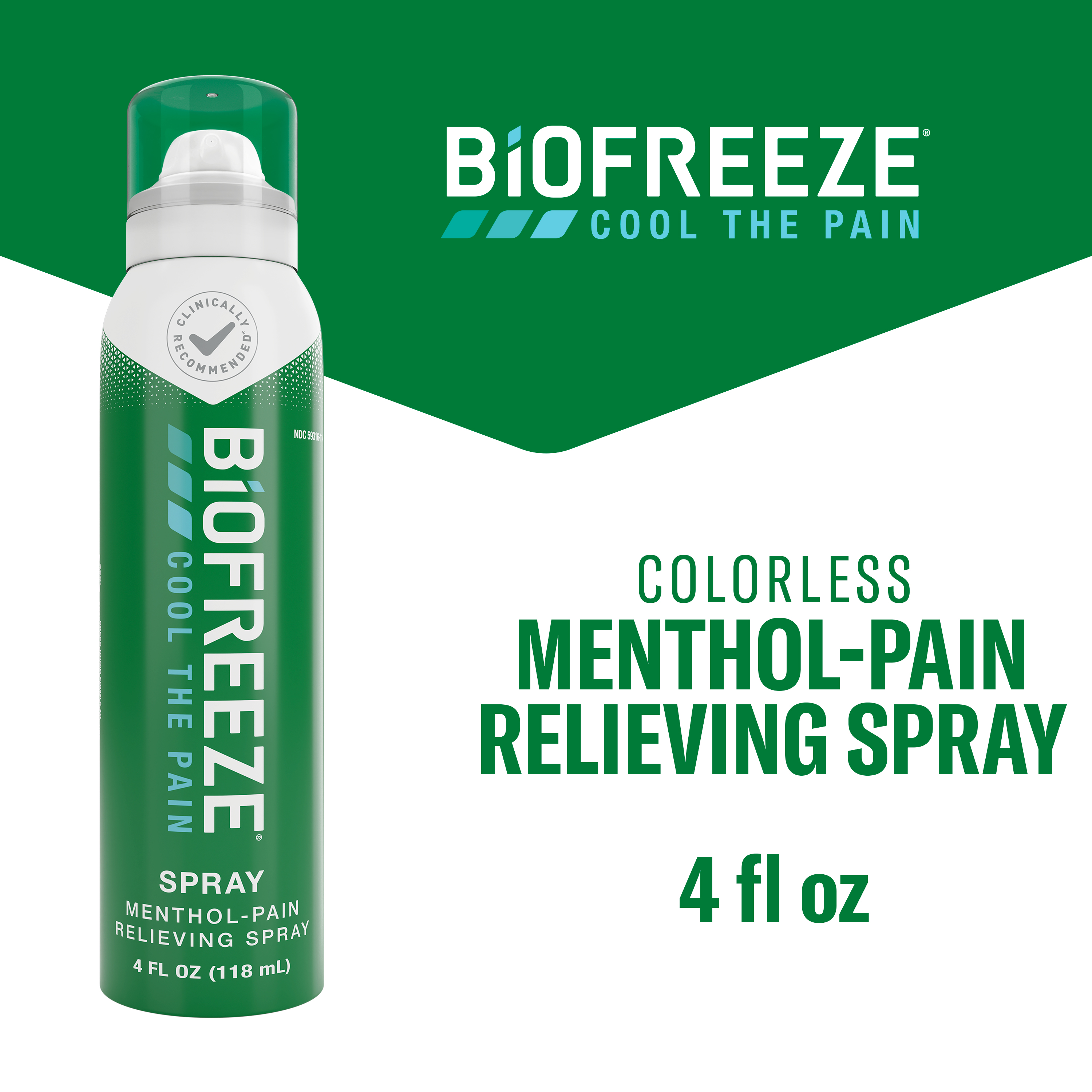 - Biofreeze Pain Relieving Spray applies easily to hard-to-reach areas such as the middle back, neck, and lower extremities