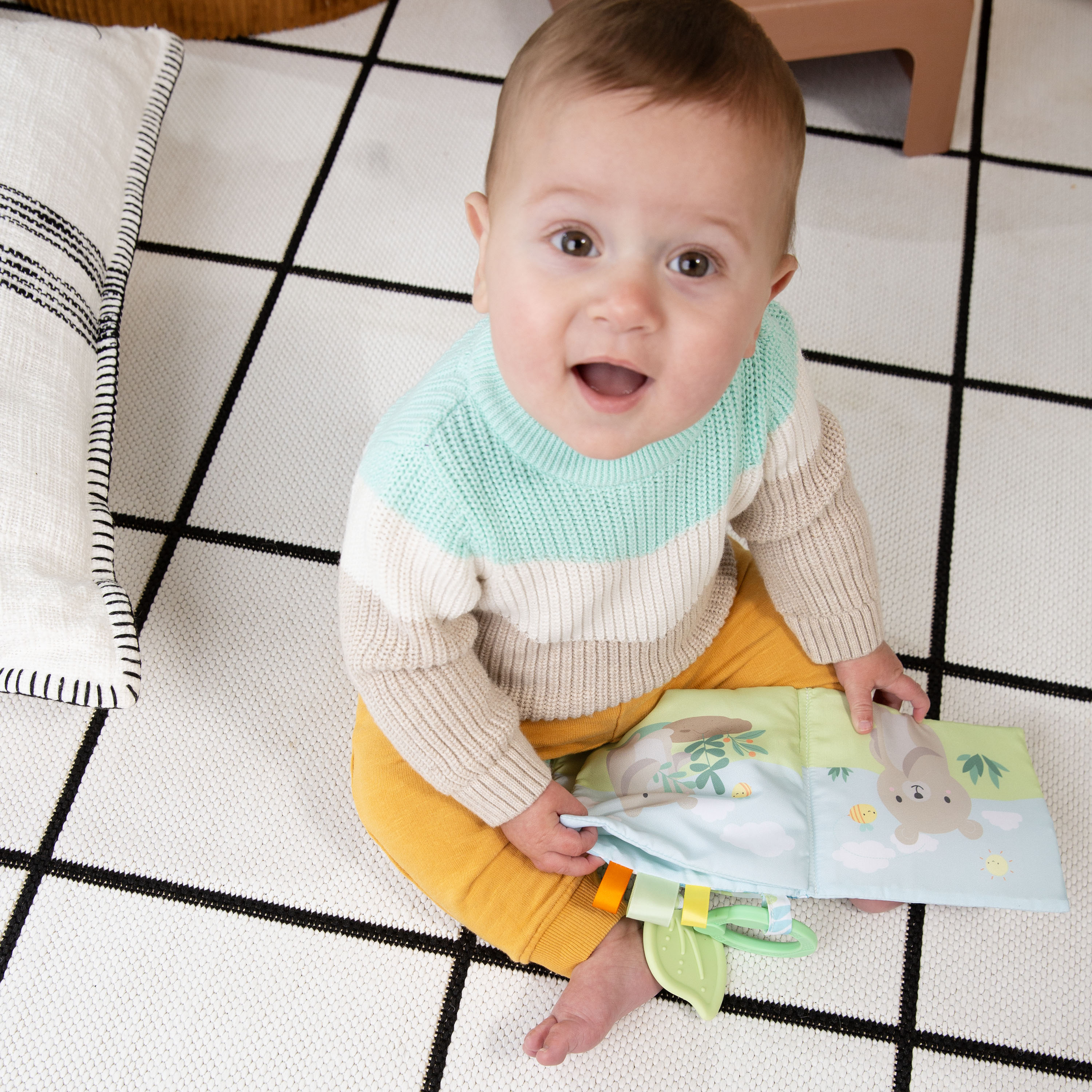 - Das Stoffbuch verfügt über verschiedene Texturen, die das Baby beschäftigen, wie z.B. die versteckten Knittereffekte im Inneren und die 3 Anhänger aus Satinband.Die Anhänger regen zur Selbstberuhigung an