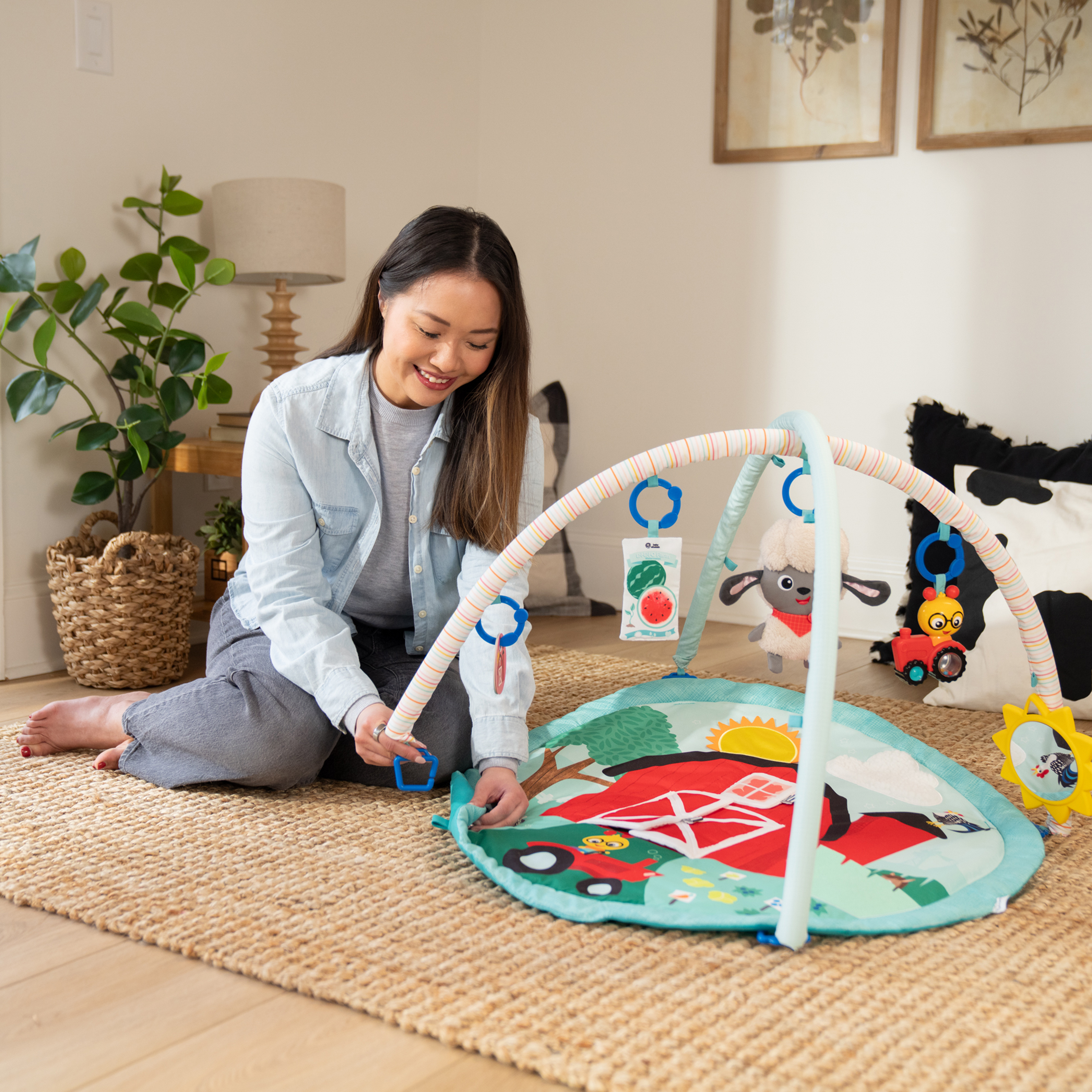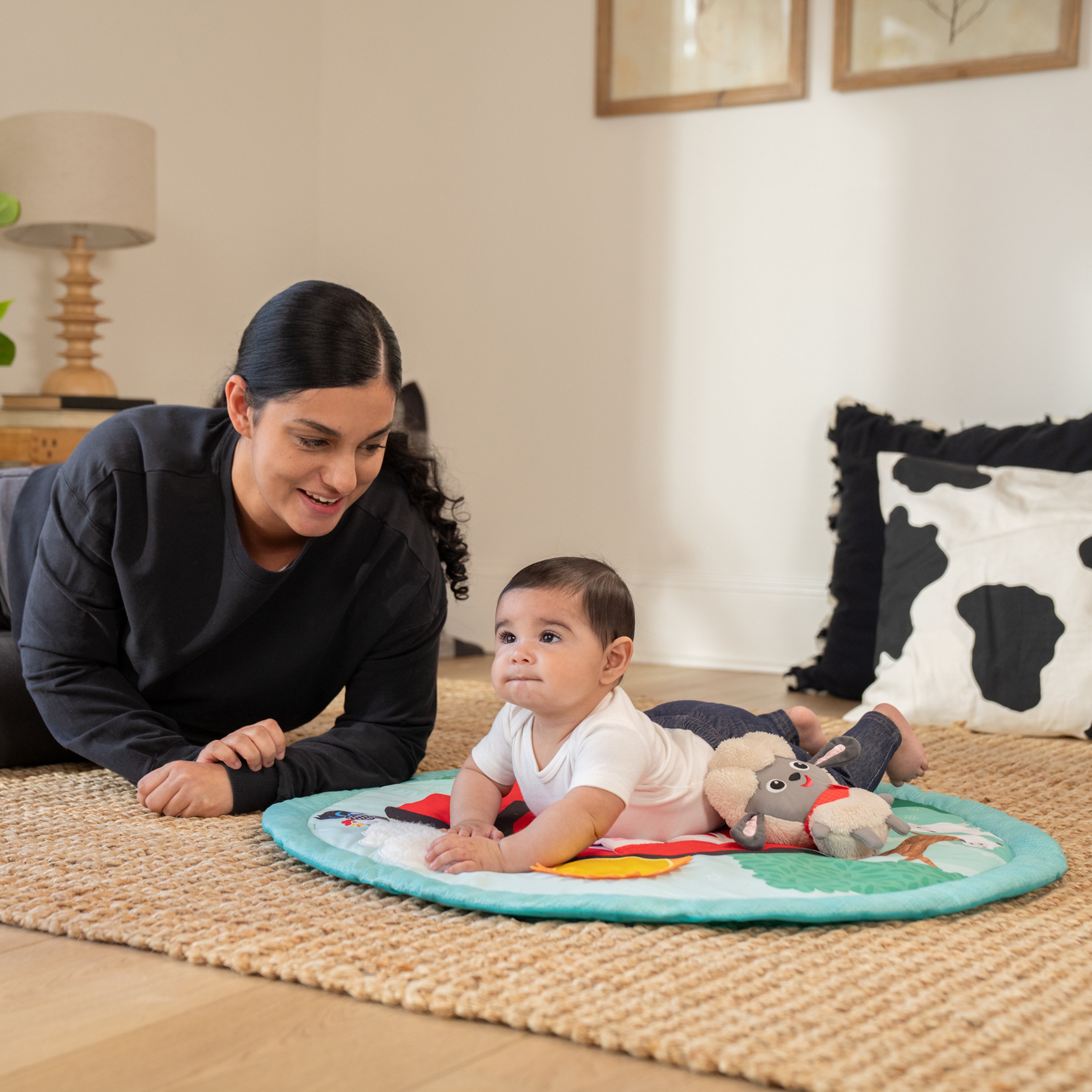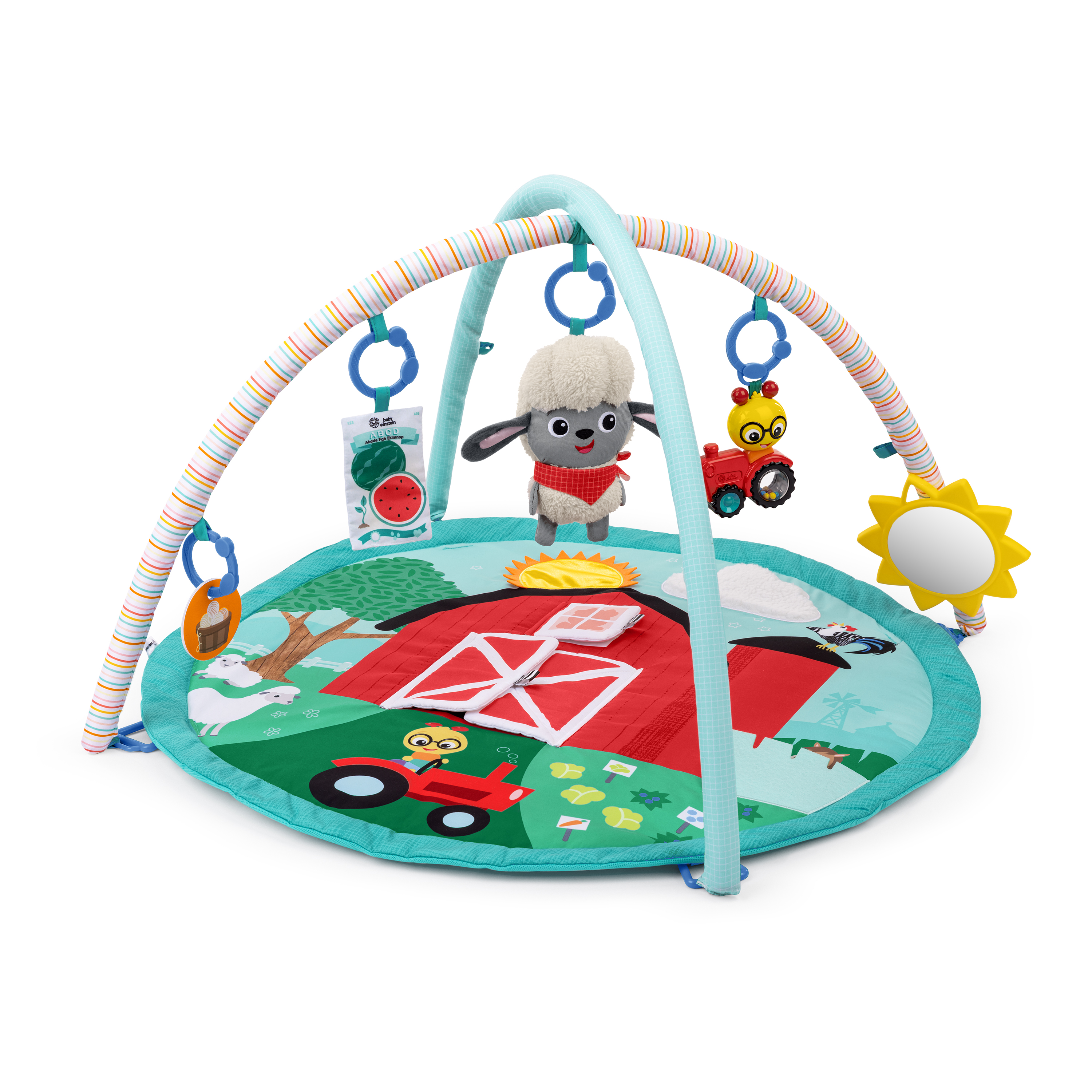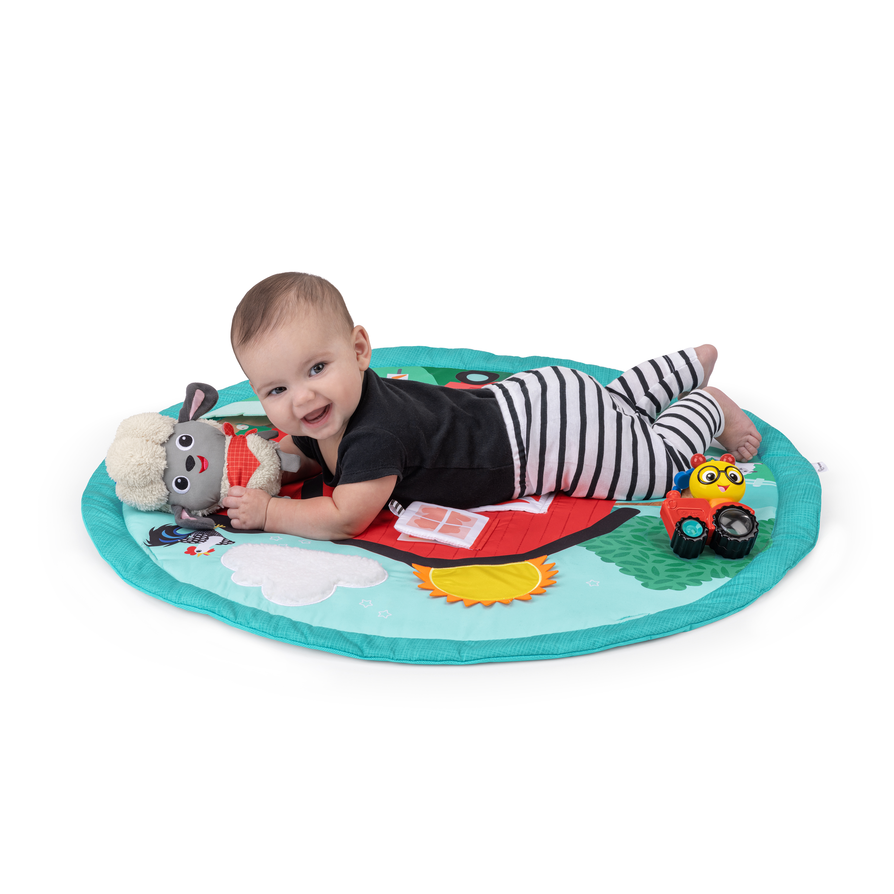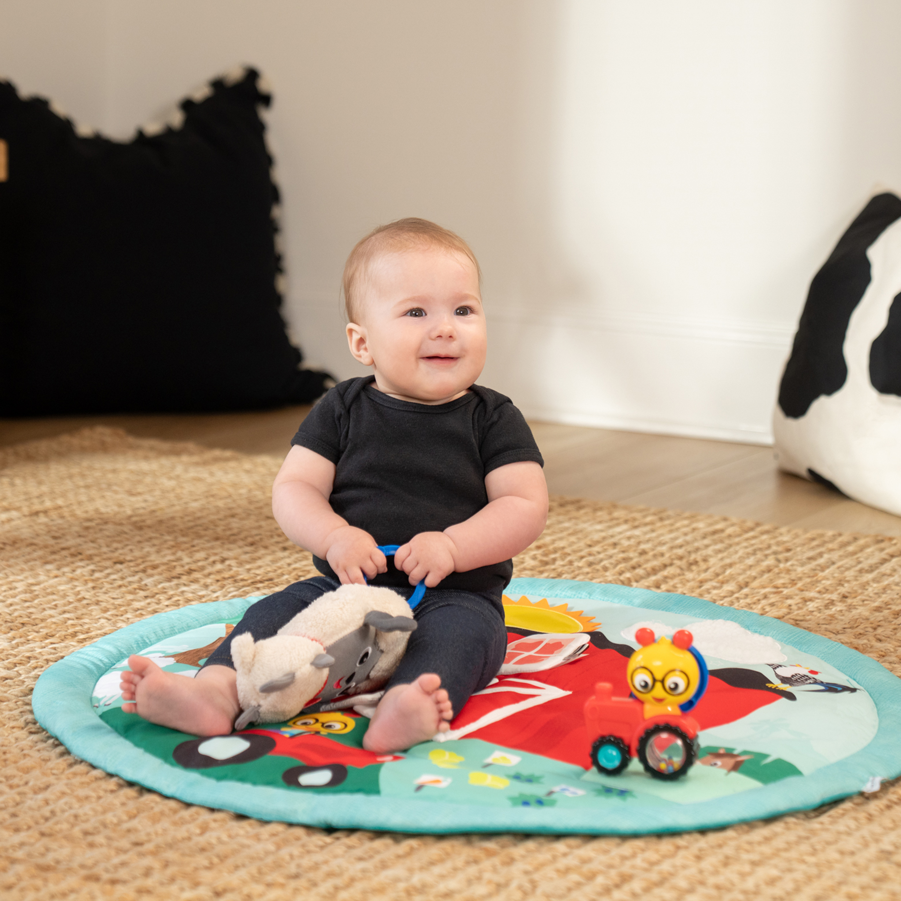 - Ideal für die Bauchlage, zum Spielen und Sitzen; die weiche, bequeme Matte lässt sich leicht zusammenfalten und verfügt über eine strukturierte Oberfläche mit Sonne, Wolken, einem Pferd, das sich hinter dem Gras versteckt, und aufklappbaren Scheunentoren.