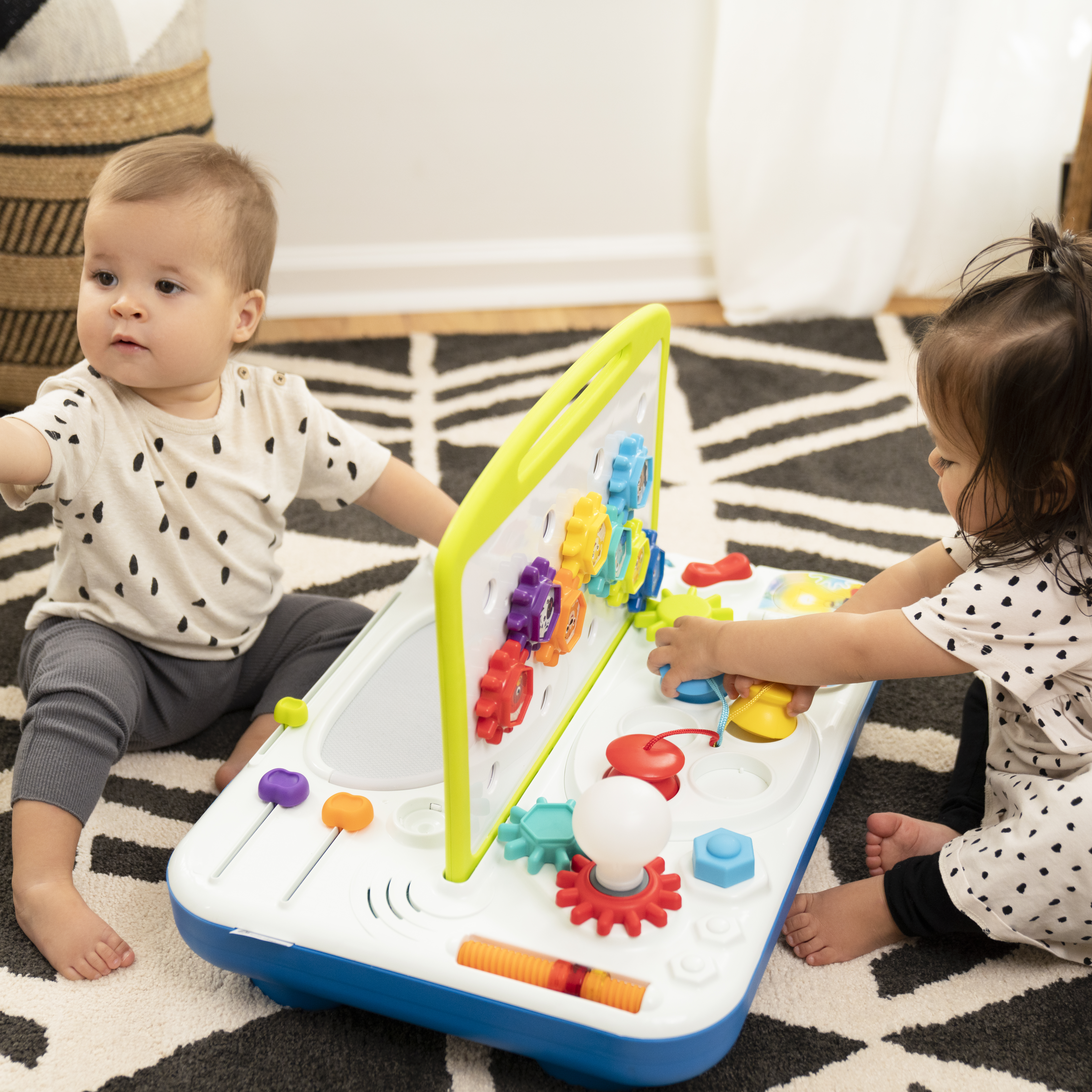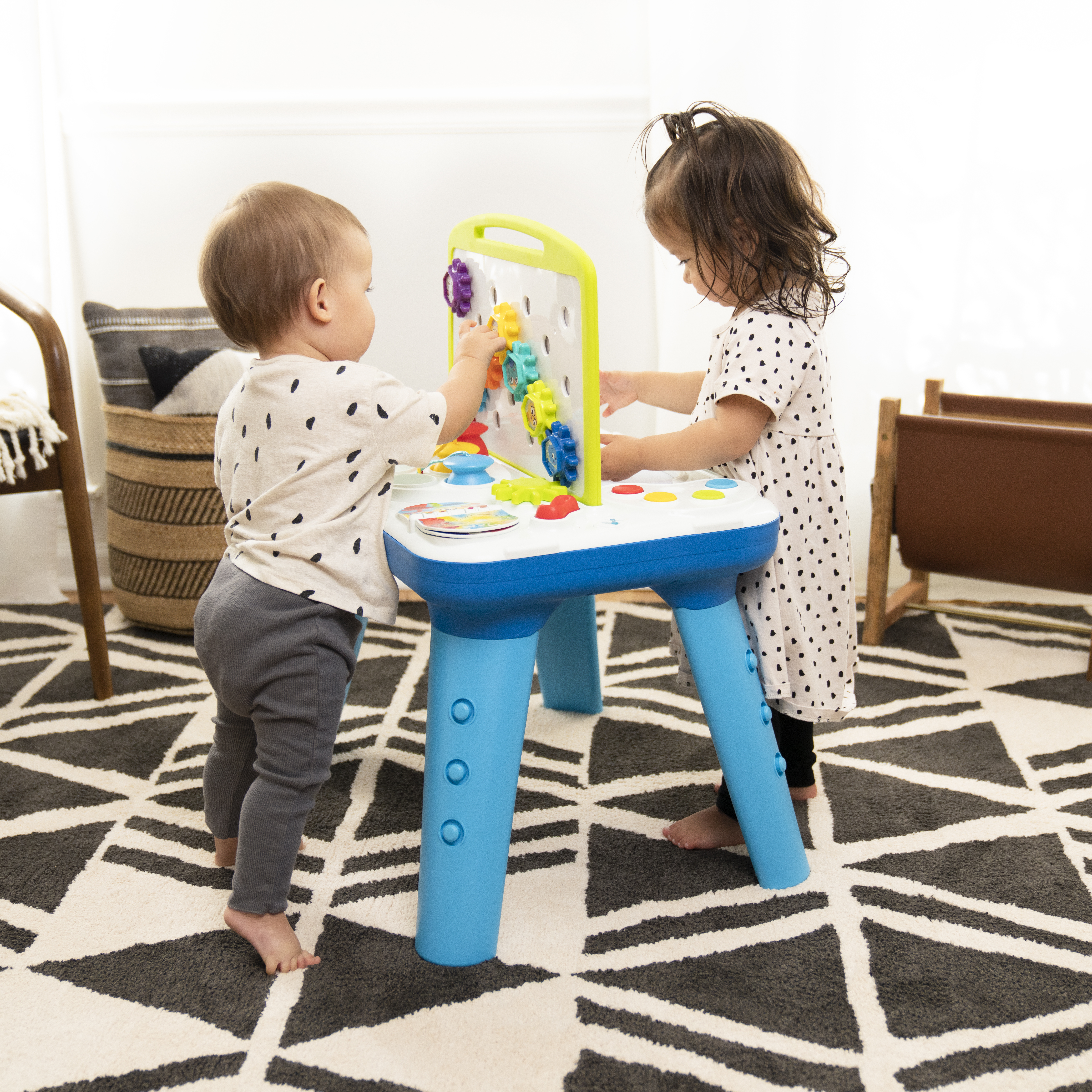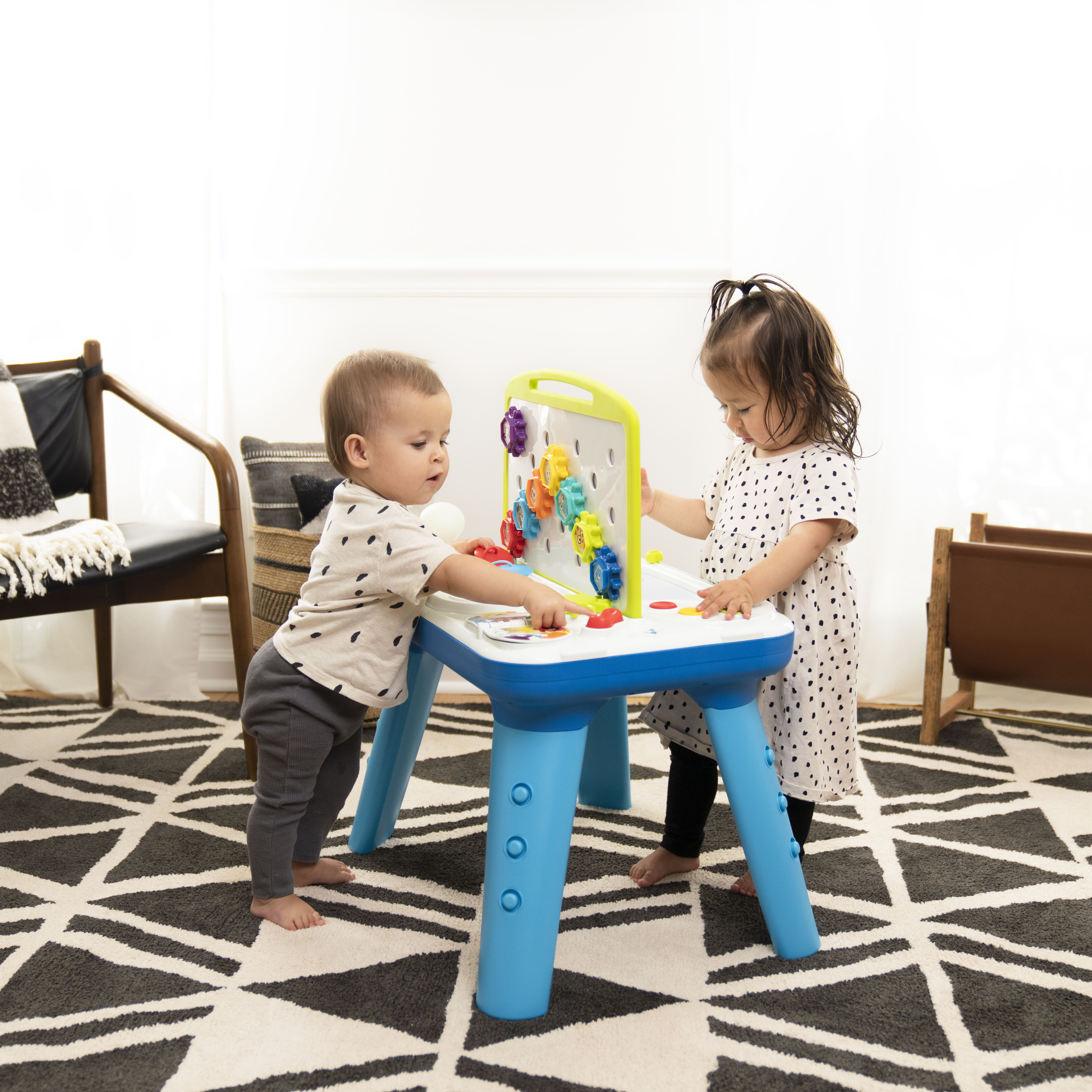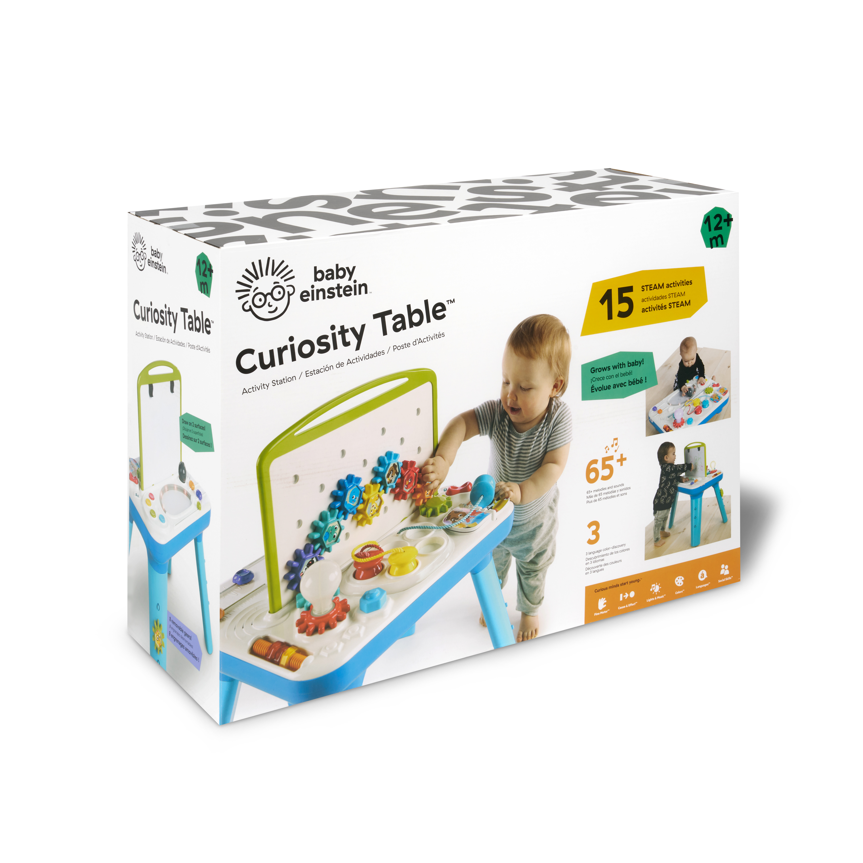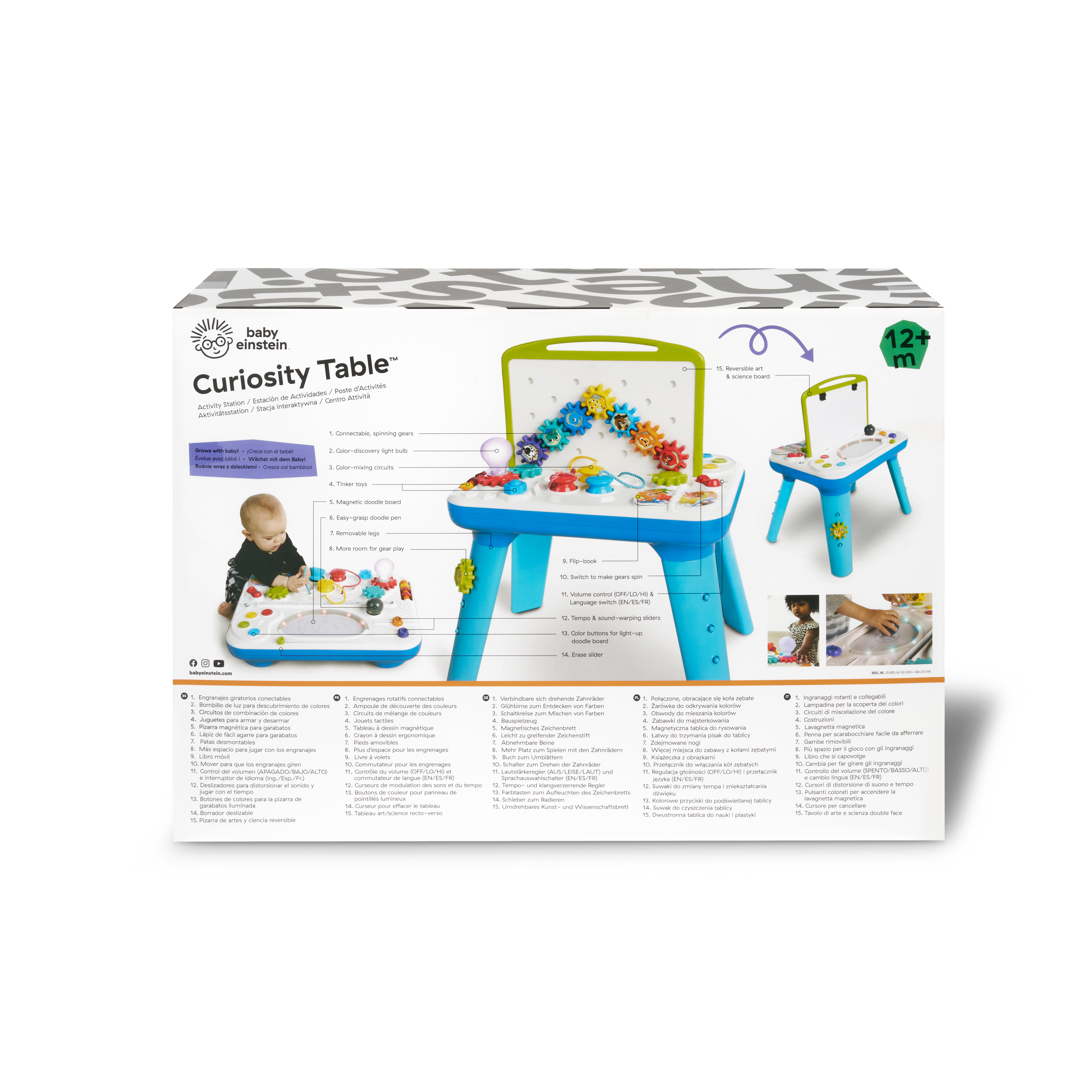 | Product Description | Draw out your child's naturally curious spirit with Baby Einstein's Curiosity Table. From removable, spinning gears to color-discovery circuits and flashing lights, the two-sided art and science table will capture your little one's attention for hours. Watch as the gears connect to make the light bulb turn on! Experiment with color using the mess-free "paint pots." Your little one will love investigating all the gadgets on this double sided table. It plays more than 65 melodies and introduces vocabulary in English, Spanish or French. Volume adjusts to either high or low settings, or can be turned off completely. When the sounds are turned on, you and your baby will enjoy a better musical experience from the higher end quality speaker. Whether he's stepping or crawling, the activity station grows with baby. The middle art panel is removable to make more space for baby's arts and crafts - it even attaches to the end of the table. And removable table legs make it easy to convert the table for floor play. A drawing art surface and a dry erase whiteboard leave plenty of room for big brother or sister to join in on the fun too. Pull up a seat - this play station is fun for parents too! |
