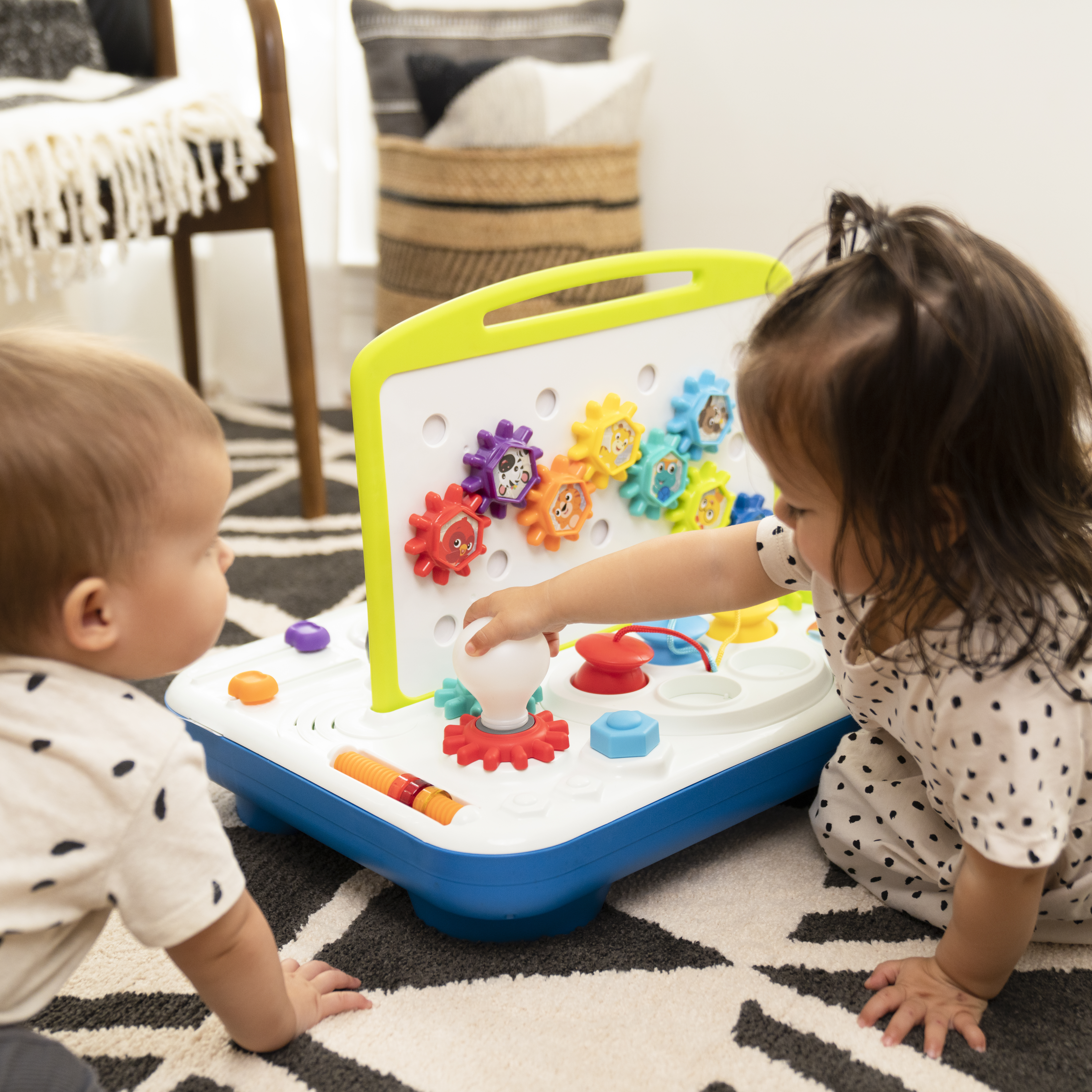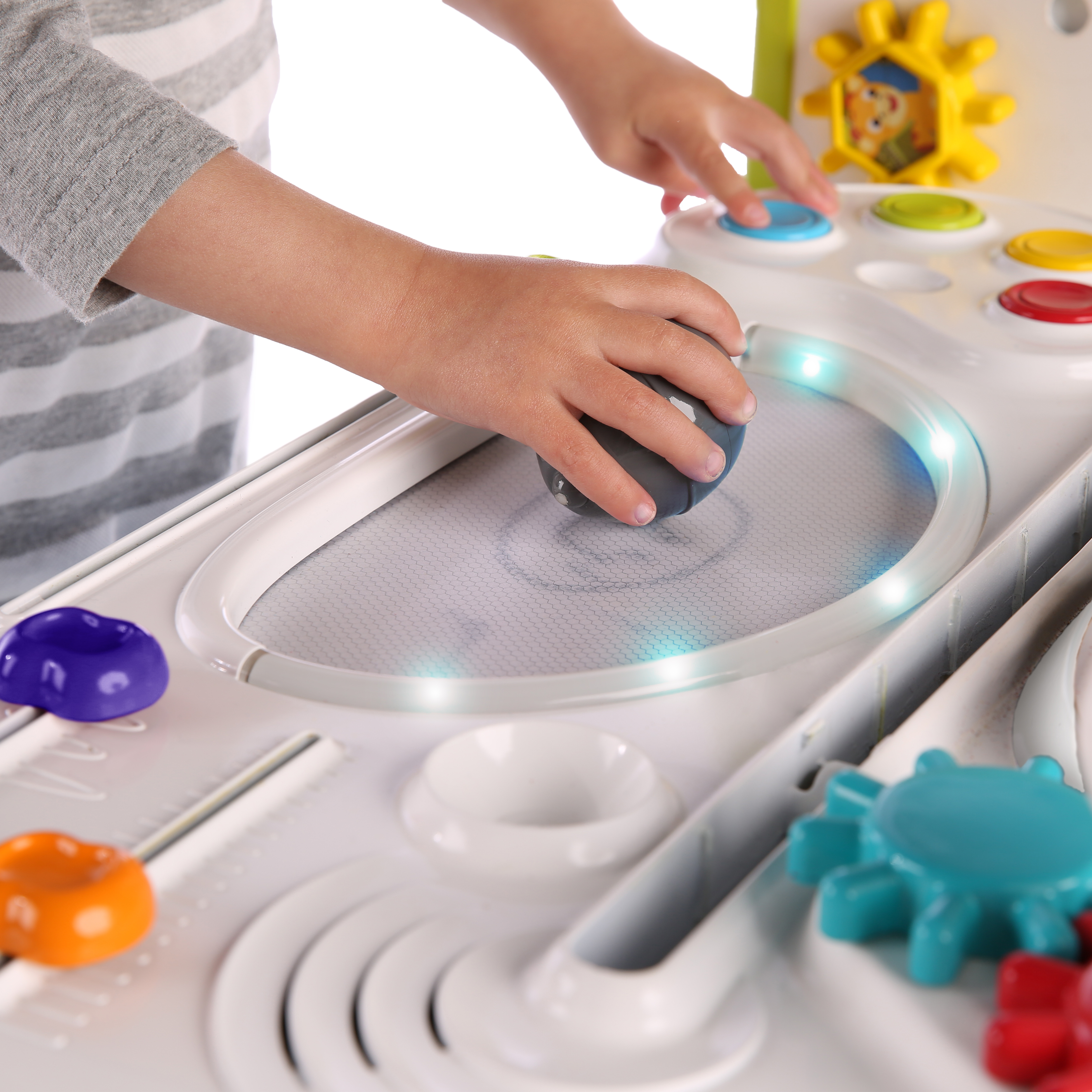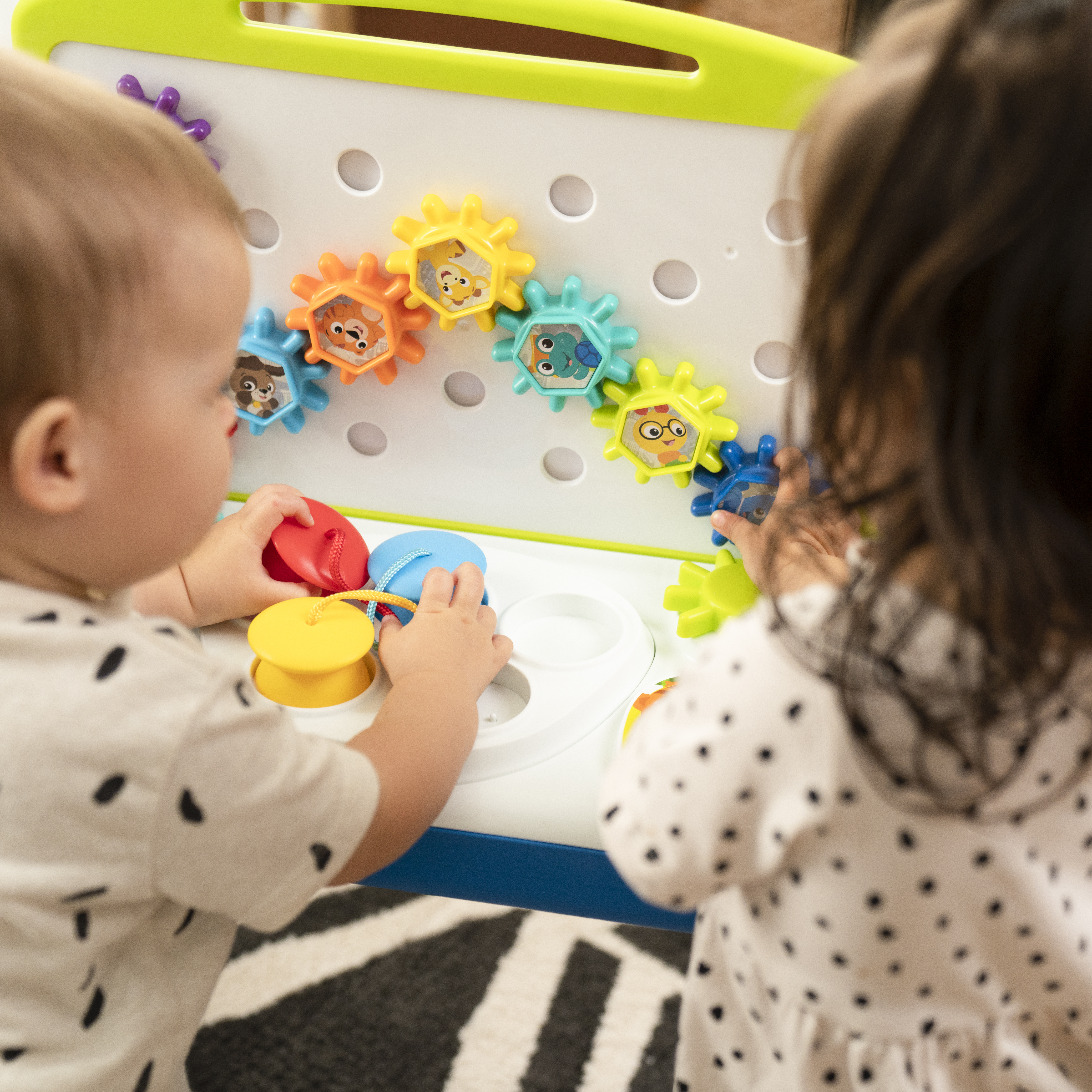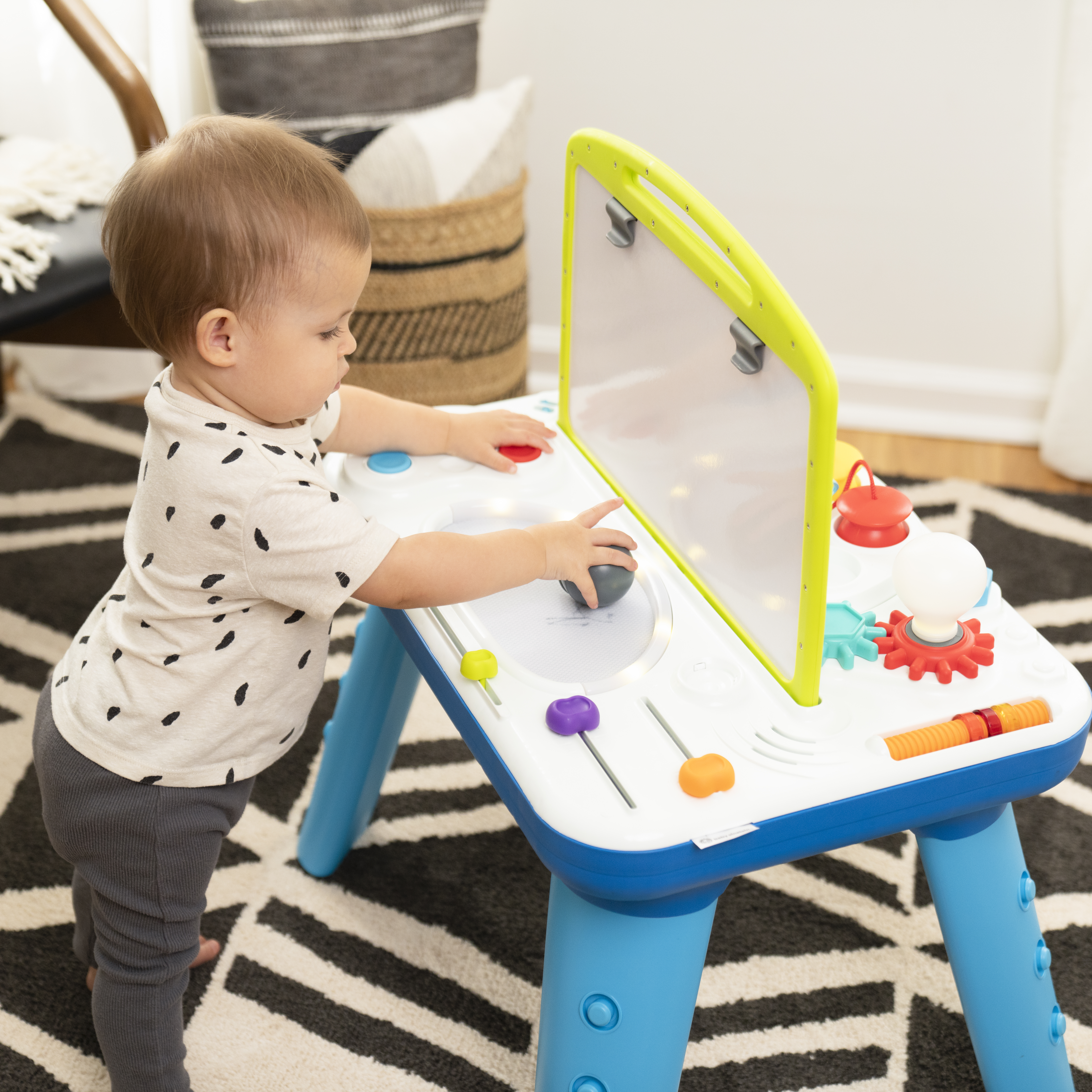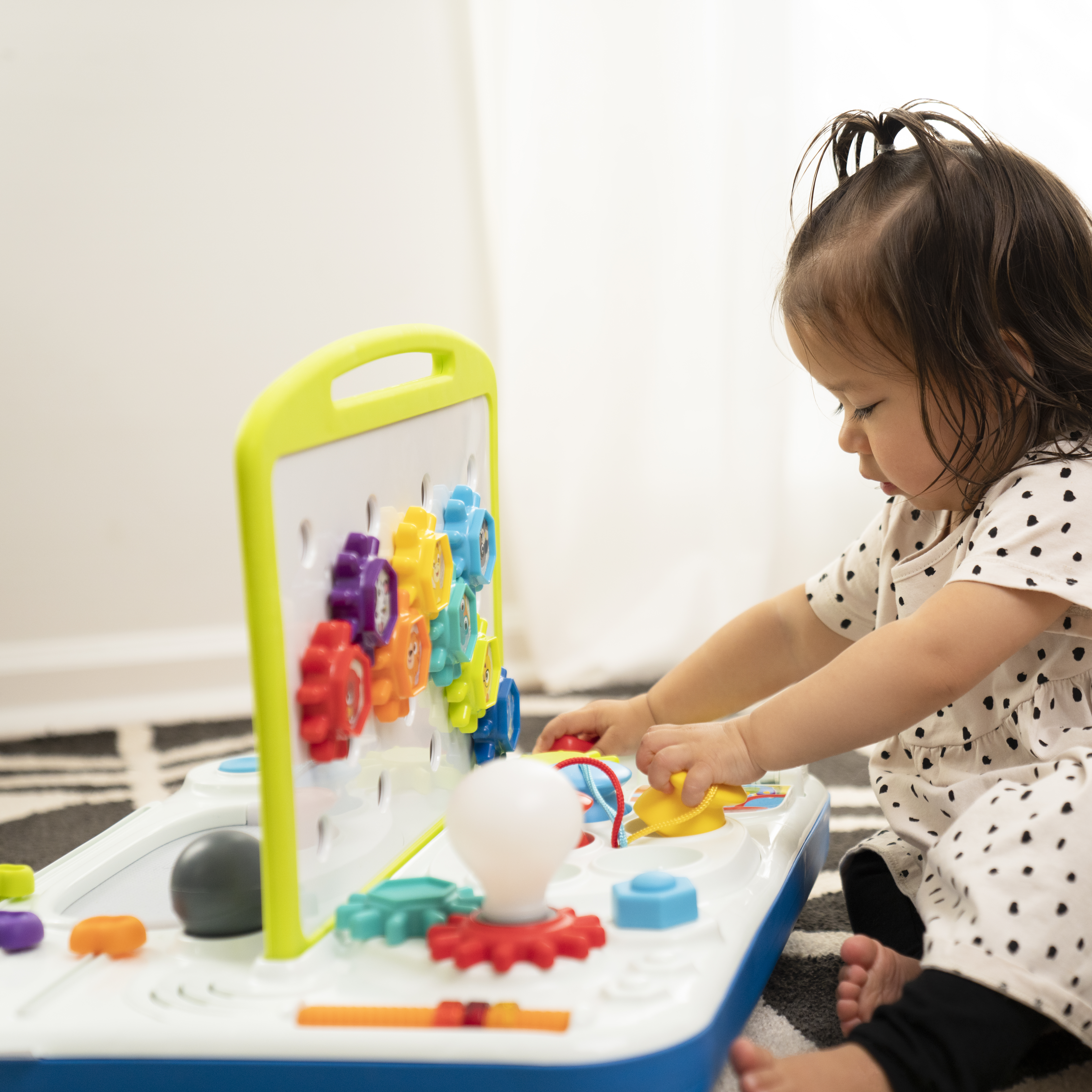 | Product Description | Draw out your child's naturally curious spirit with Baby Einstein's Curiosity Table. From removable, spinning gears to color-discovery circuits and flashing lights, the two-sided art and science table will capture your little one's attention for hours. Watch as the gears connect to make the light bulb turn on! Experiment with color using the mess-free "paint pots." Your little one will love investigating all the gadgets on this double sided table. It plays more than 65 melodies and introduces vocabulary in English, Spanish or French. Volume adjusts to either high or low settings, or can be turned off completely. When the sounds are turned on, you and your baby will enjoy a better musical experience from the higher end quality speaker. Whether he's stepping or crawling, the activity station grows with baby. The middle art panel is removable to make more space for baby's arts and crafts - it even attaches to the end of the table. And removable table legs make it easy to convert the table for floor play. A drawing art surface and a dry erase whiteboard leave plenty of room for big brother or sister to join in on the fun too. Pull up a seat - this play station is fun for parents too! |