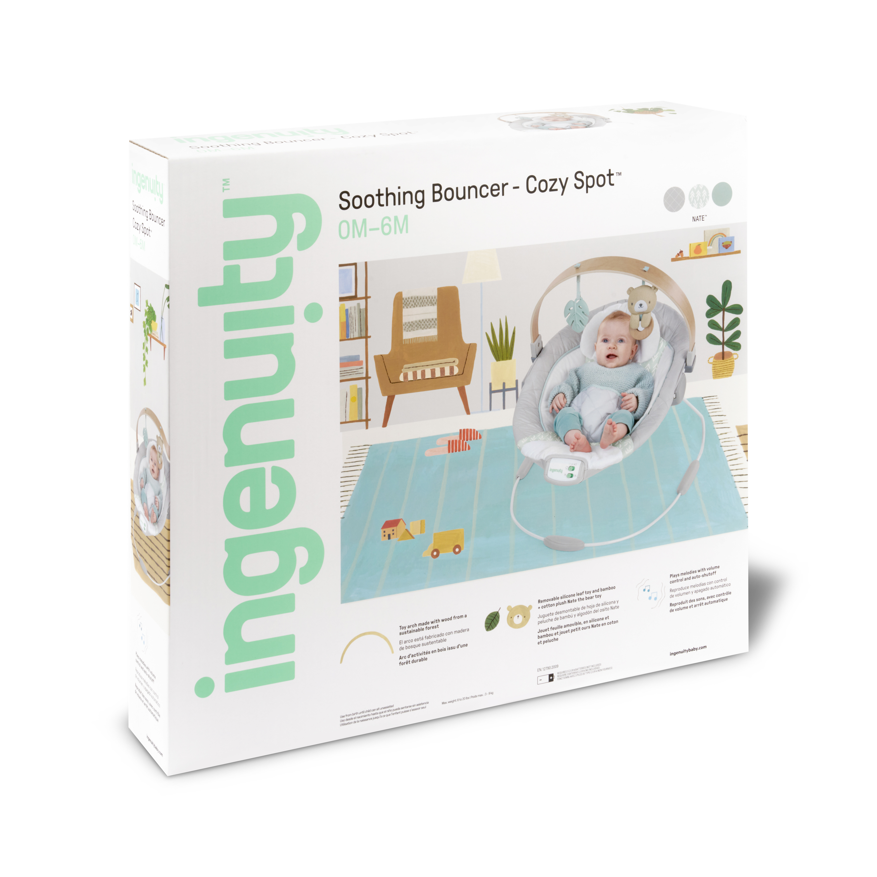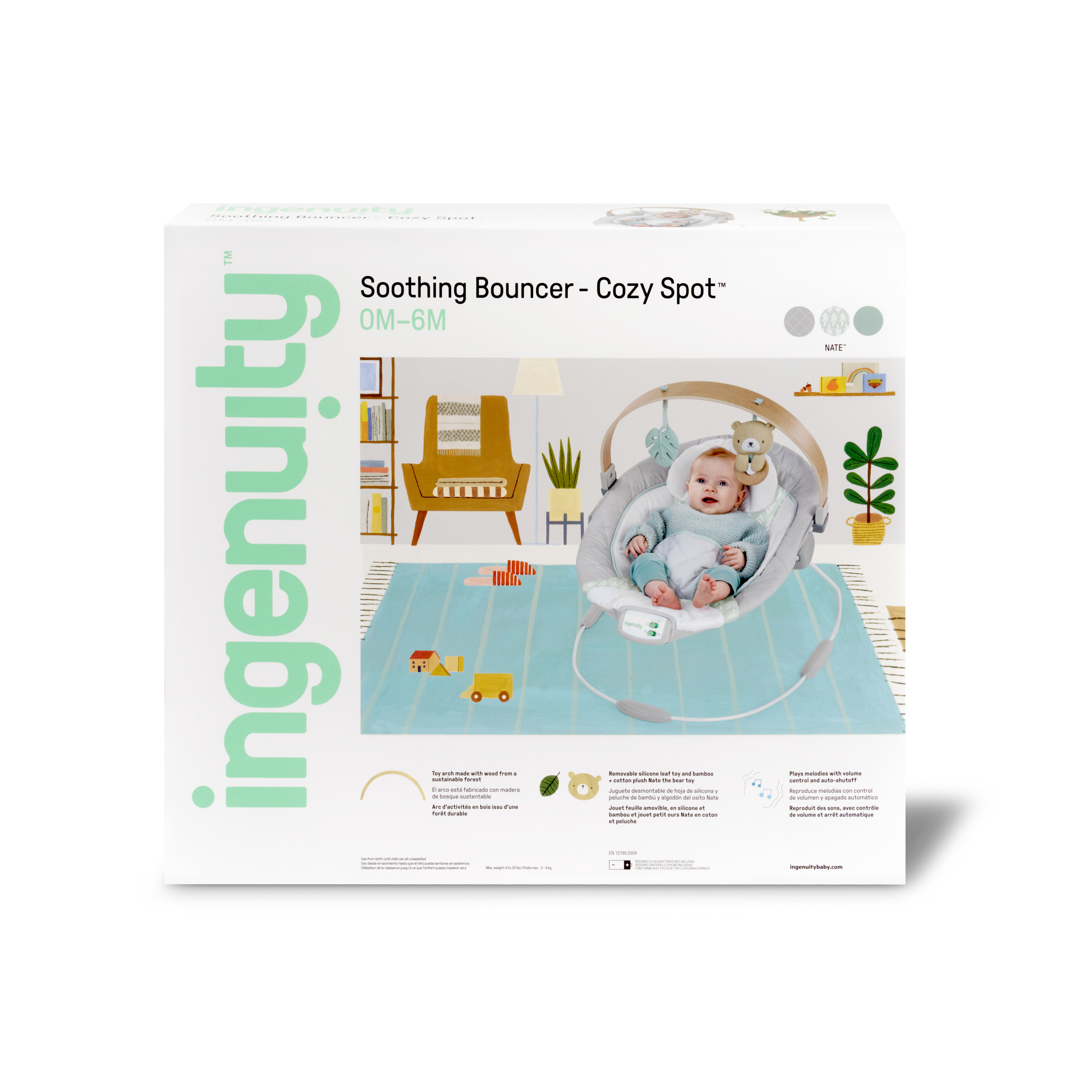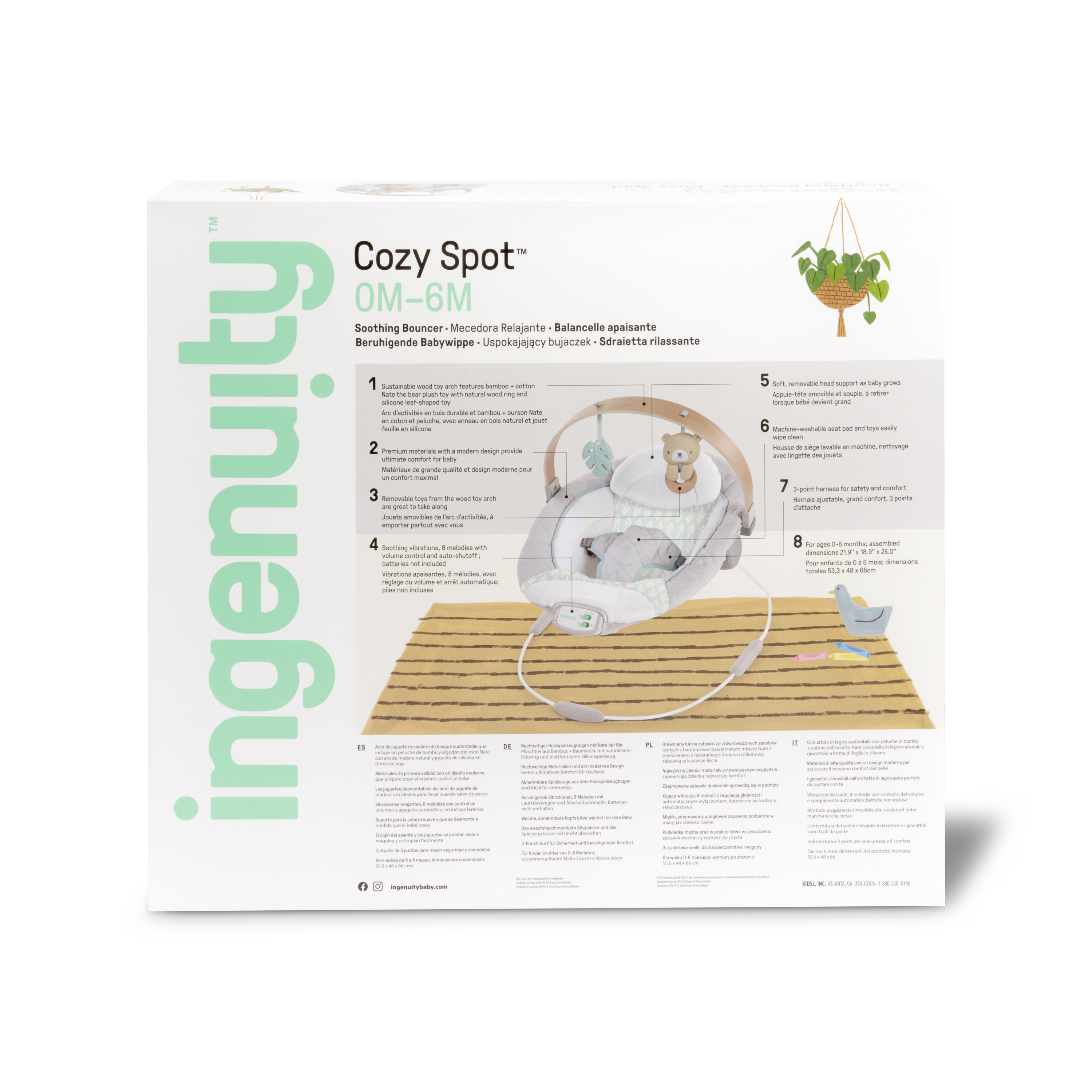 - Keep baby entertained and safely seated without compromising your home décor with the Ingenuity Cozy Spot Soothing Baby Bouncer! Give baby a comfy, large plush seat with benefits