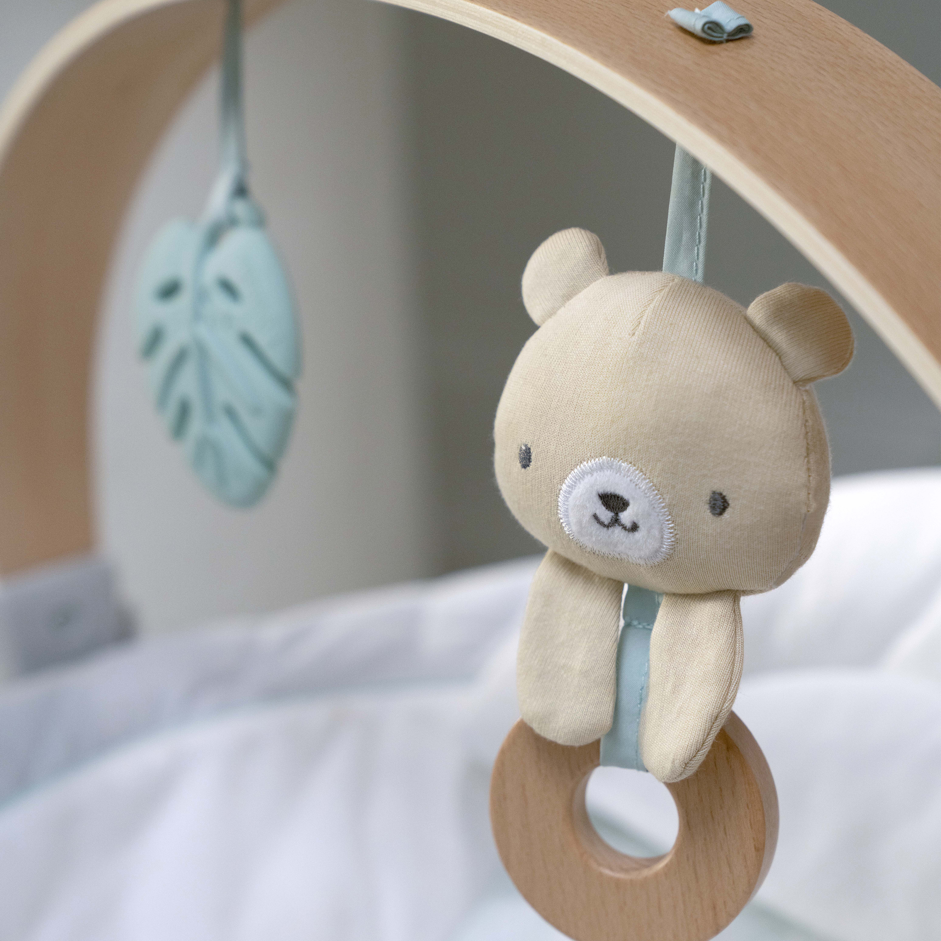 - The chic bouncer comes with an FSC-certified wood toy arch with Nate the bear plush toy with a natural wood ring and a BPA-free natural rubber leaf toy
