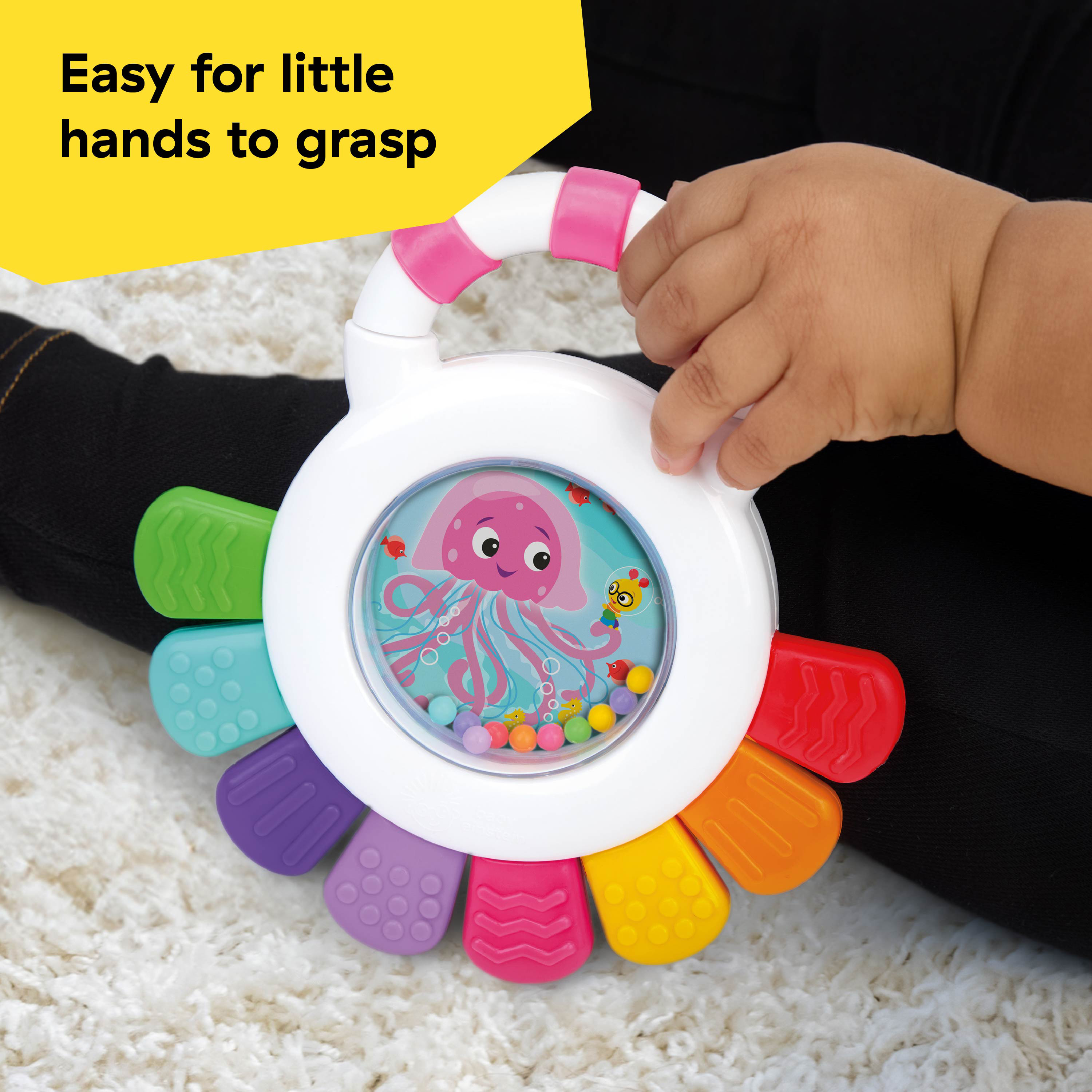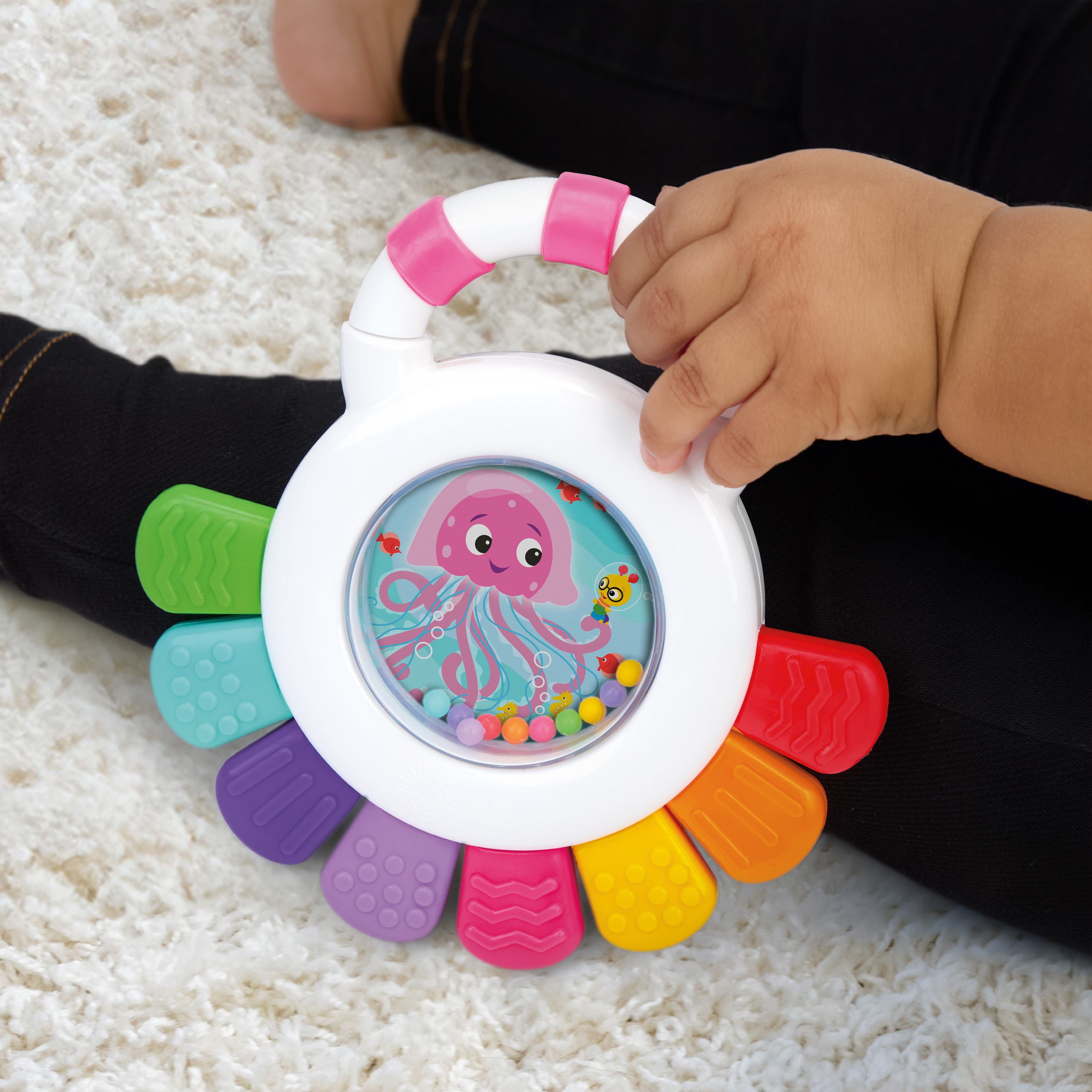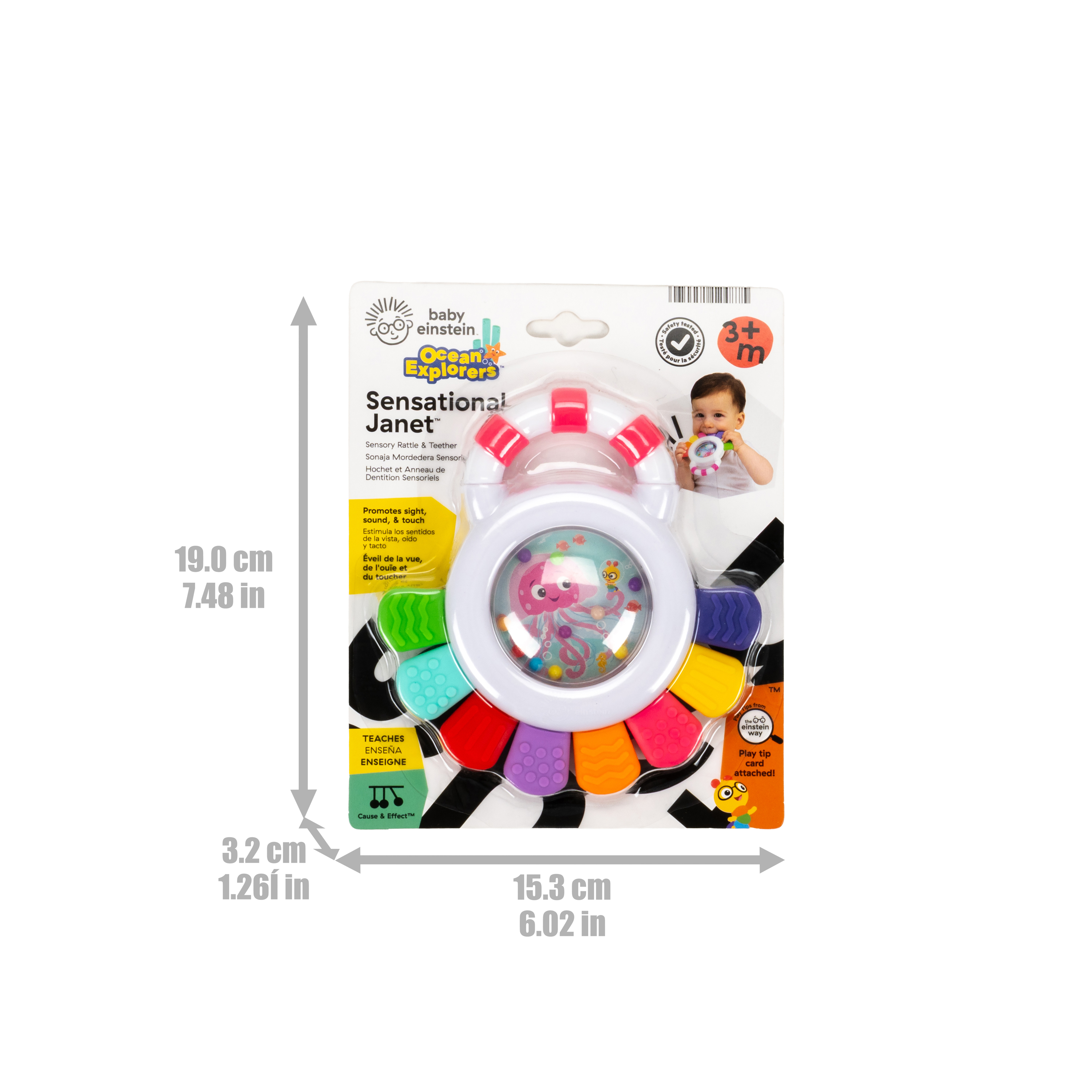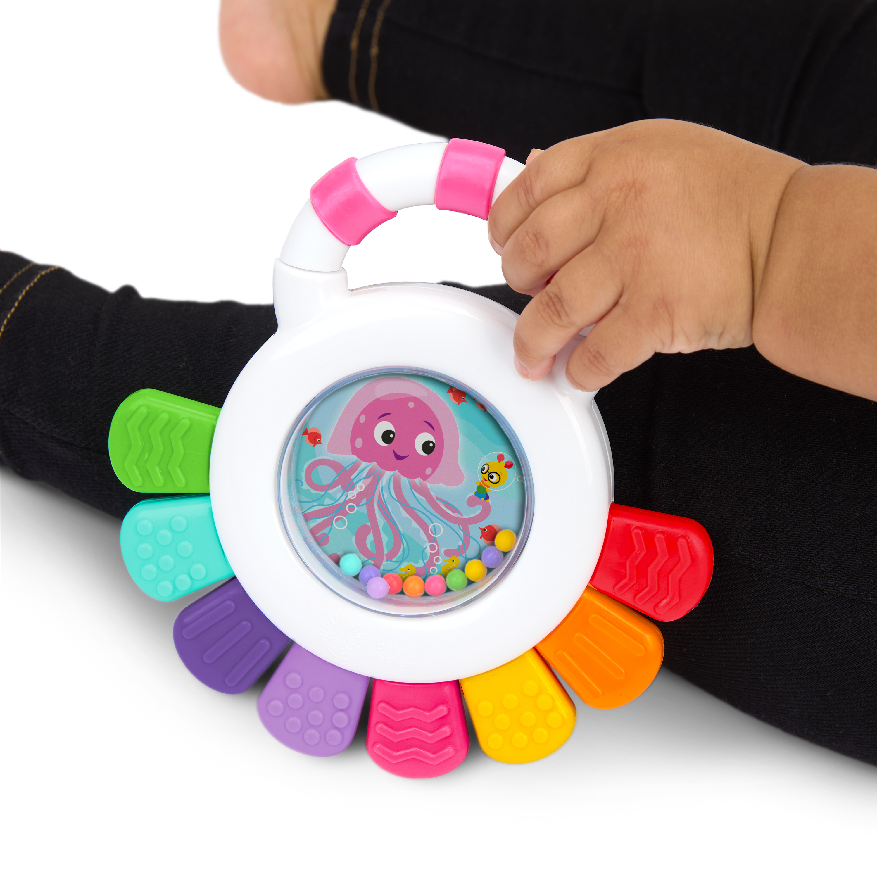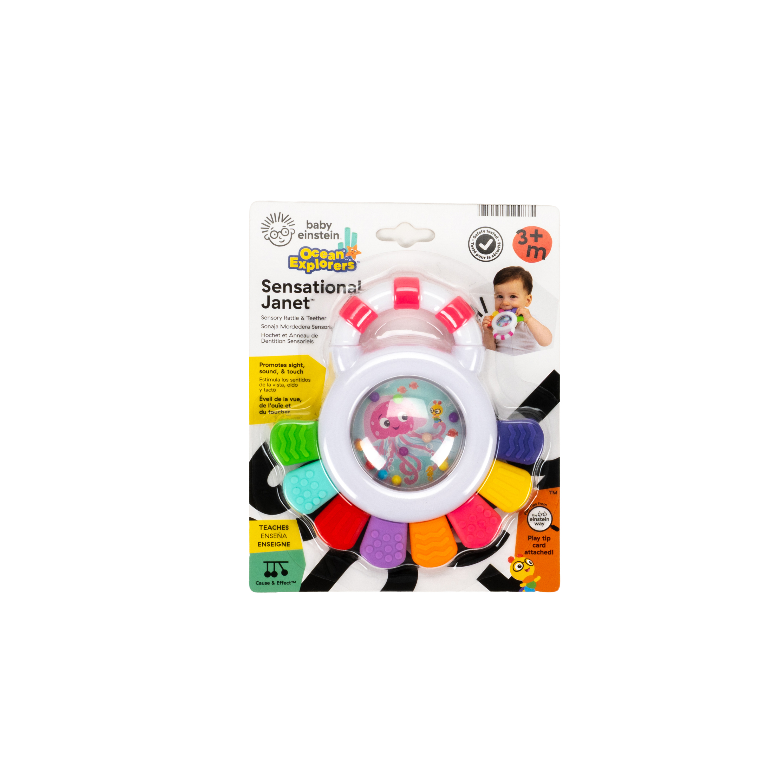 - Multi-sensory teether – Baby Einstein Sensational Janet Multisensory Rattle & Teether promotes sight, sound, and touch engagement with brightly colored rattle beads, and 8 teethable textures