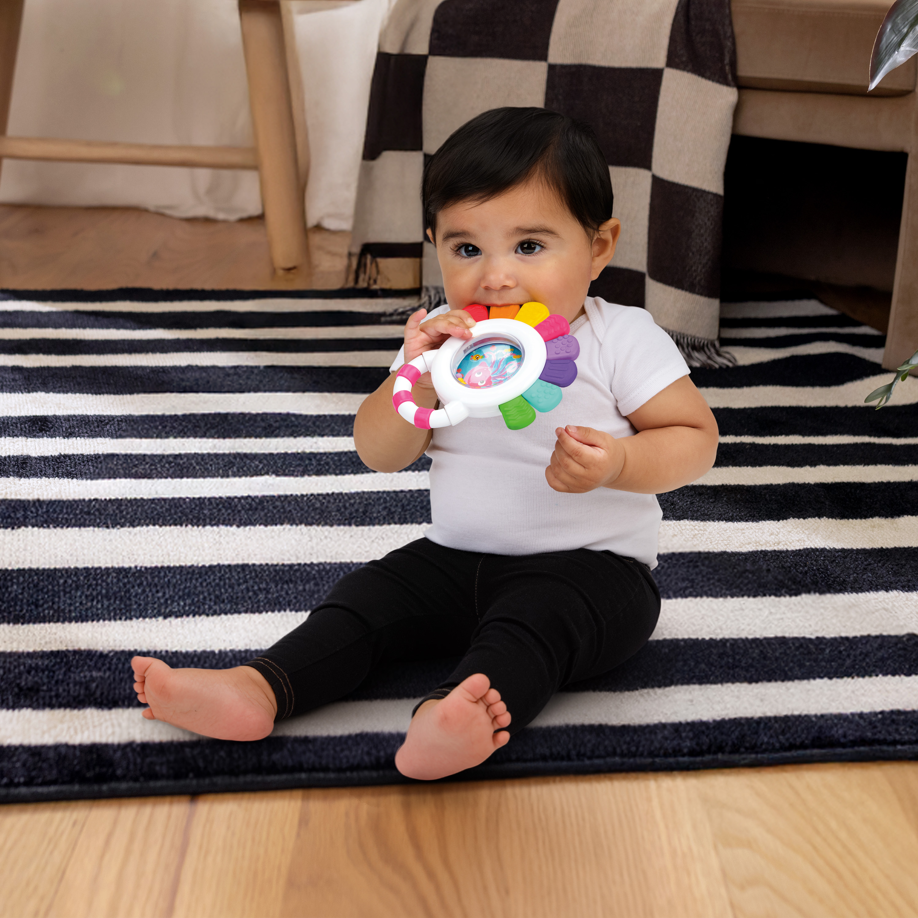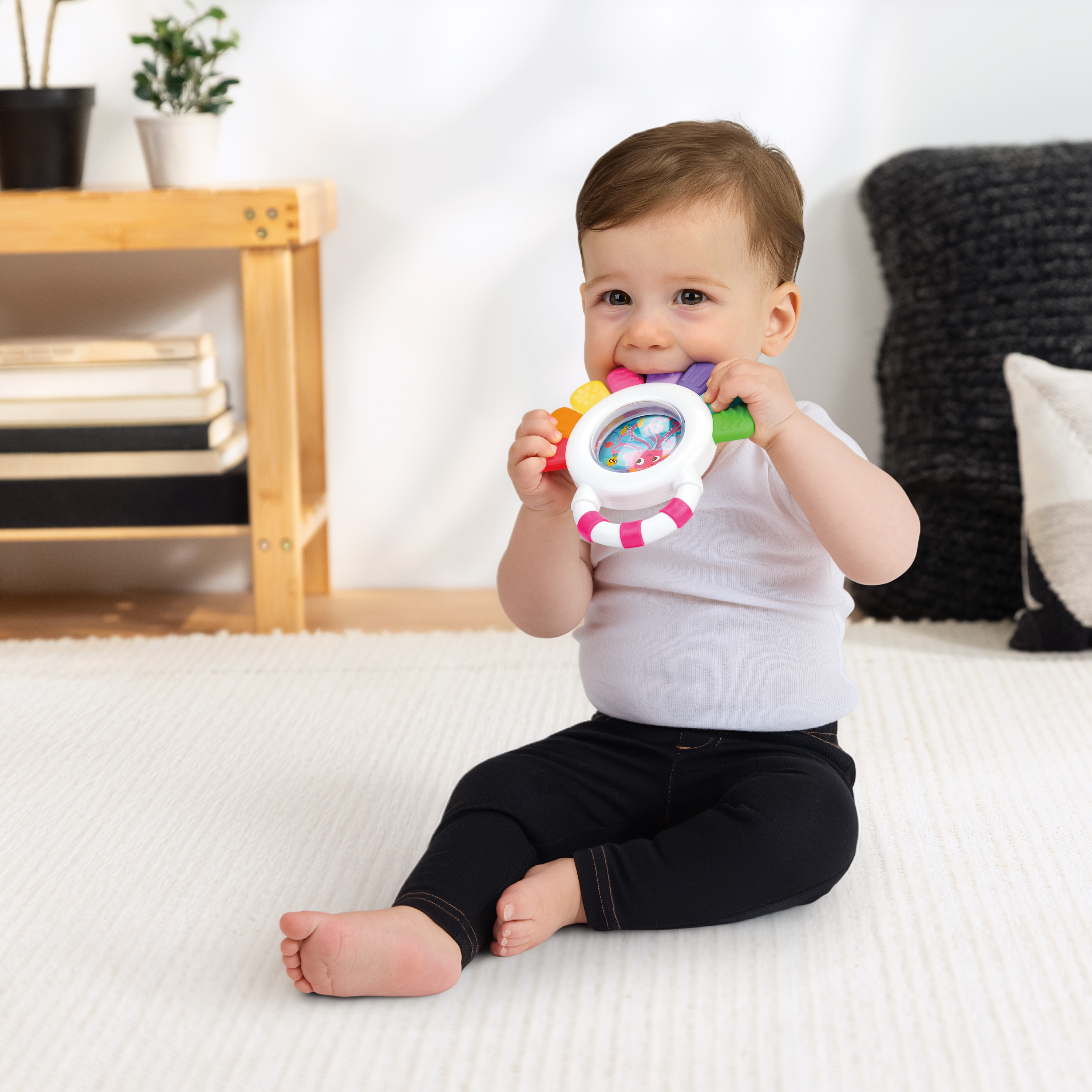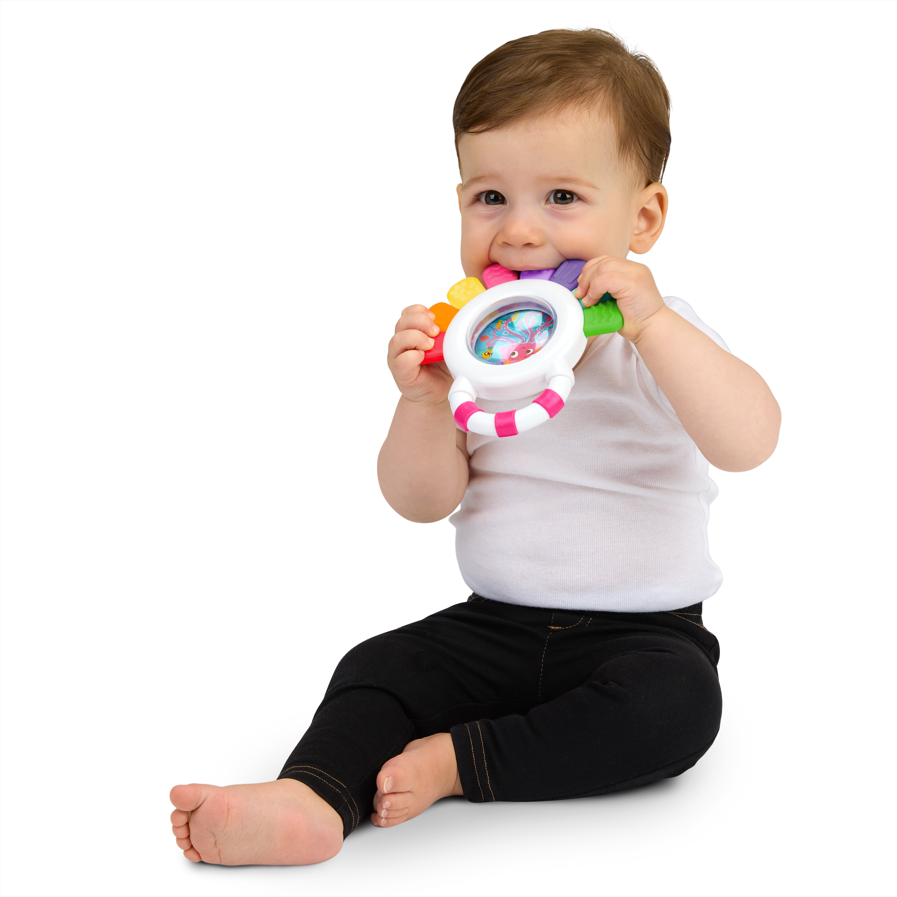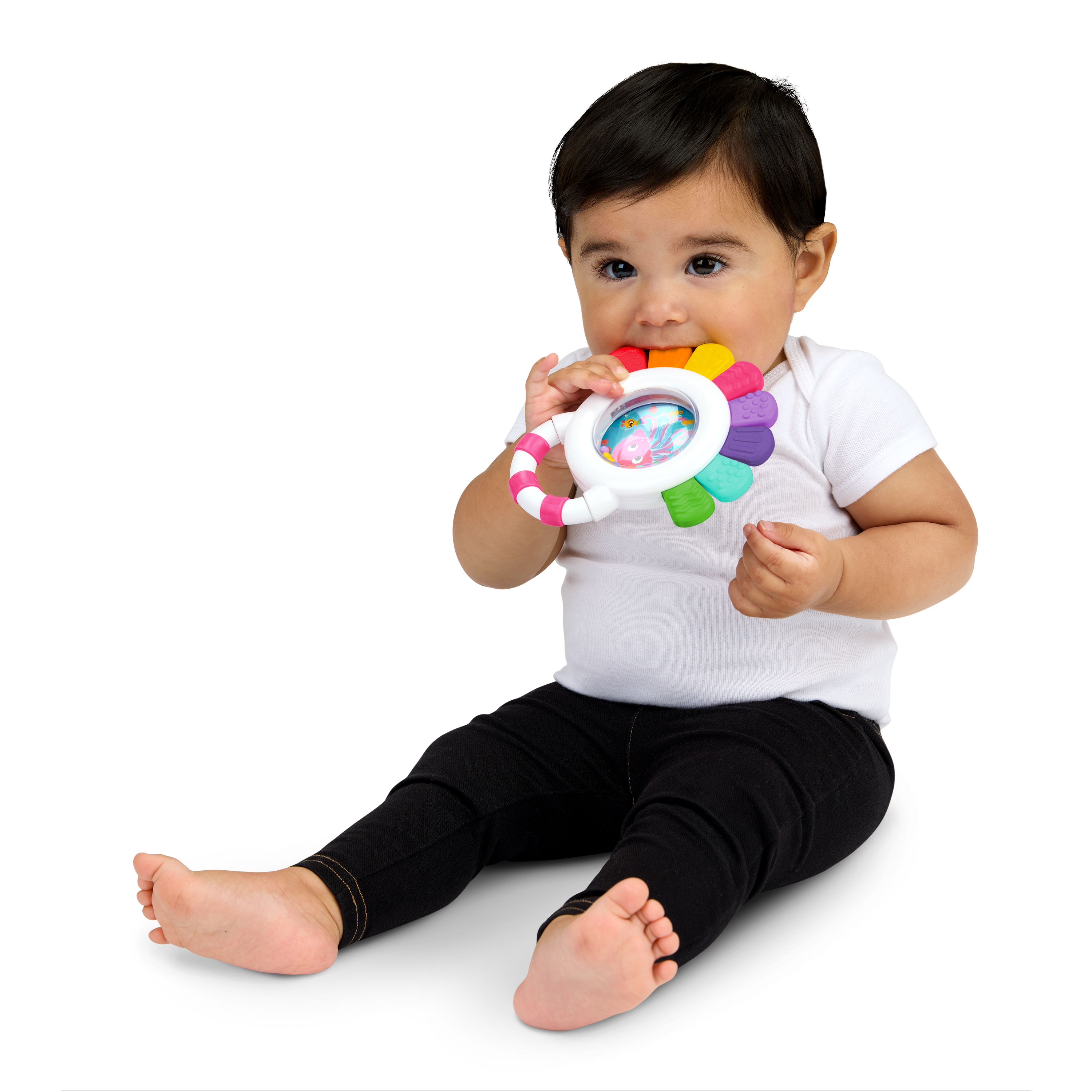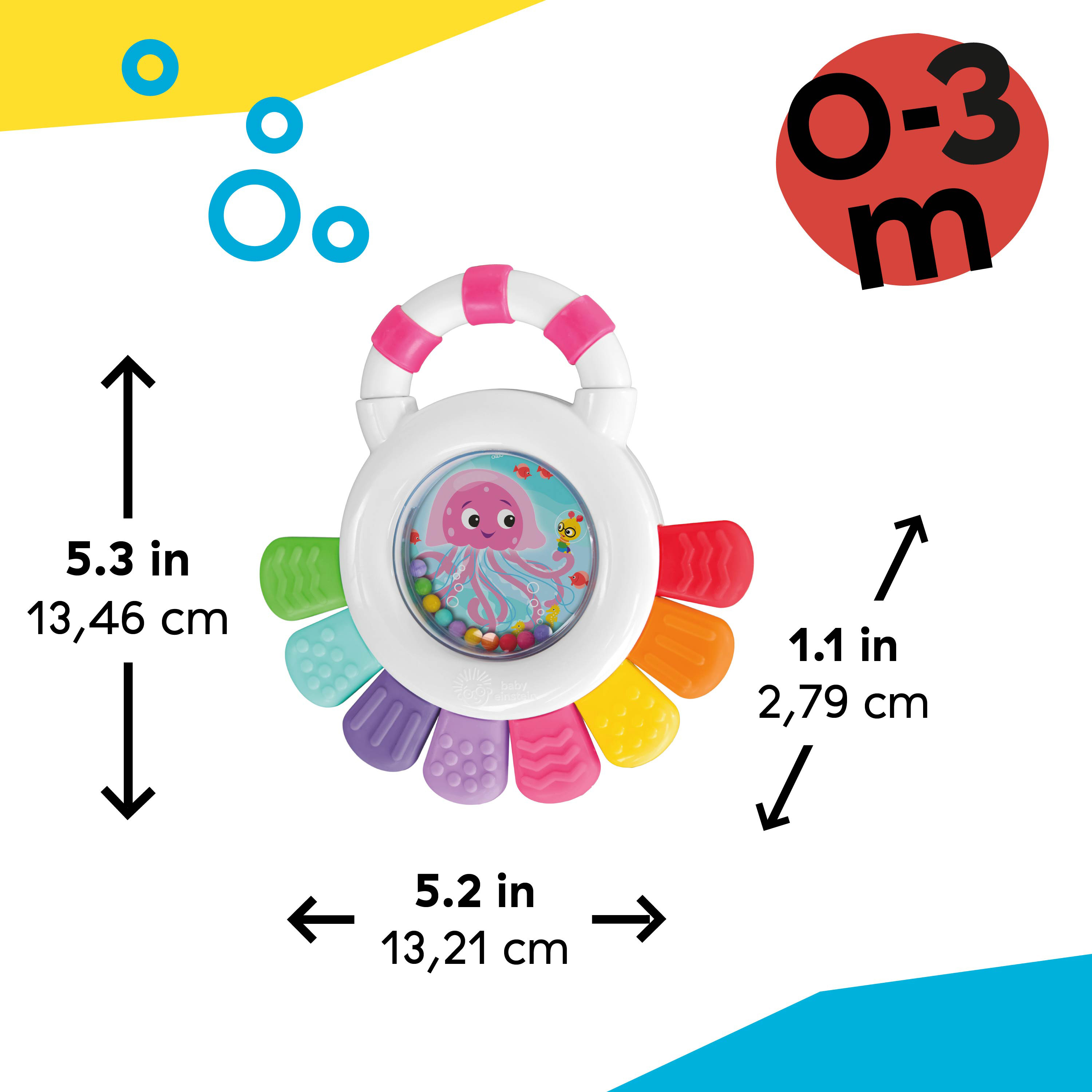 - Multi-sensory teether – Baby Einstein Sensational Janet Multisensory Rattle & Teether promotes sight, sound, and touch engagement with brightly colored rattle beads, and 8 teethable textures