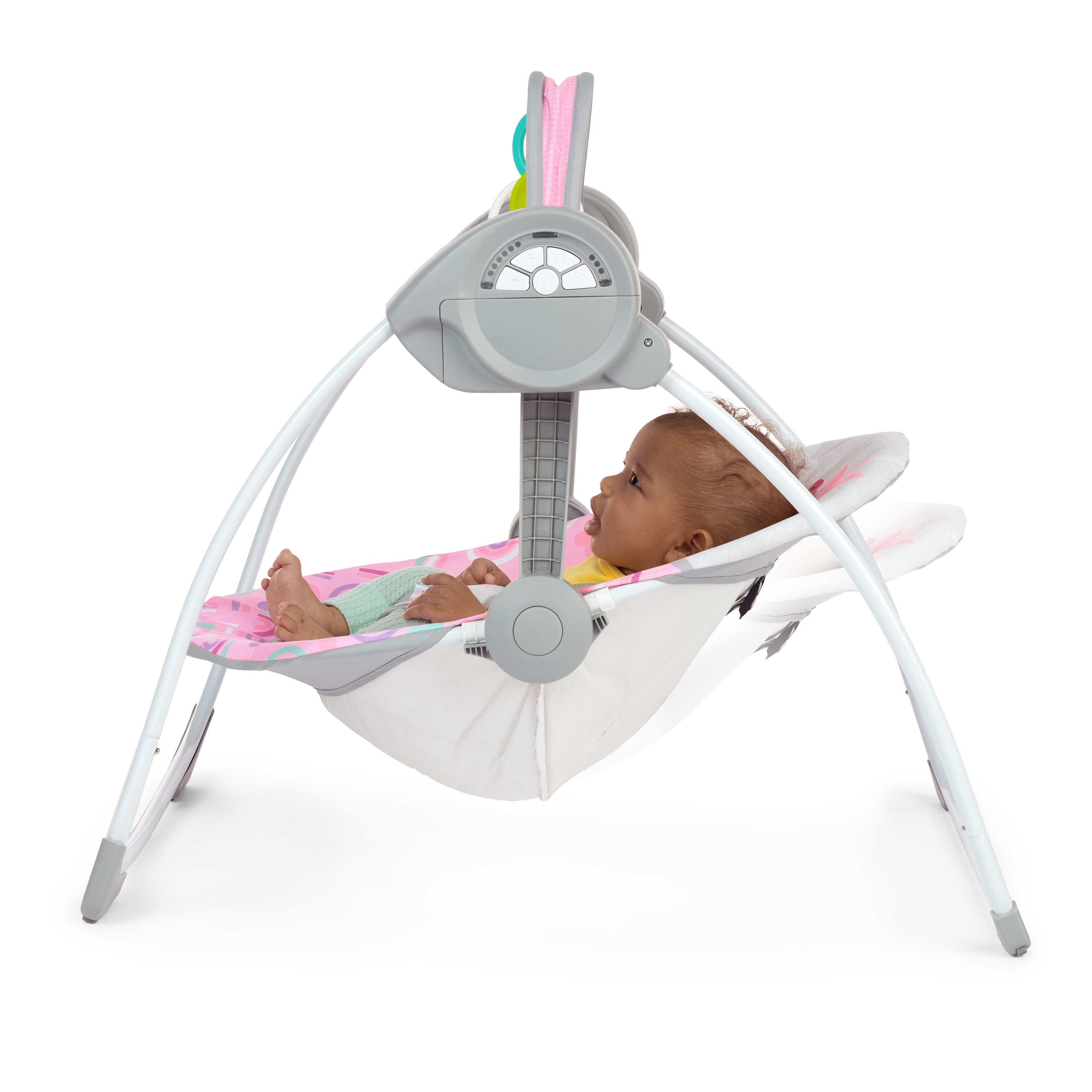 - Bright Starts Pink Paradise Portable Swing features a lightweight & foldable design for storage or travel; easy to carry when on the go
