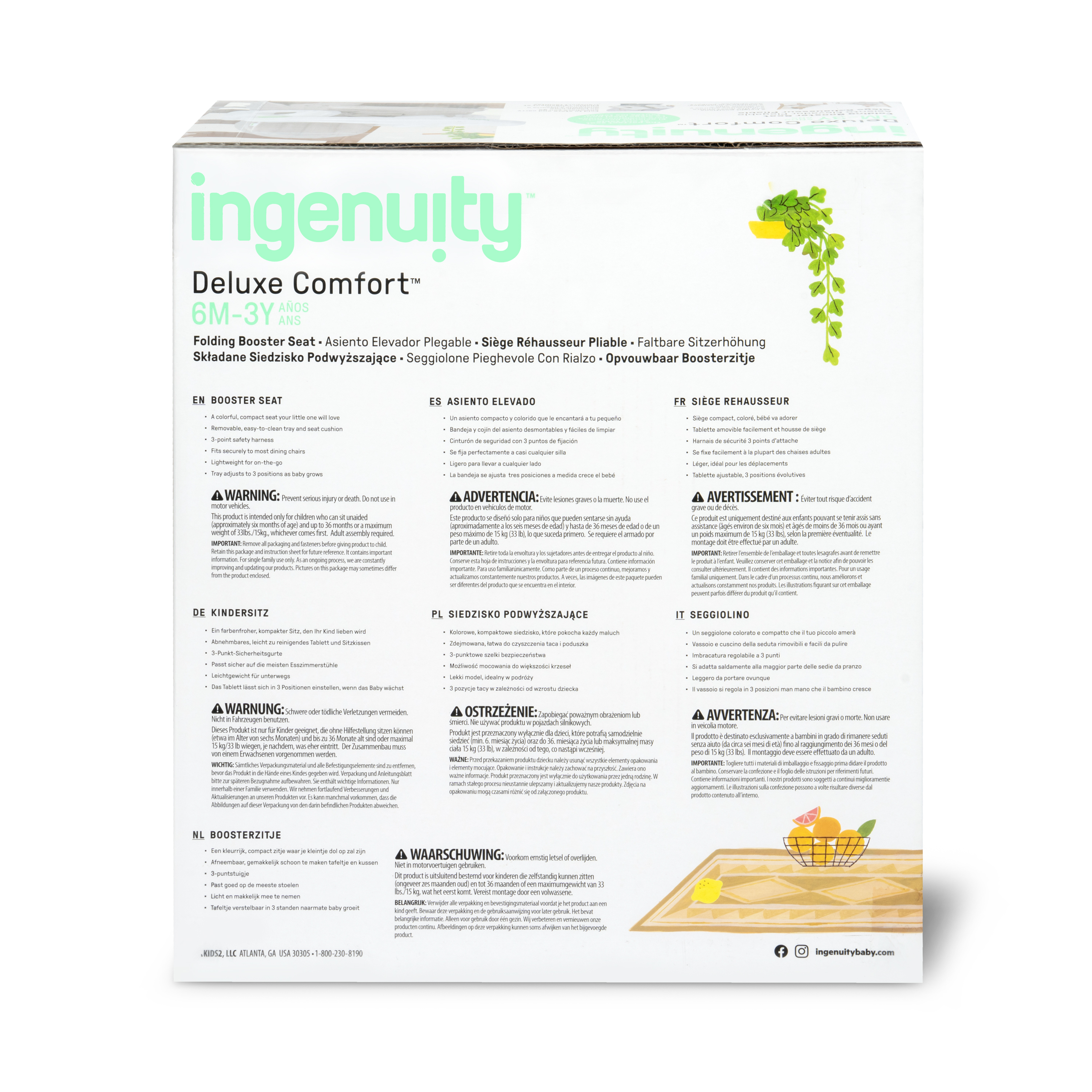 - The Deluxe Comfort booster offers adjustable height positions, allowing it to grow with baby from 6 months all the way to 3 years old